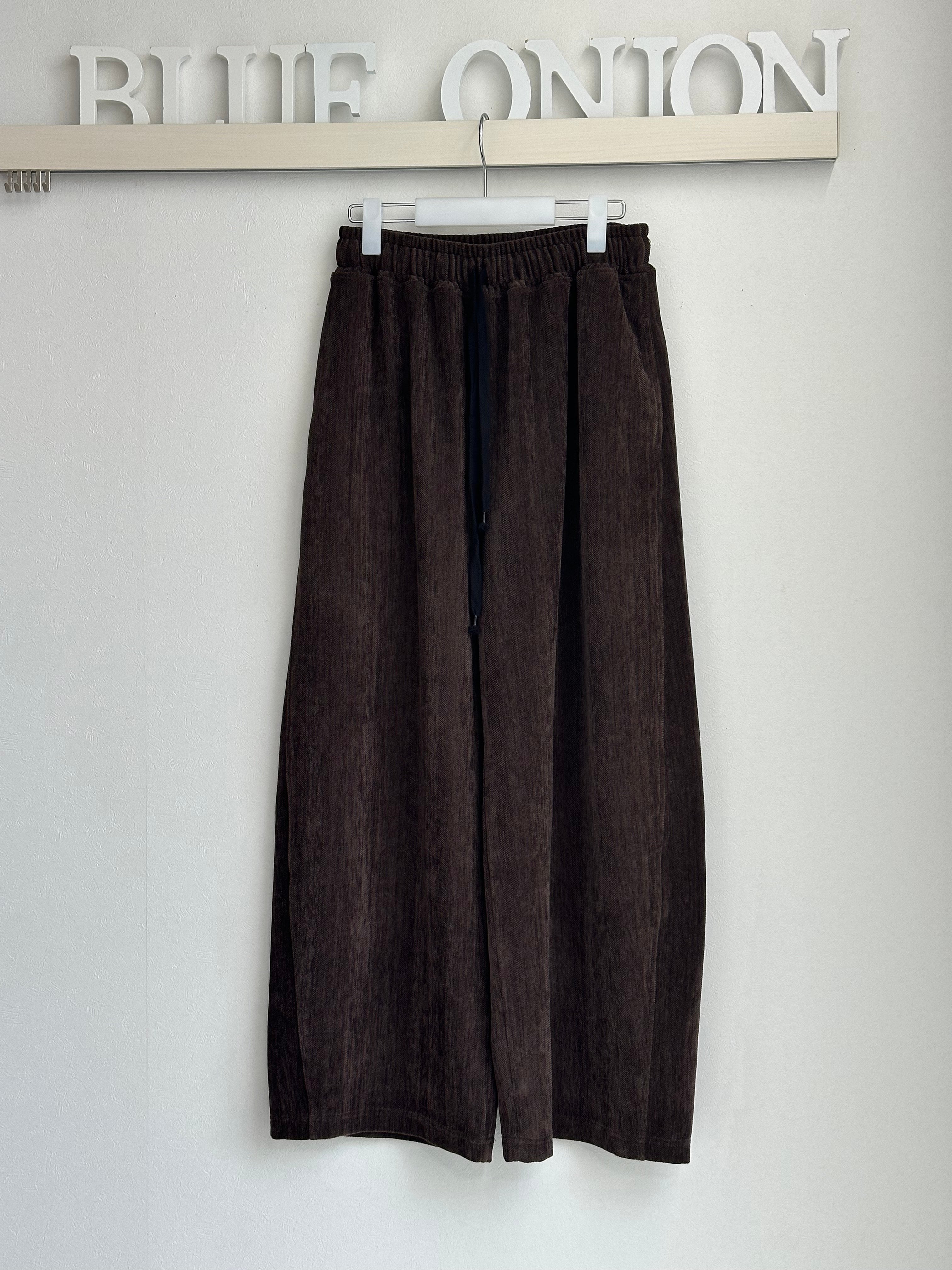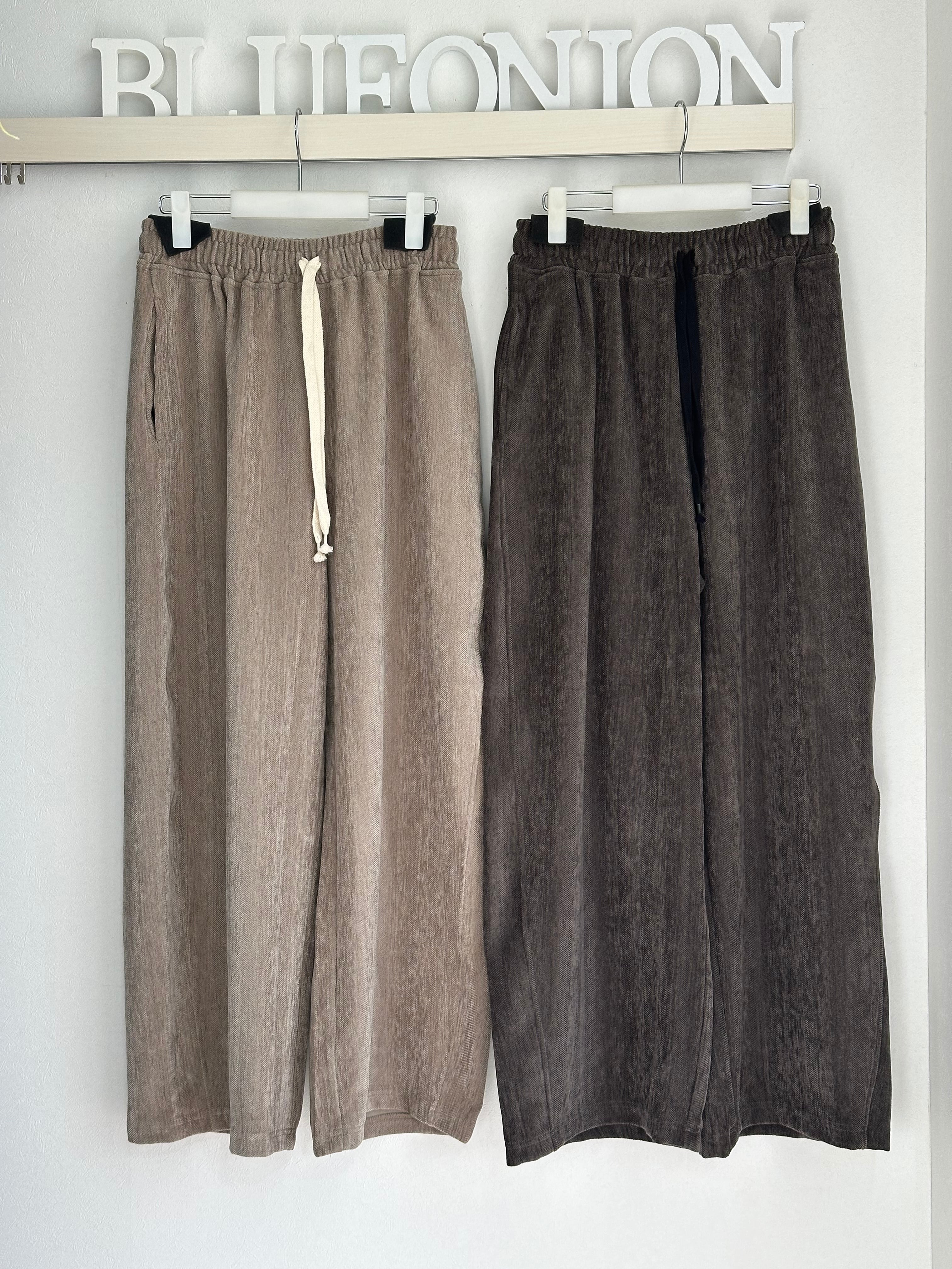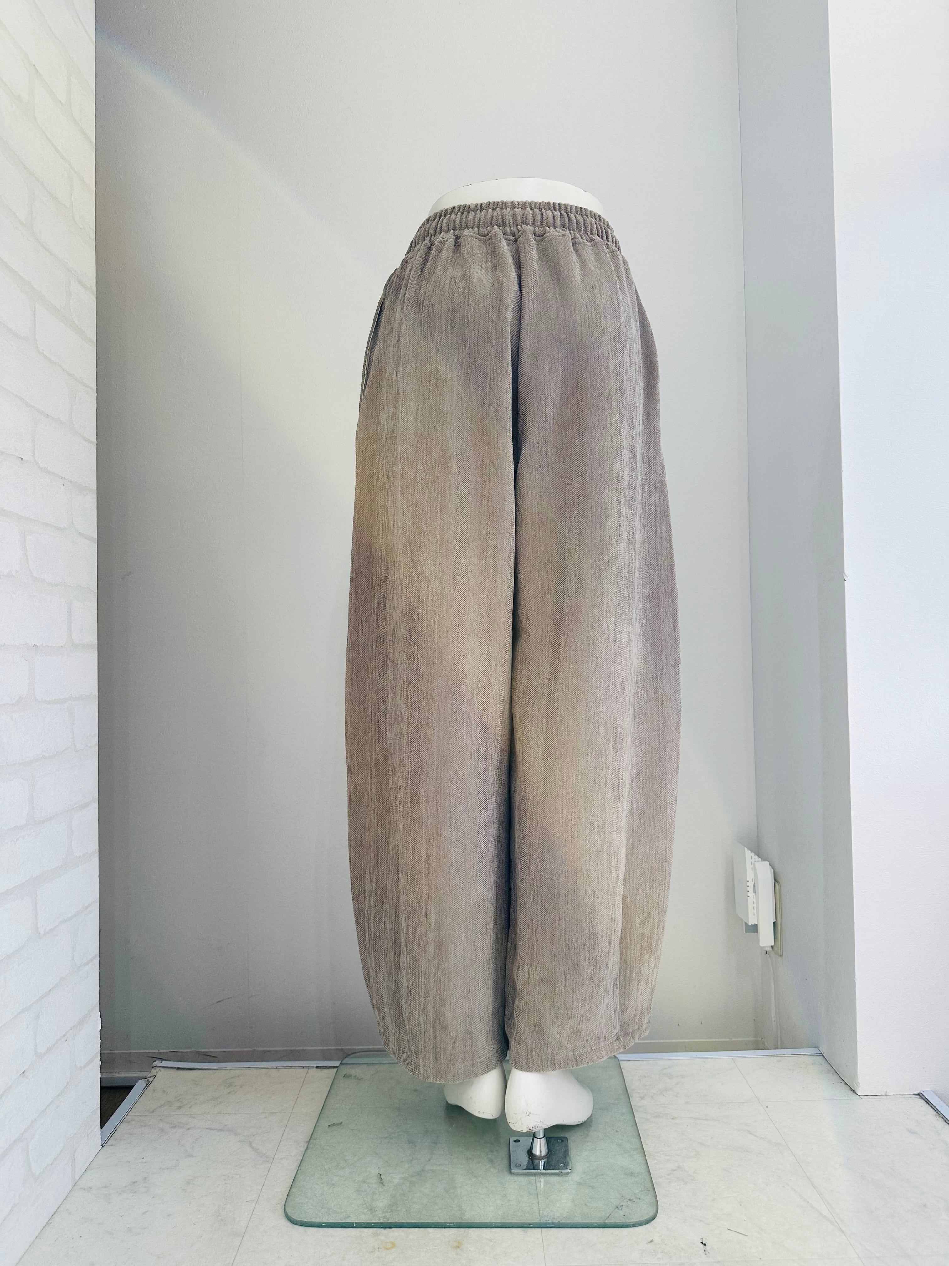 秋冬らしい暖かみのあるイージーコクーンパンツです。コーデュロイに見える起毛の素材はヘリンボーン柄になっていて今年らしい雰囲気。
