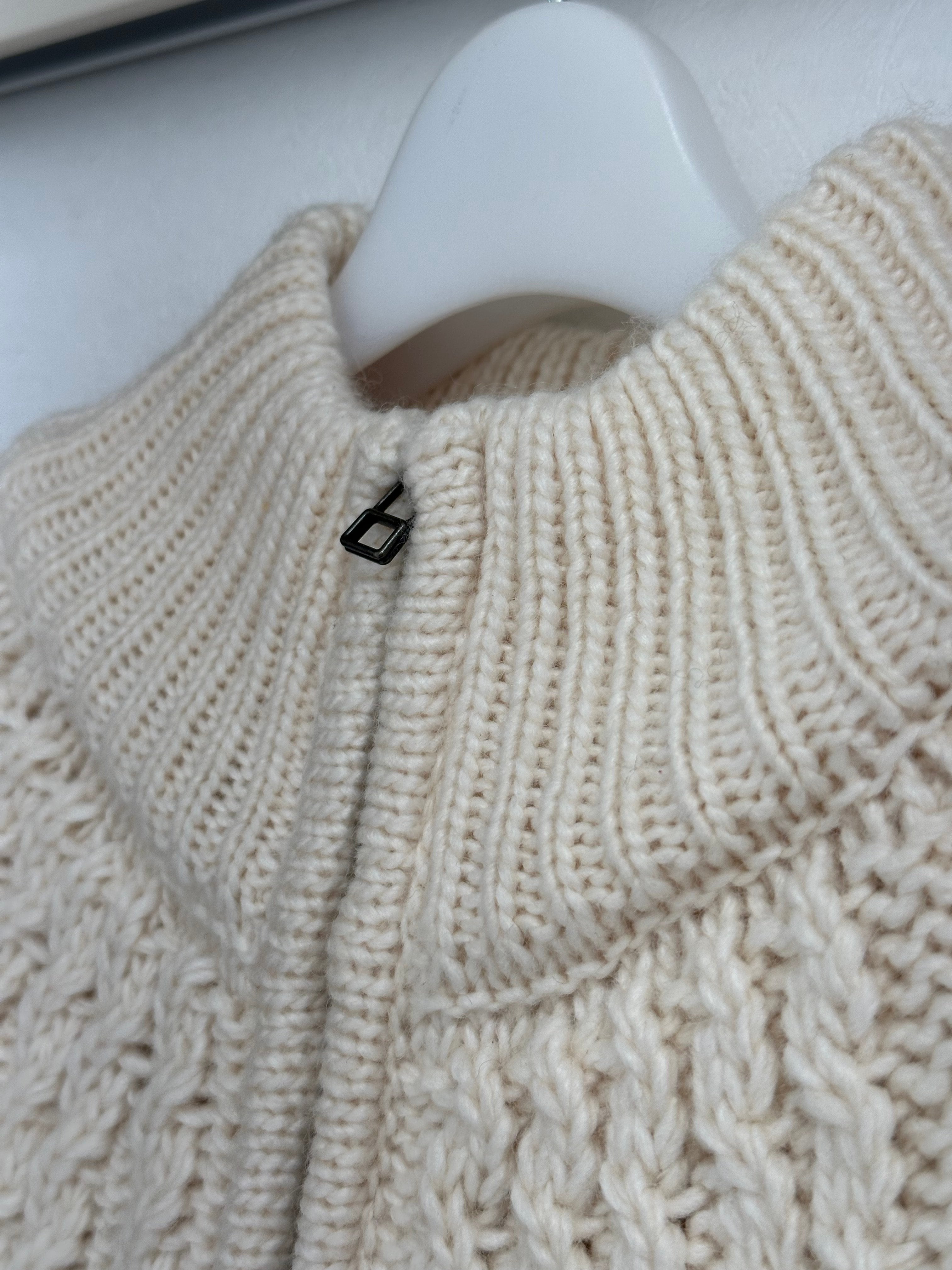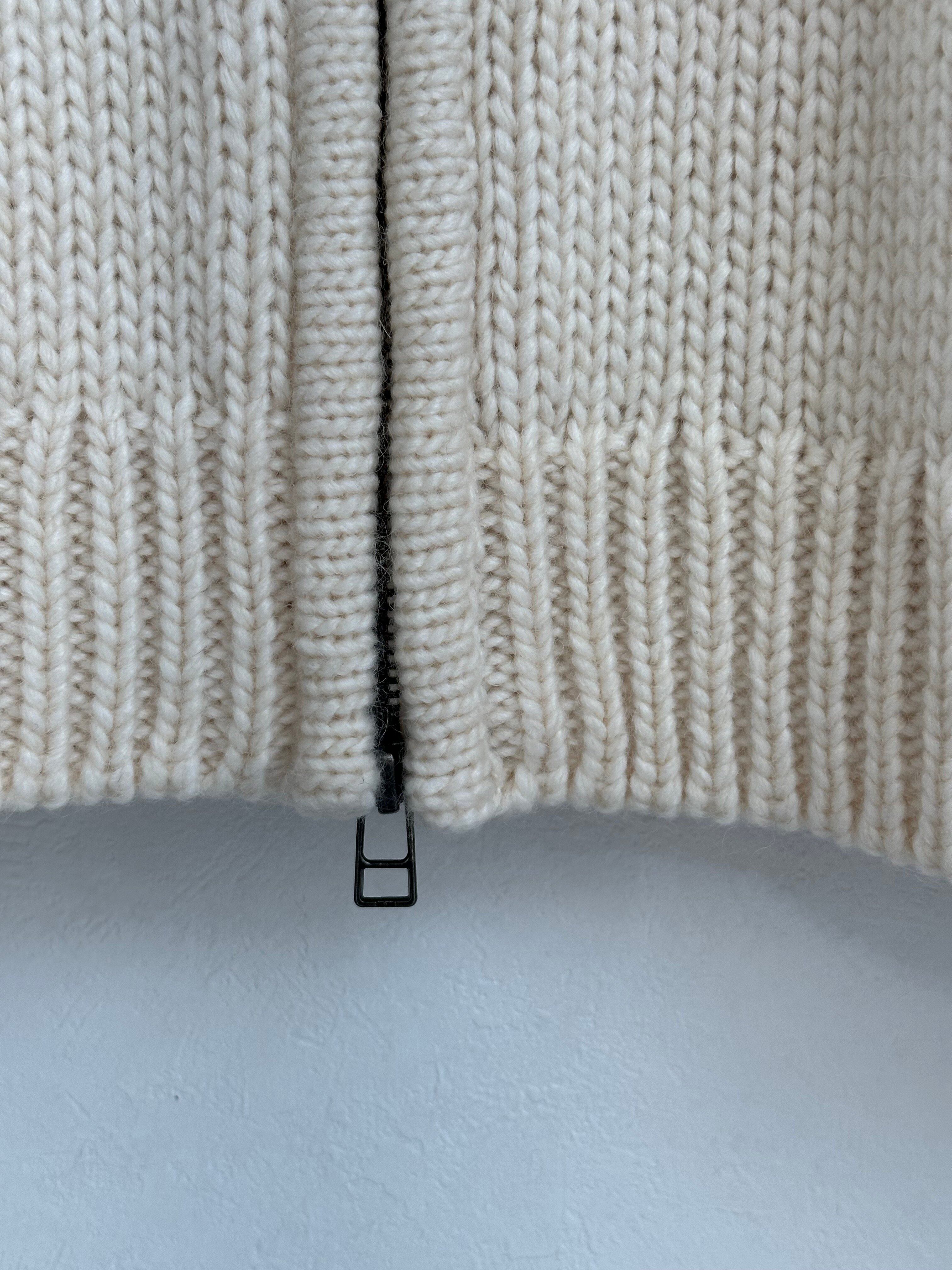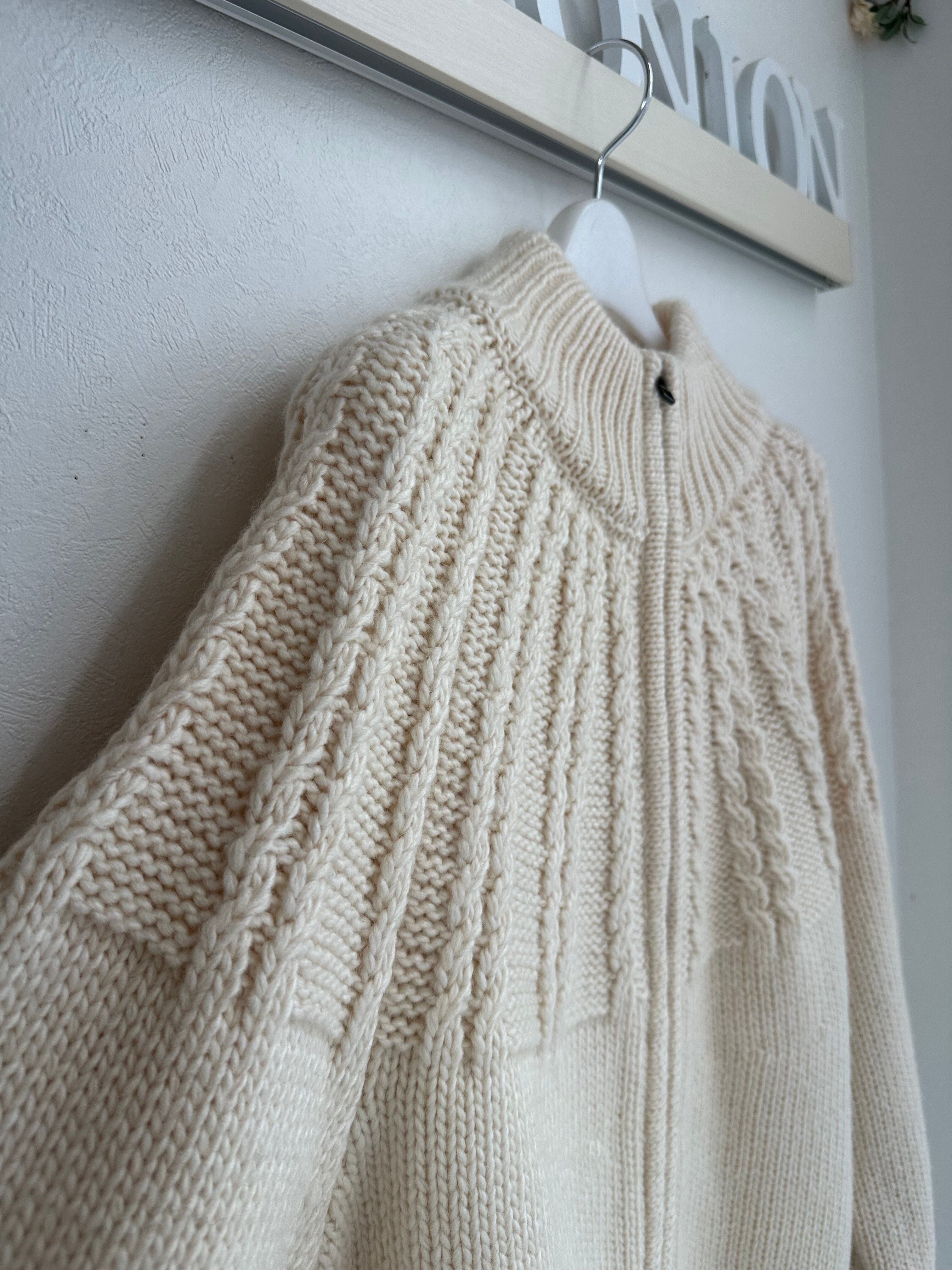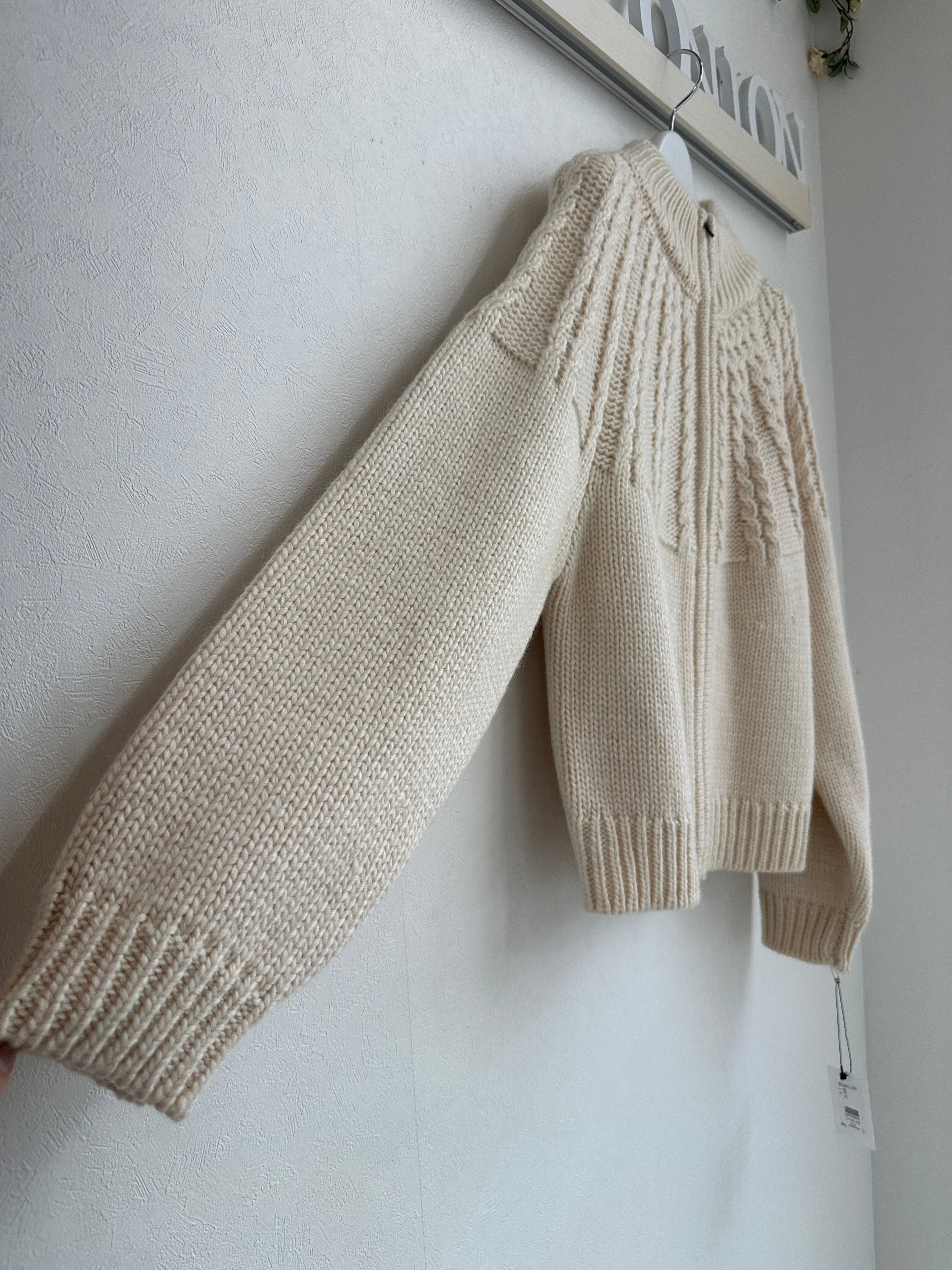 ロービングヤーンを引き返し編みで、上部のみケーブル柄に編み立てた、タートルネックのニットブルゾン