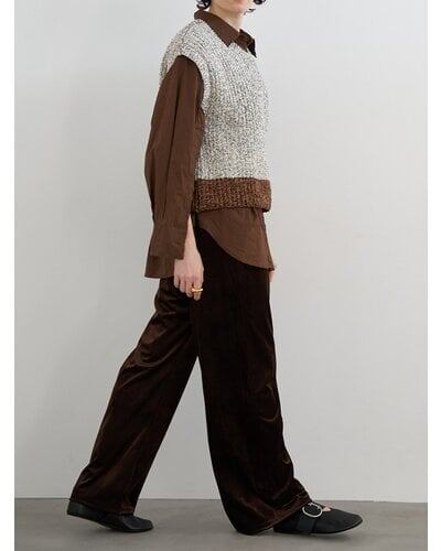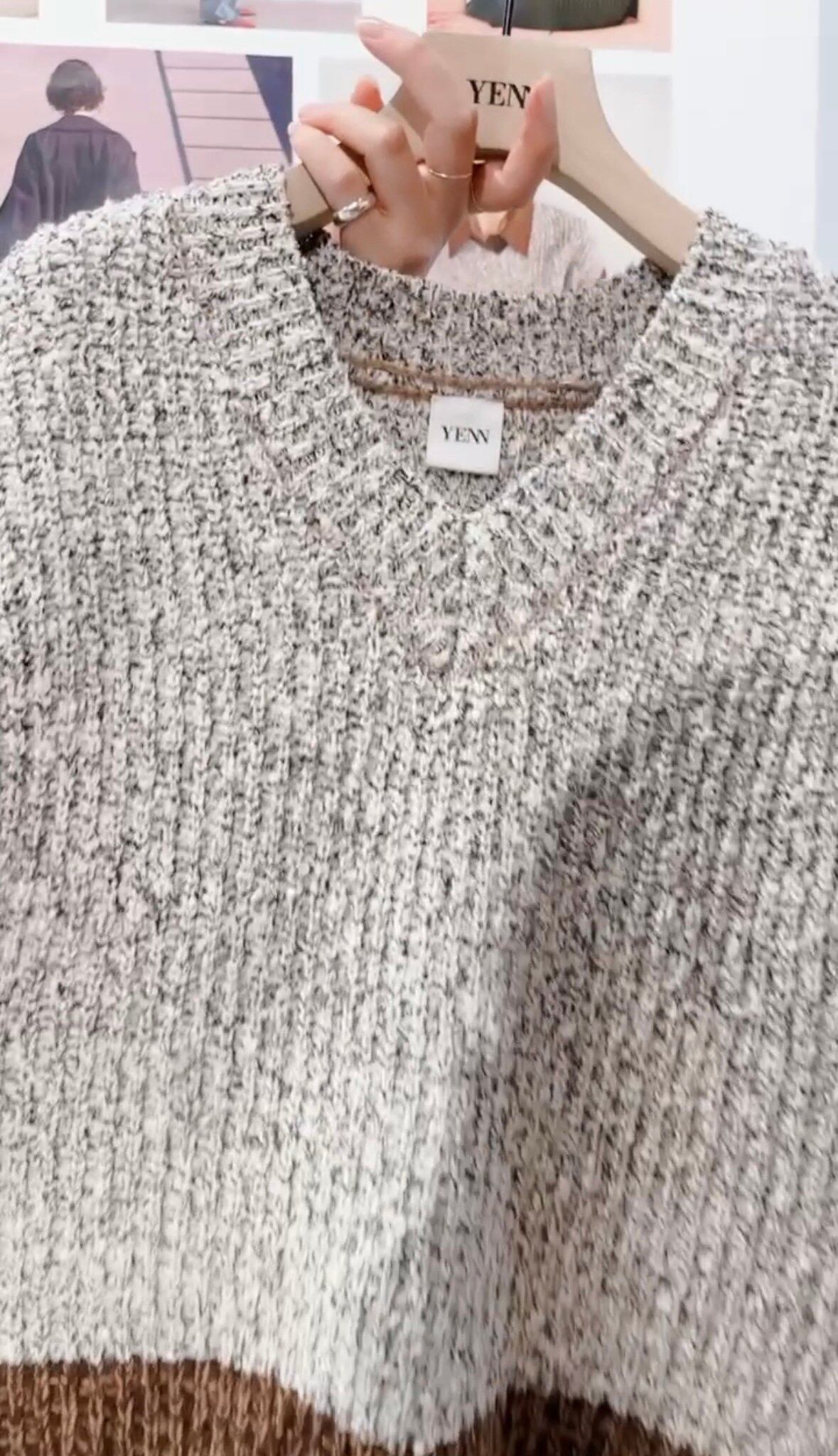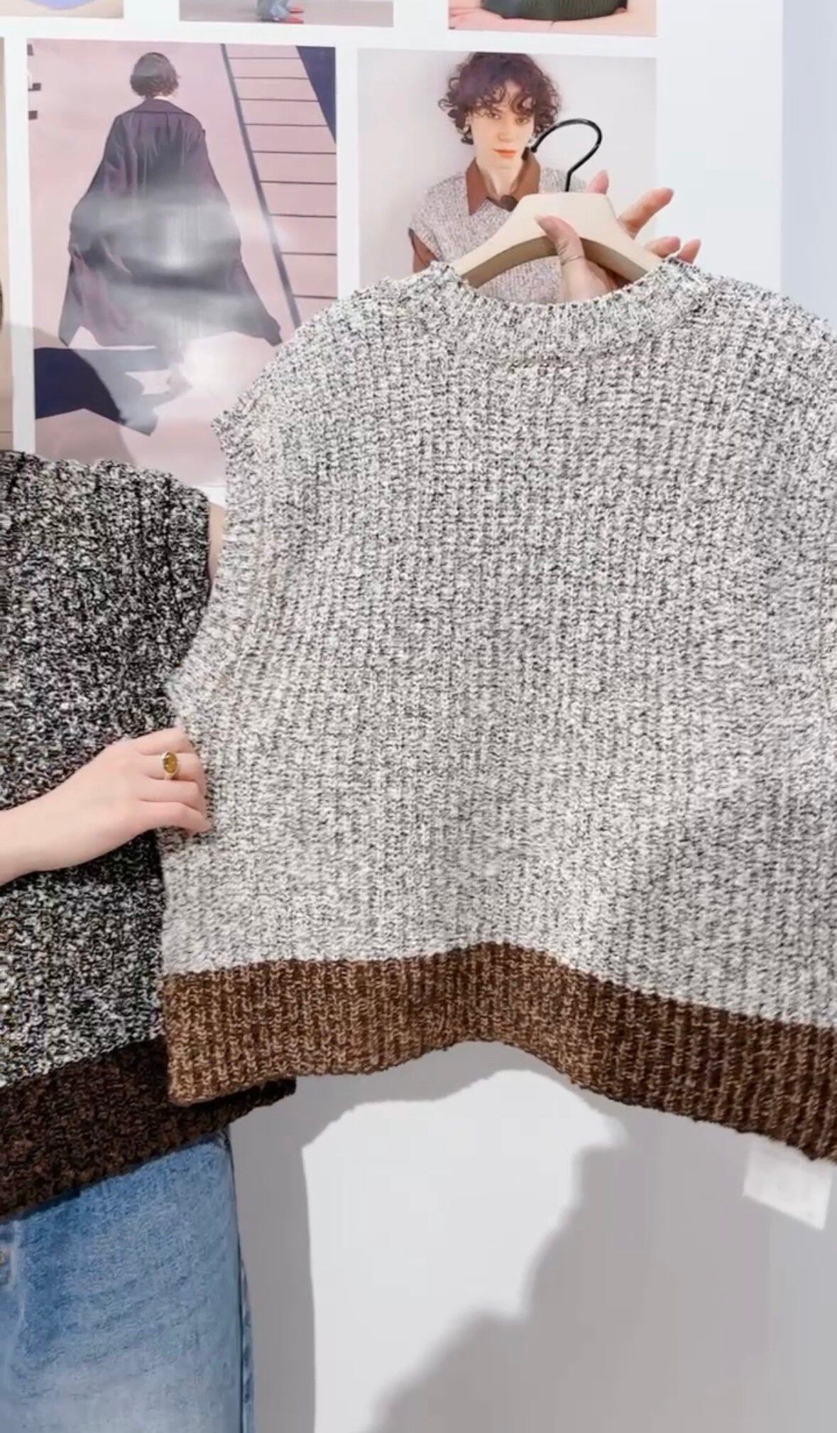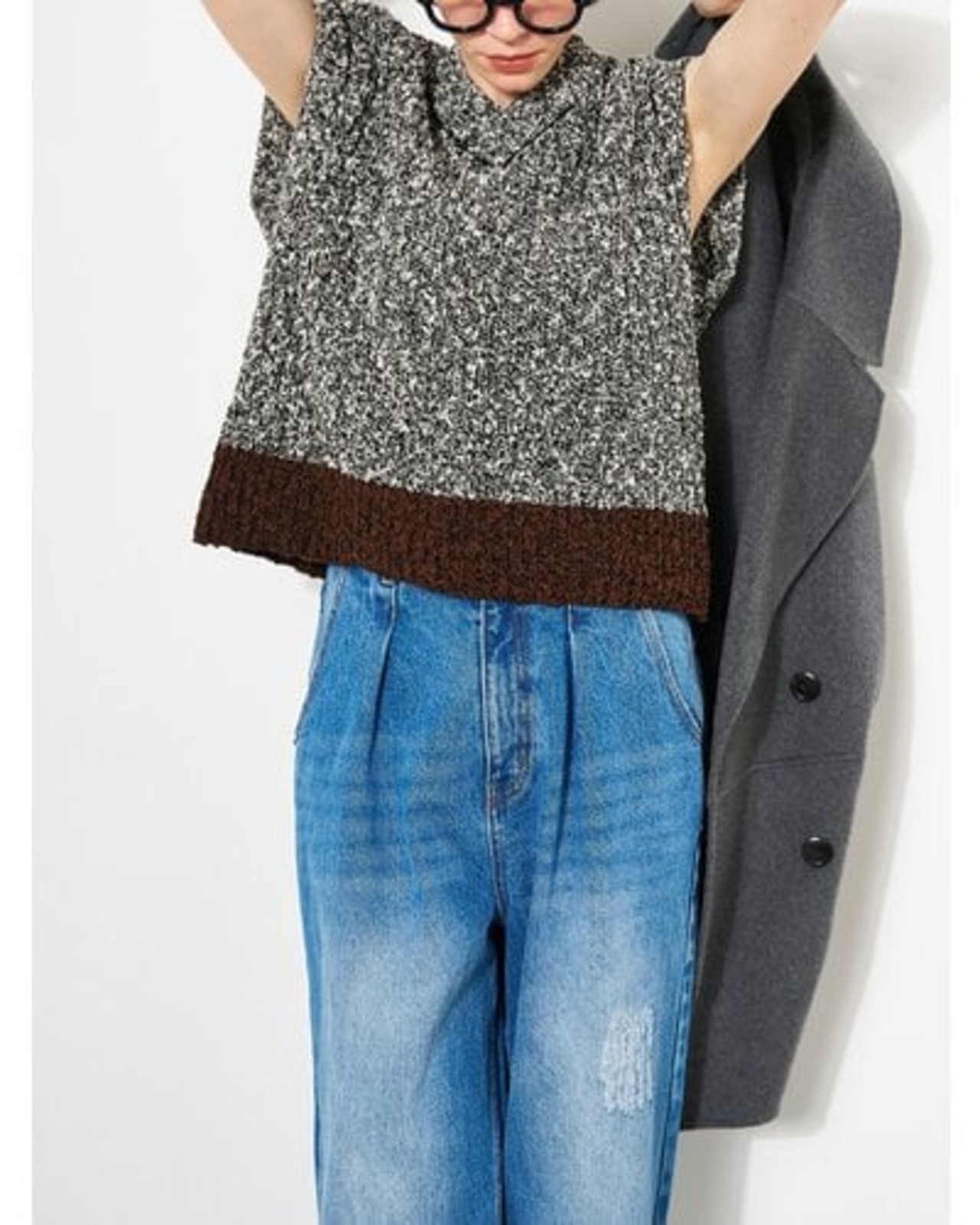 太めのリリーヤーンと、凹凸のあるネップヤーンを使用。ポコポコした表面感がポイントのカジュアル感のある素材に仕上げています。裾はブラウン系のMIXカラーで切り替えたバイカラーのデザインを採用。衿とアームホールのリブのリンキングに配色の糸を使用。全体的に配色デザインを施している、遊びのあるアイテムに仕上げています。
