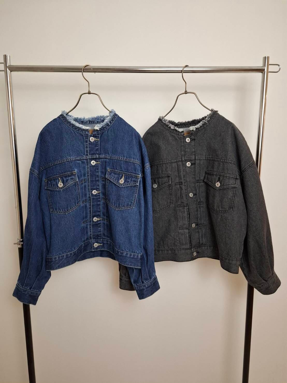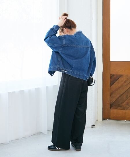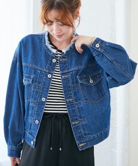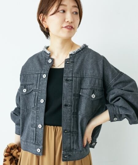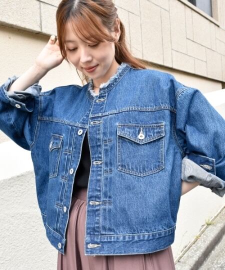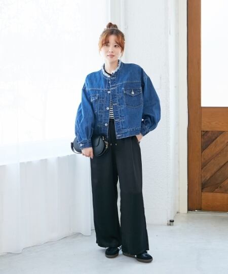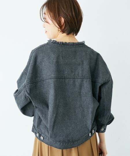 メンズライクになりがちなGジャンをノーカラーで柔らかな雰囲気に仕上げた1枚。