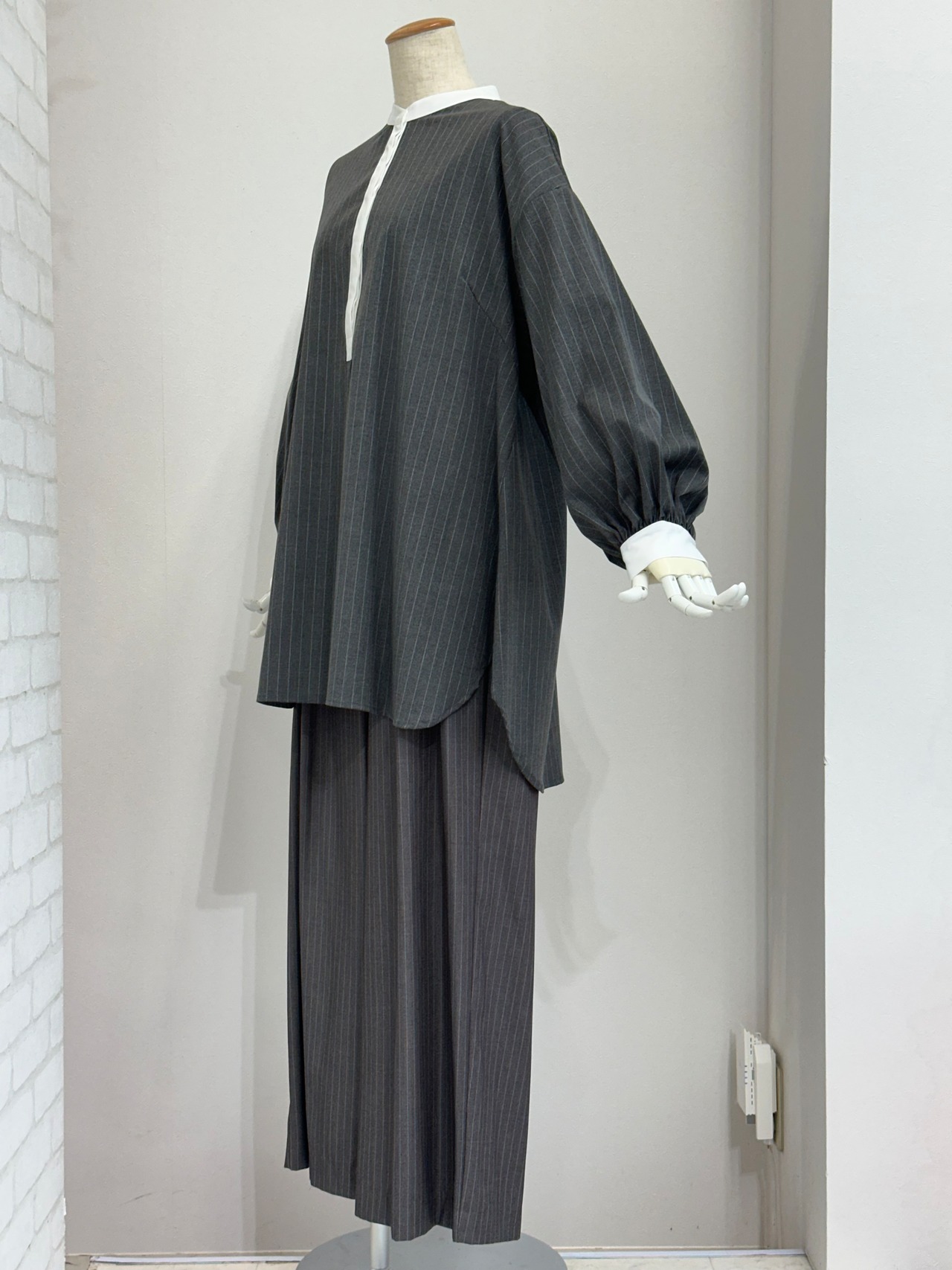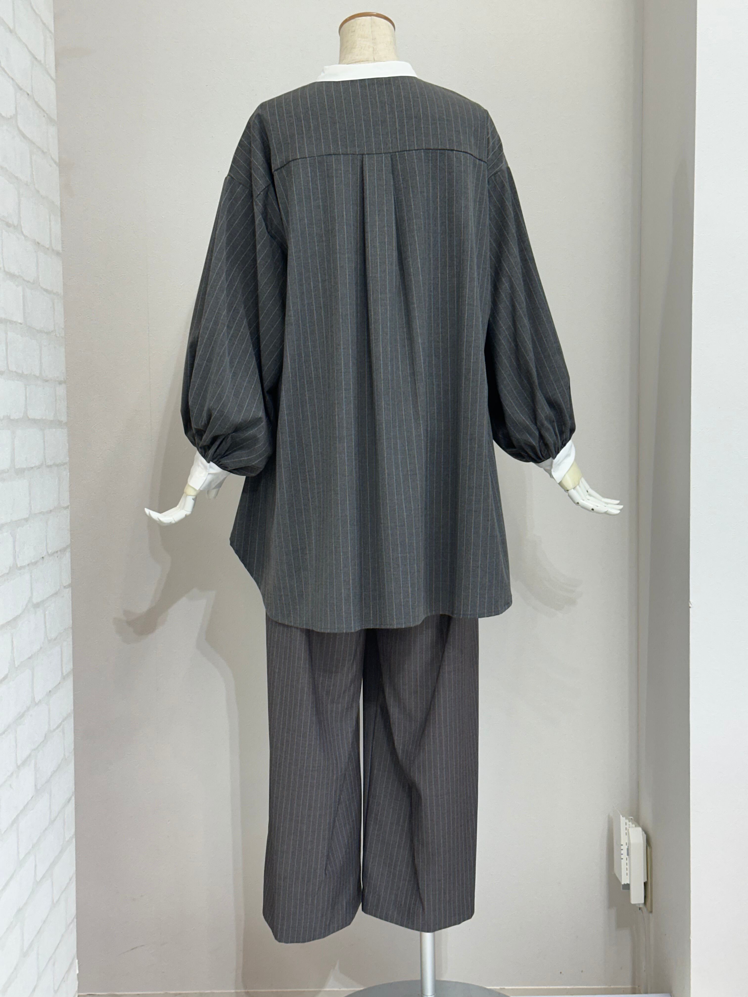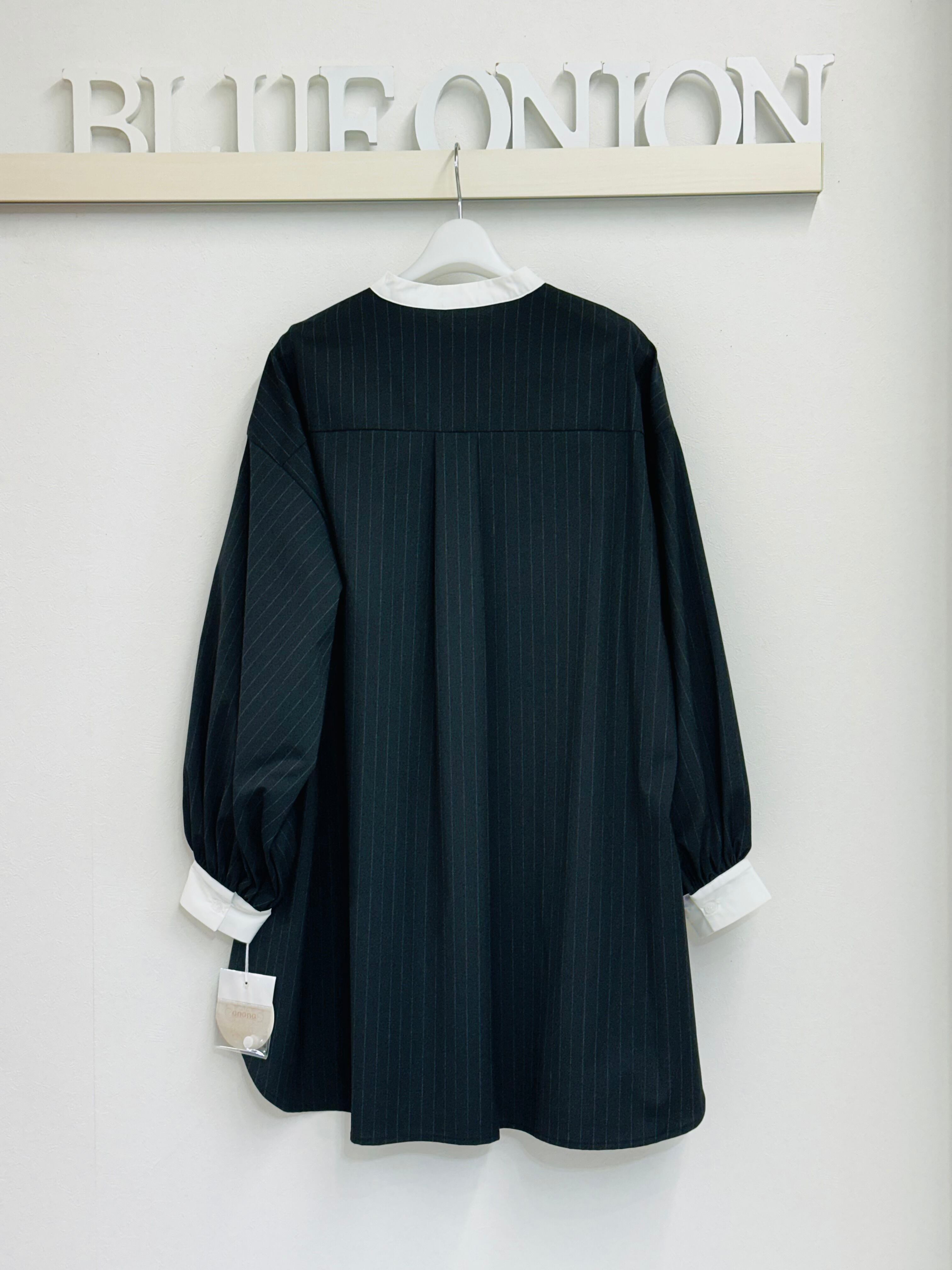 このシャツチュニックは、バンドカラーのデザインが特徴で、上品さとトレンド感を演出。ピンストライプのストライプ柄が目を引き、洗練された印象を与えます。共のパンツとセットアップ対応で、スカートやパンツと合わせて、スタイリングの幅を広げてくれます。 シンプルでありながら、個性的なデザインが魅力で、様々なシーンでの着用を楽しんでいただけるアイテムです。一枚ではもちろん、重ね着としても活躍し、秋冬のコーディネートに彩りを添えます。
