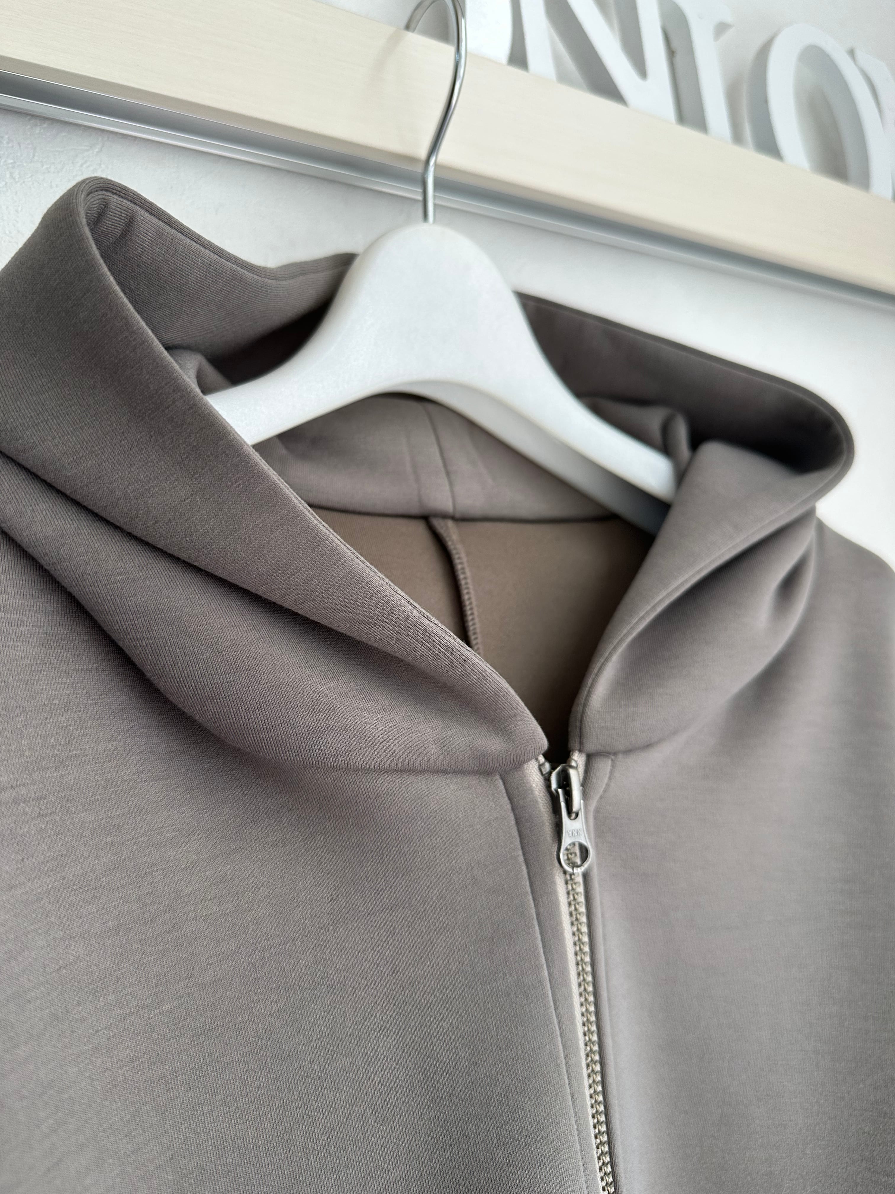 モチモチとした膨らみのあるダンボール生地を使用したジップパーカーで