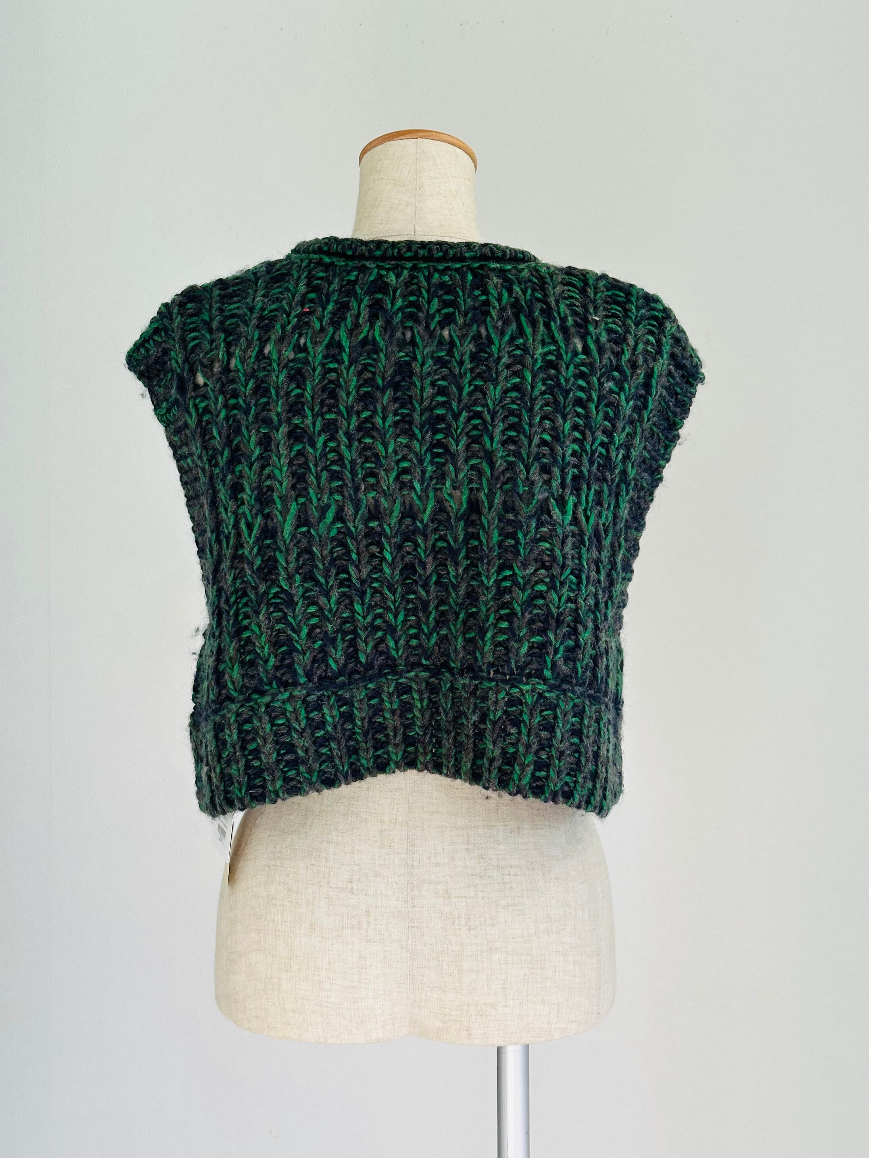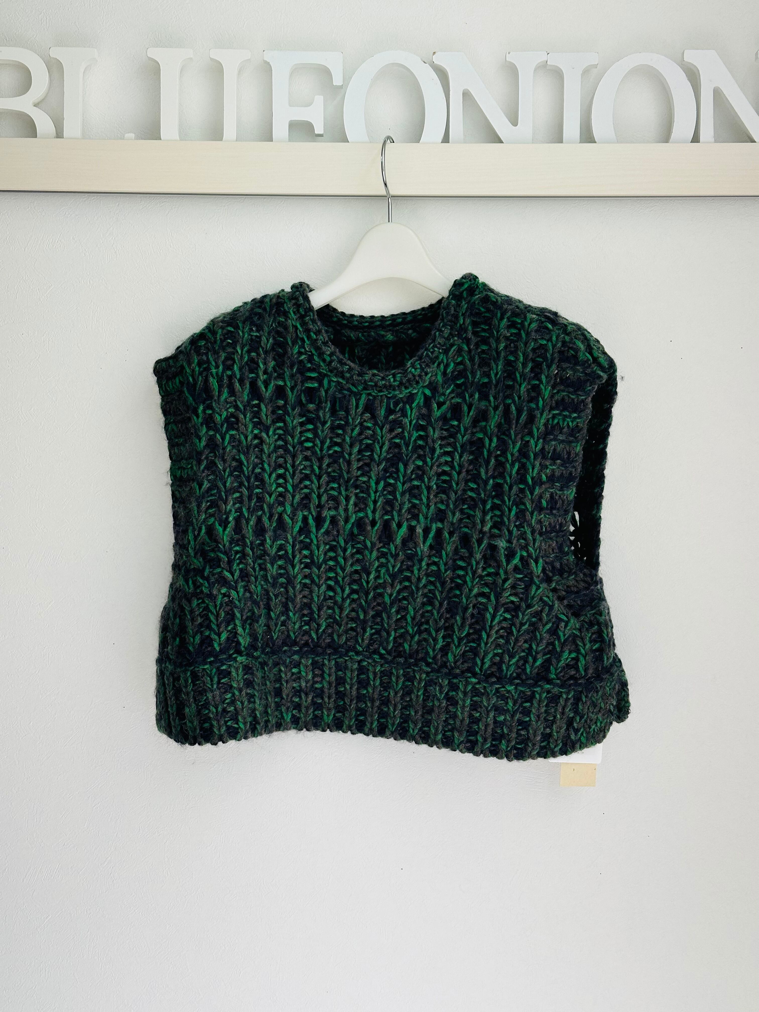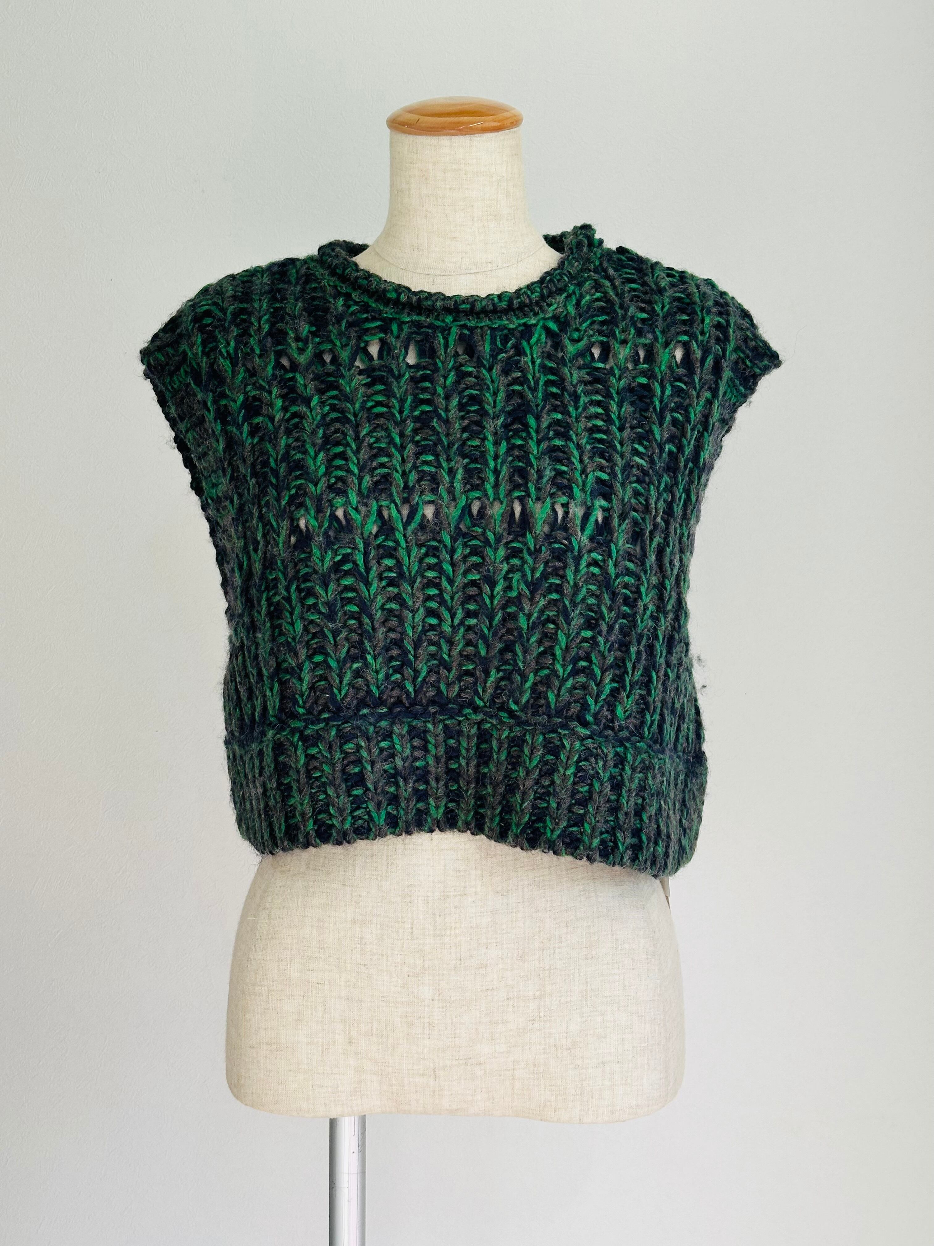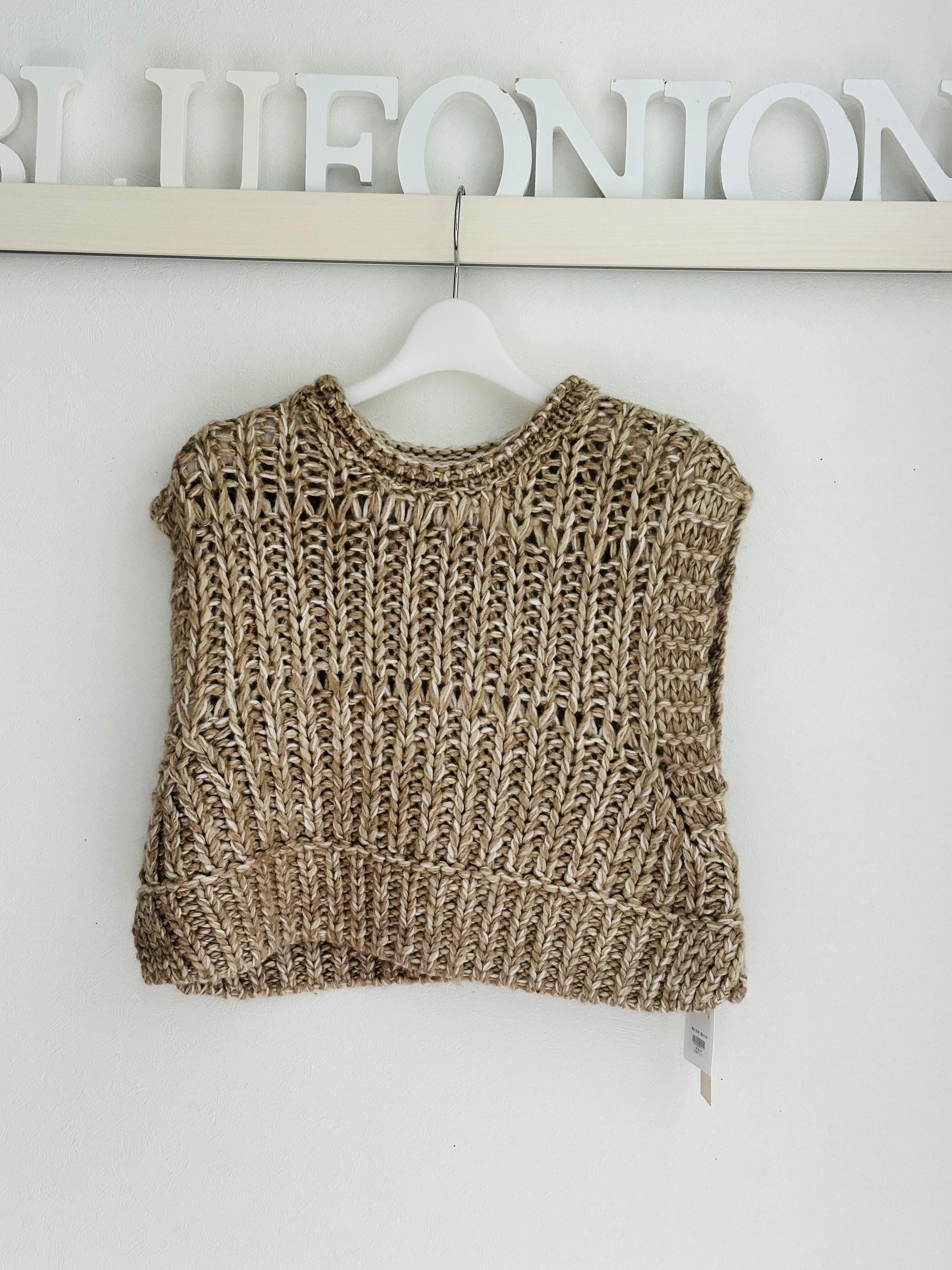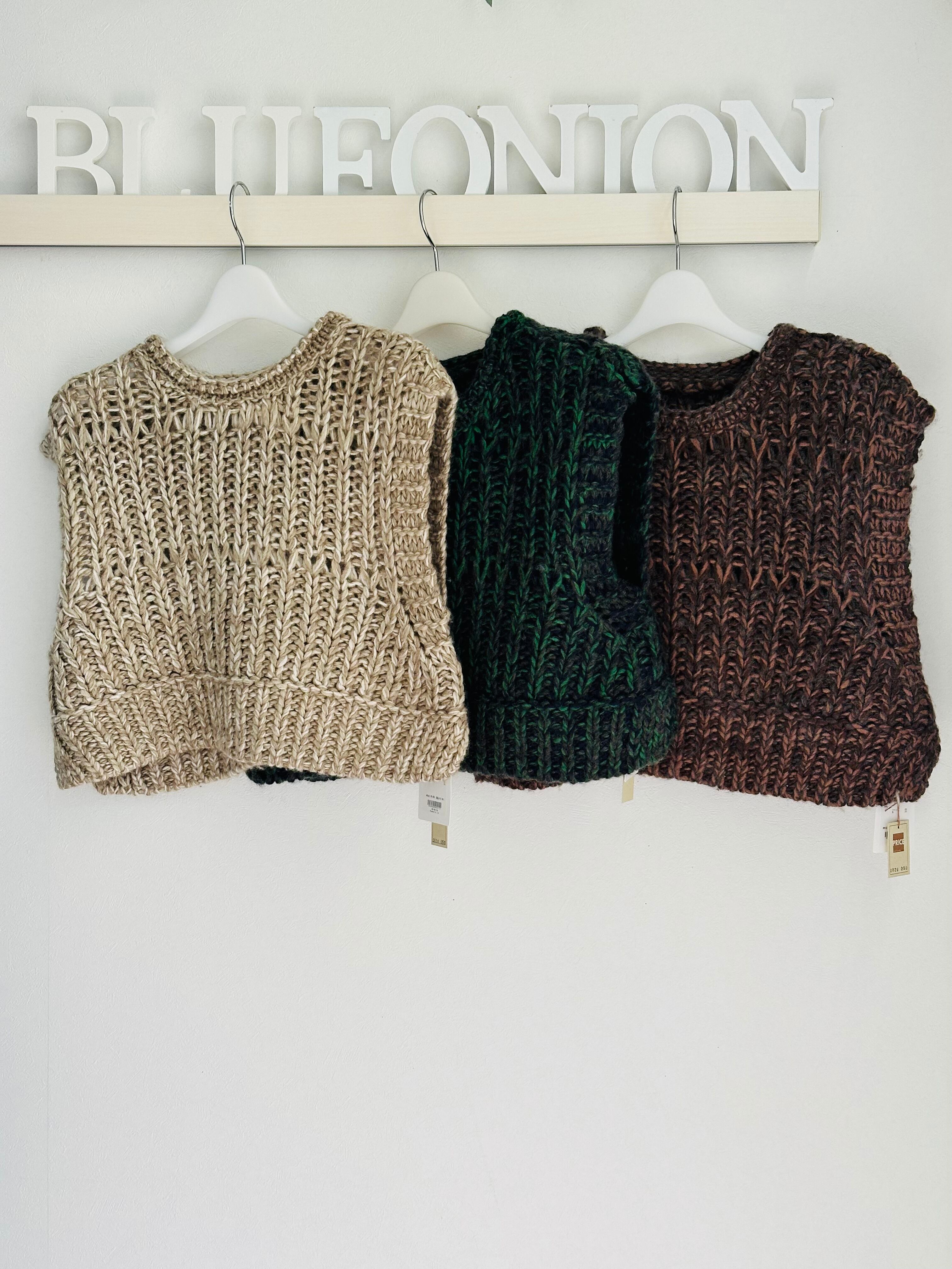 柔らかなロービングヤーンを使用したニットベストで、肌触りが心地よく、軽やかに着こなせます。