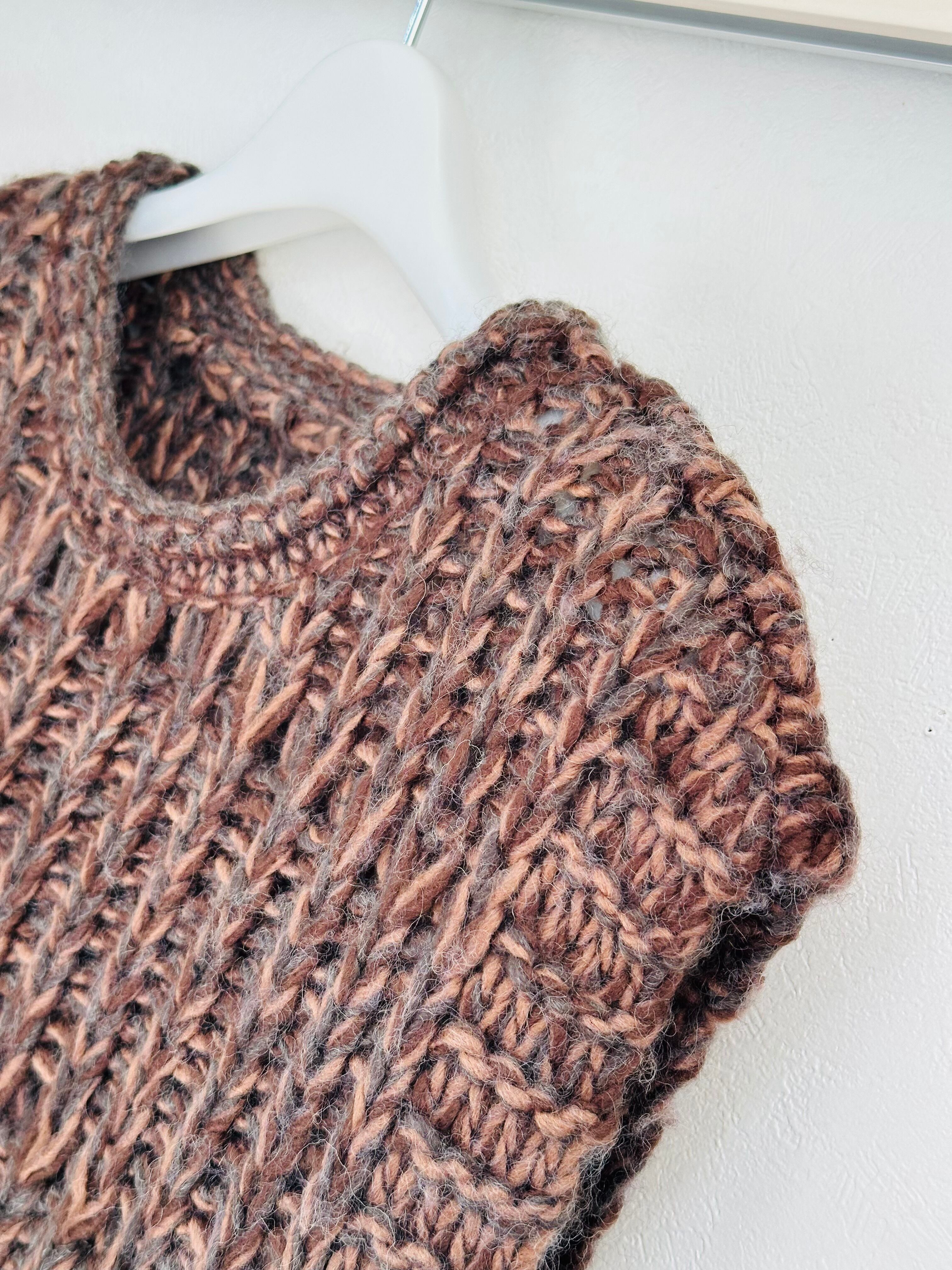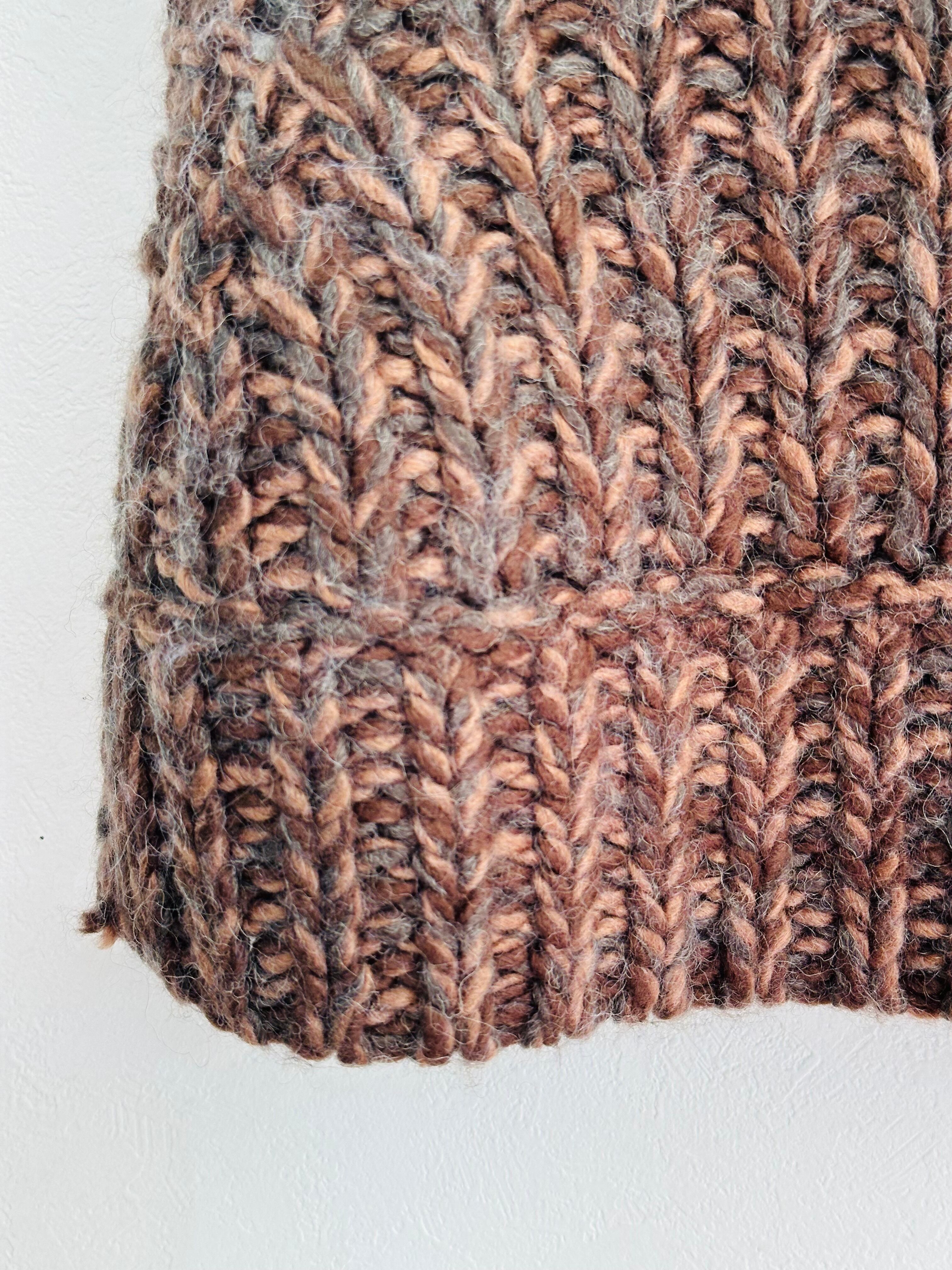 3段切り替え編みのデザインが印象的で、メランジカラーの織り交ぜが洗練されたスタイルを演出します。