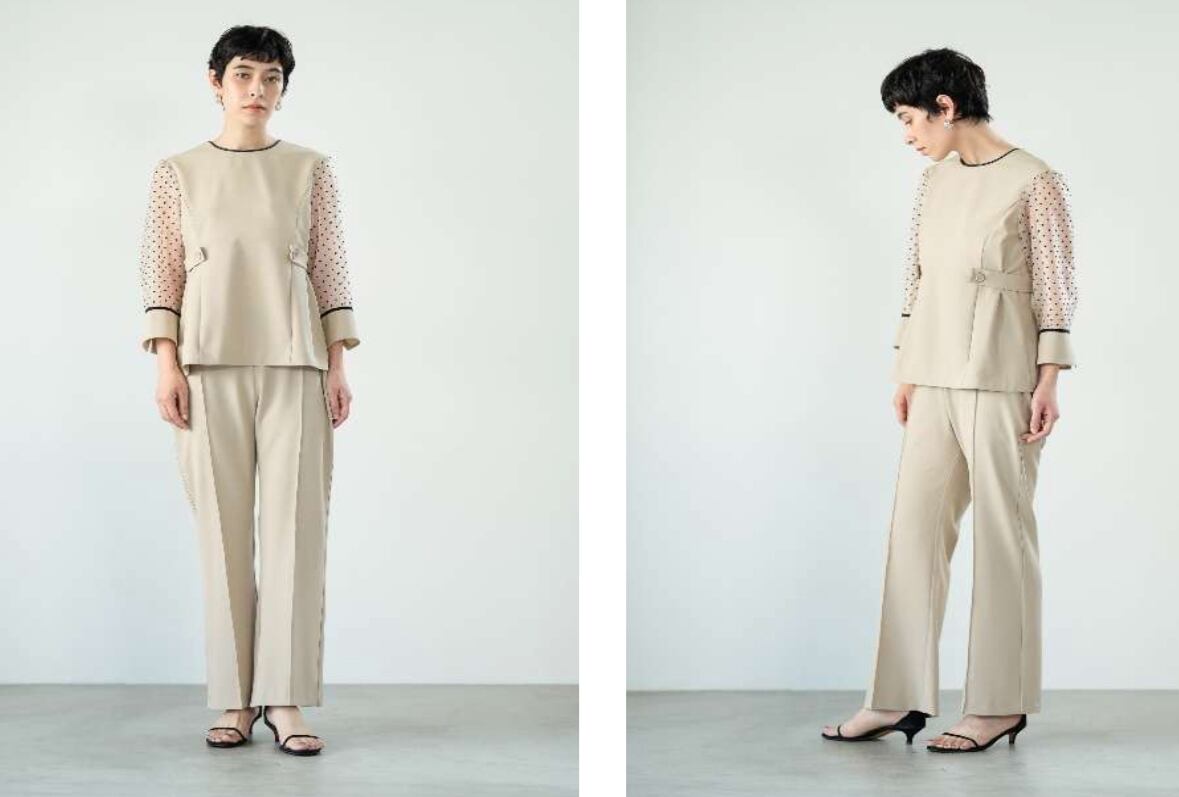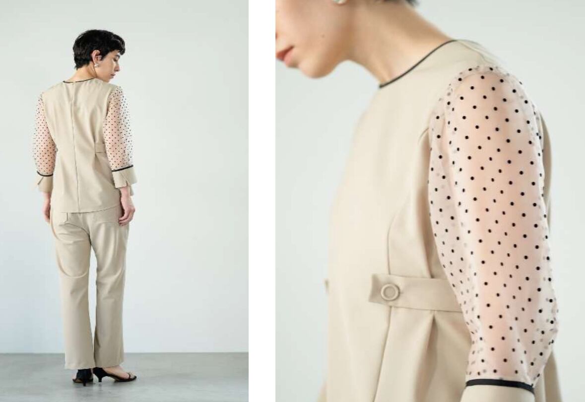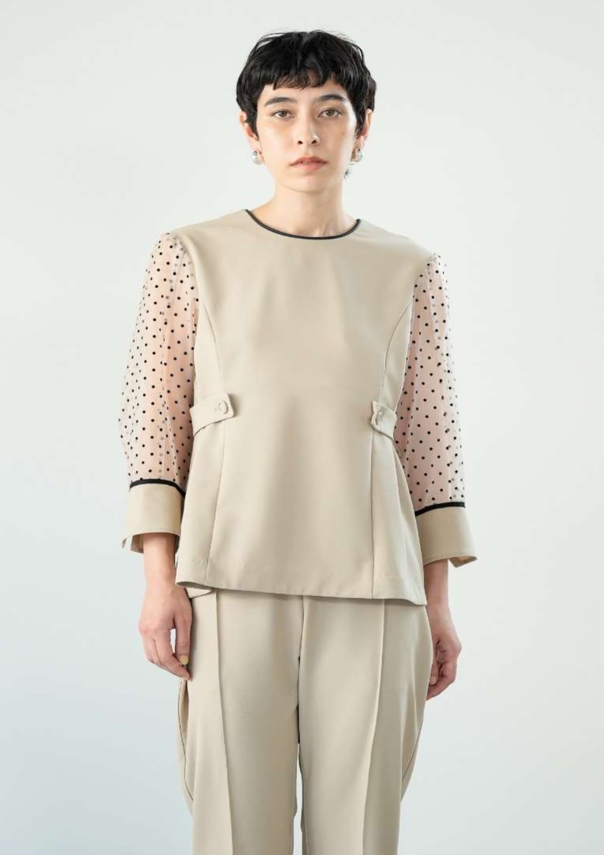 繊細に透けるドット袖がクラス感あるムードをかもすフォーマルブラウス。身頃には程よい肉感で透けのない落ち感がきれいなドレープ素材を活かし、Lallia Miの立体裁断技術によって上品で美しいフレアを表現しました。サイドのペプラム風デザインがストンと落ちた身頃と対比してフェミニンなムードを盛り上げます。