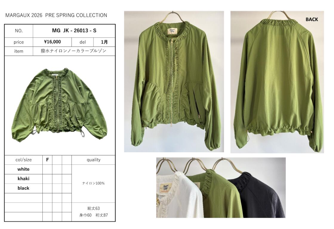 撥水ナイロンノーカラーblouson 【MARGAUX 25梅春ご予約】 マルゴー MARGAUX 26preS/S MG JK 26013 -S