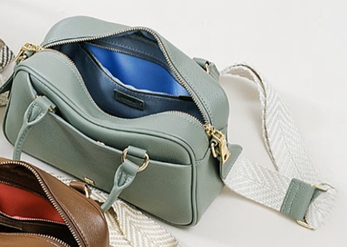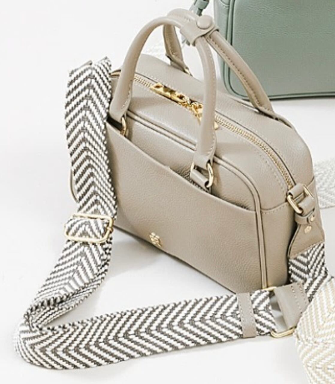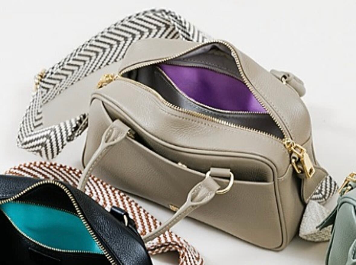春夏らしい綾織の斜め掛けコンビテープ、肩掛け用のレザーストラップなどシーンに合わせてお使いいただけます。