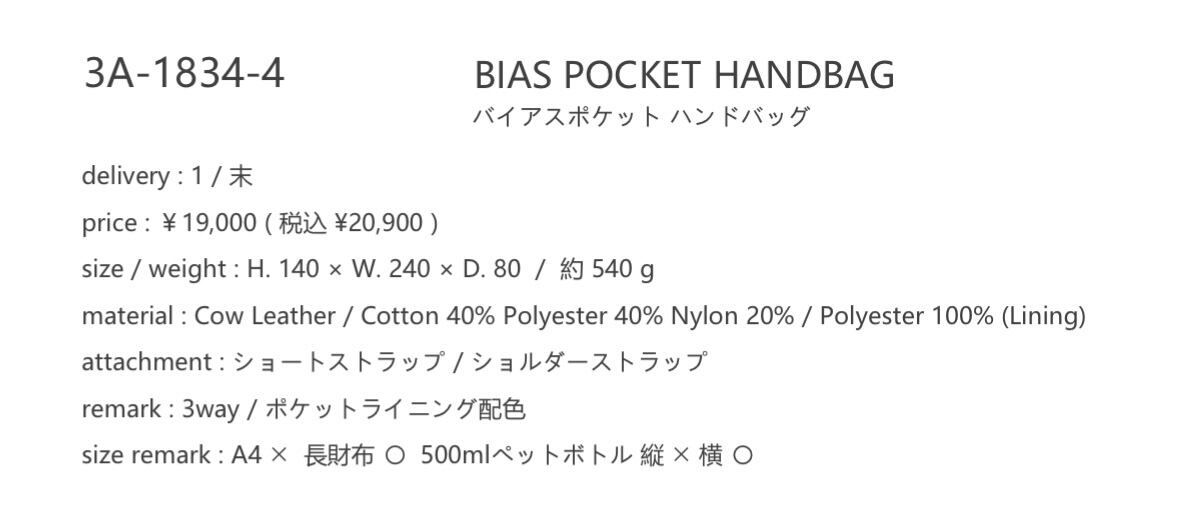 BIAS POCKET HANDBAG バイアスポケット ハンドバッグ 【STORY ストーリー 26春バッグご予約】 3A 1834 -4 2601c