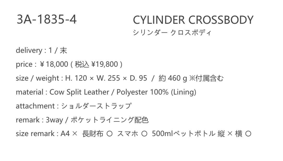 CYLINDER CROSSBODY シリンダー クロスボディ 【STORY ストーリー 26春バッグご予約】 3A- 1835 -4 2601c