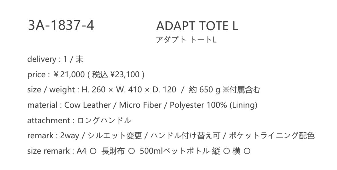 ADAPT TOTE L アダプト トートL 【STORY ストーリー 26春バッグご予約】 3A- 1837 -4 2601c