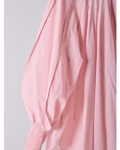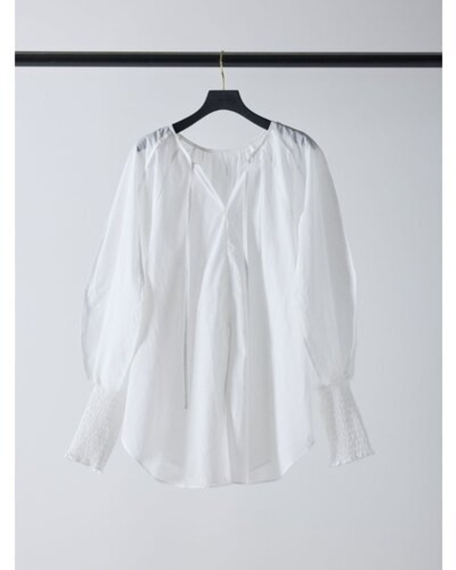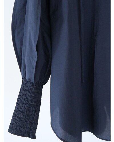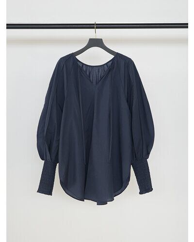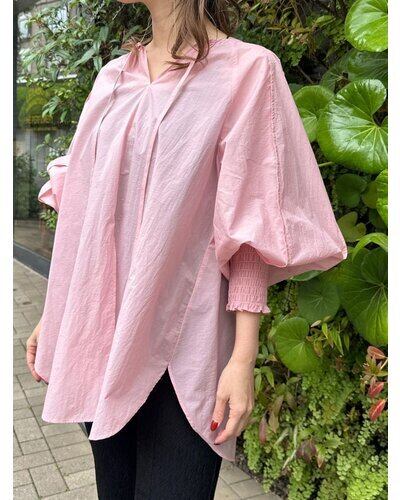 長めのカフスをシャーリングで仕上げ、たっぷりとしたボリューム袖を引き立てたチュニックブラウス。