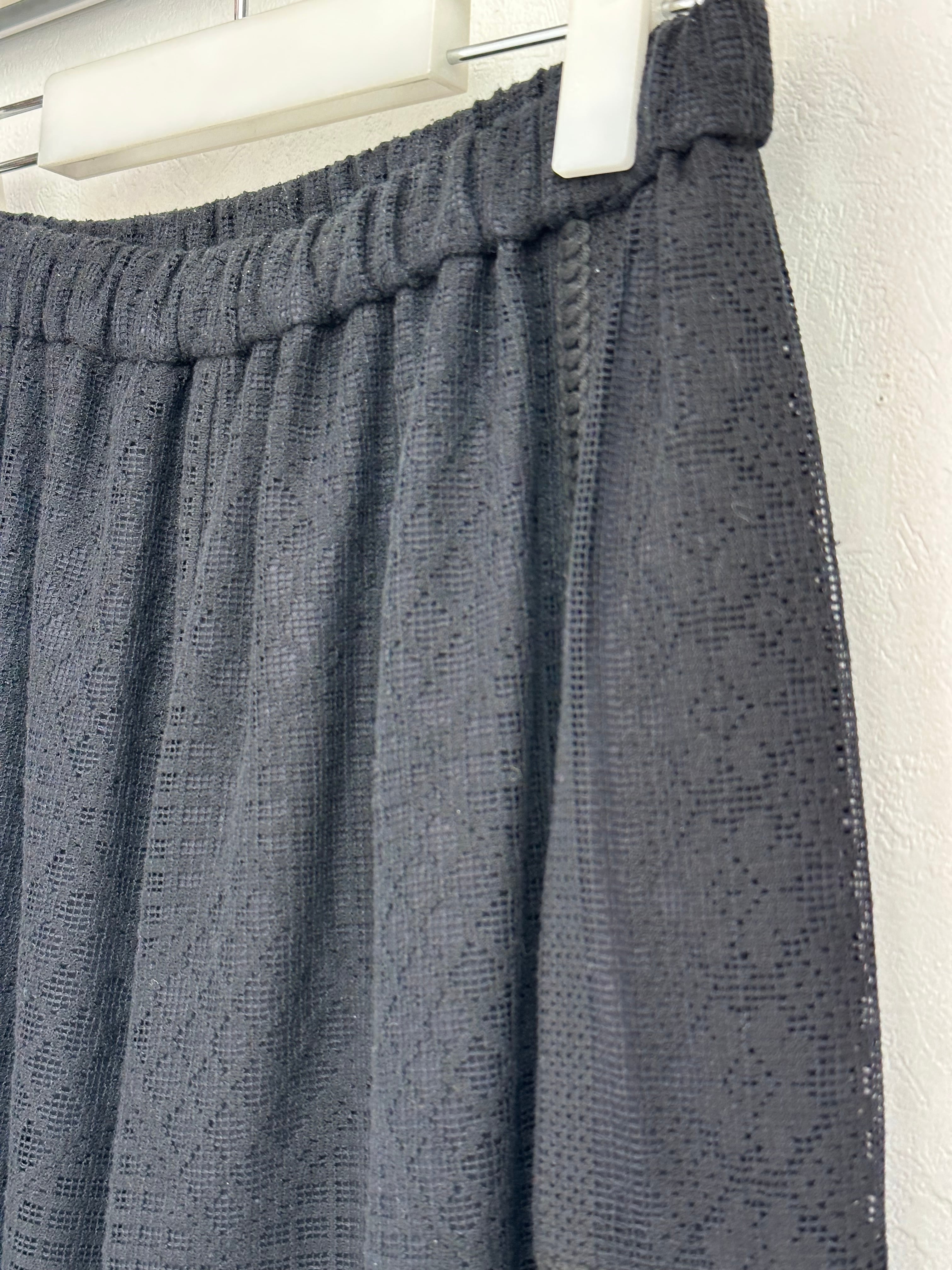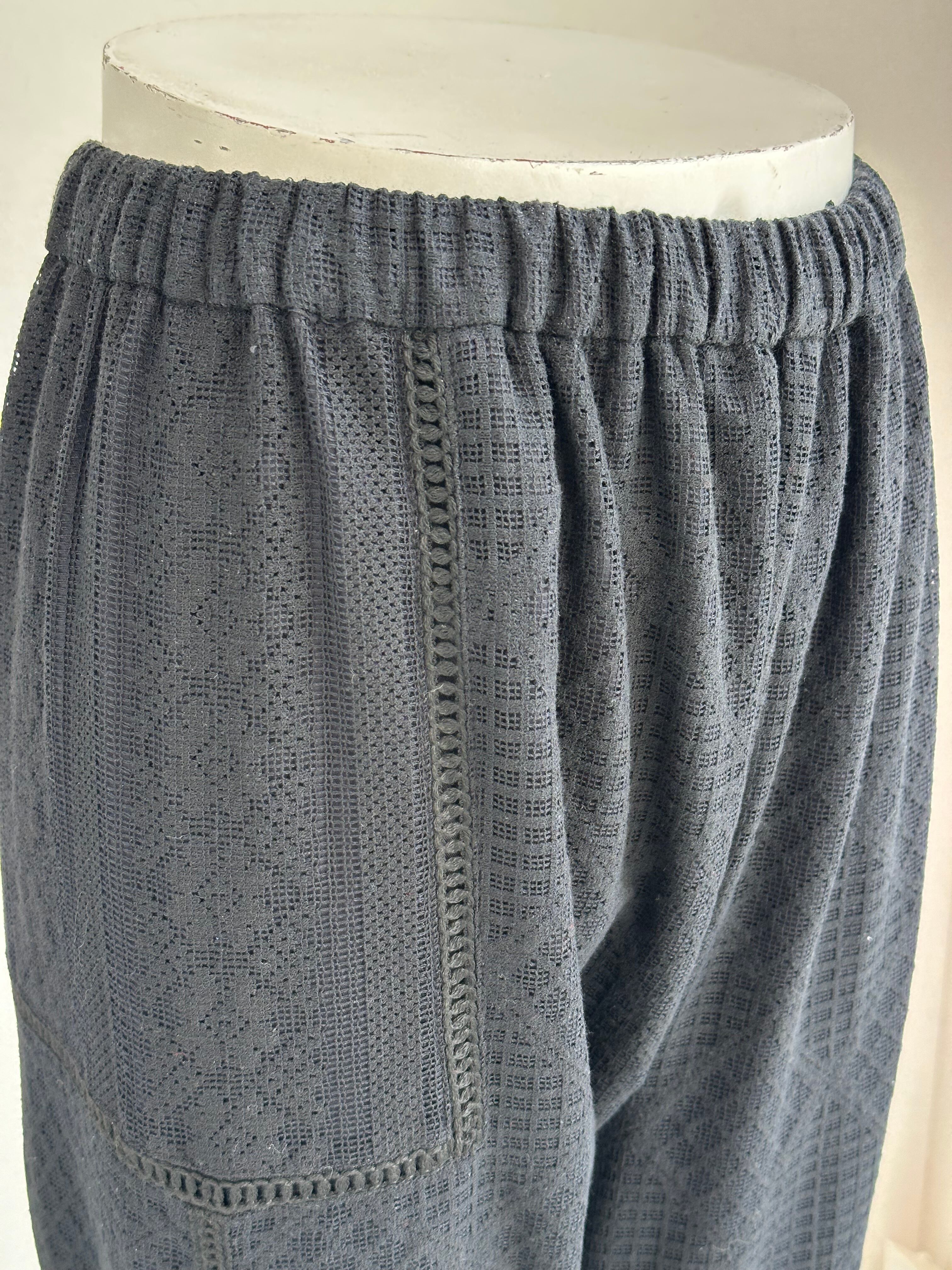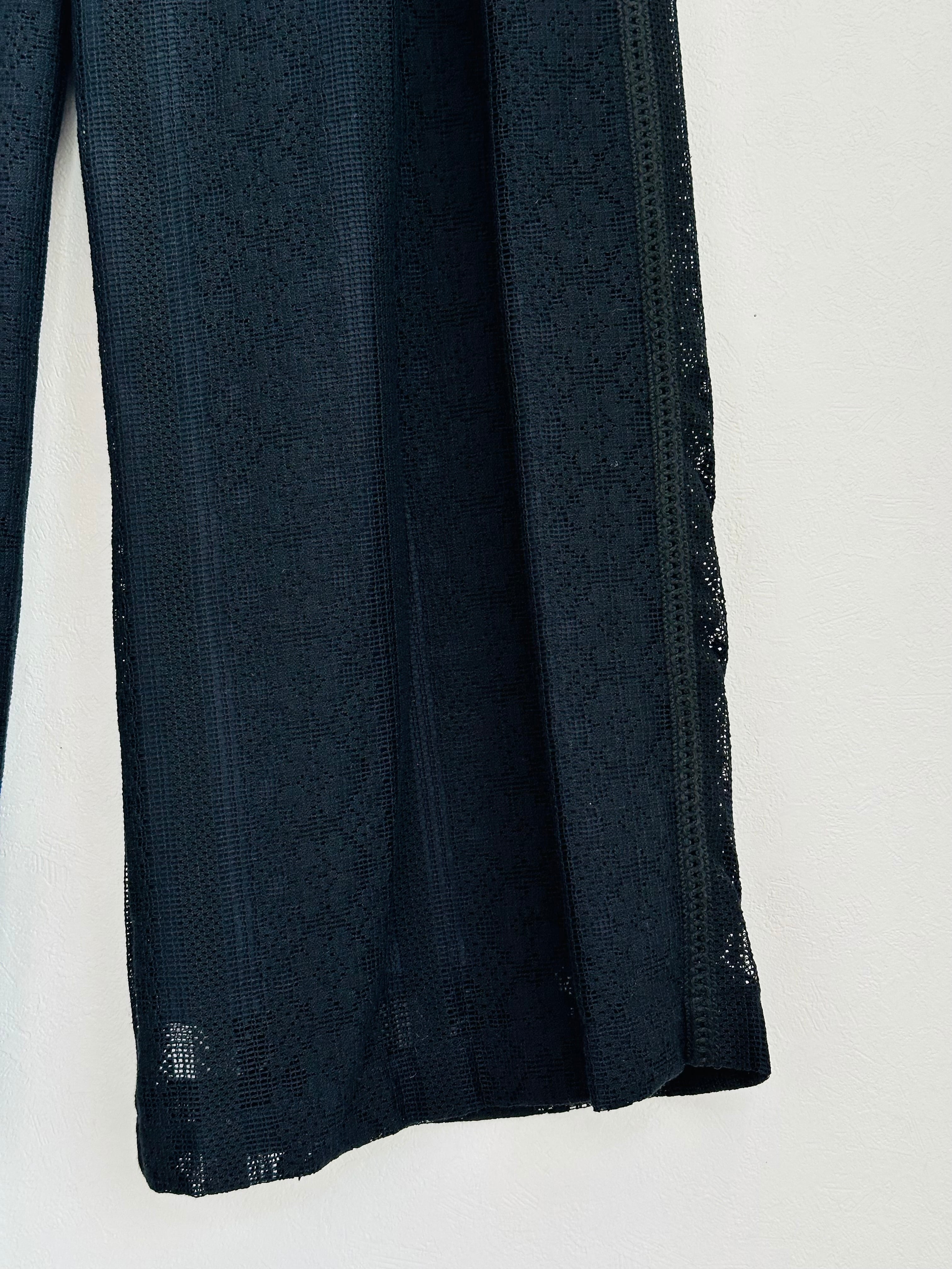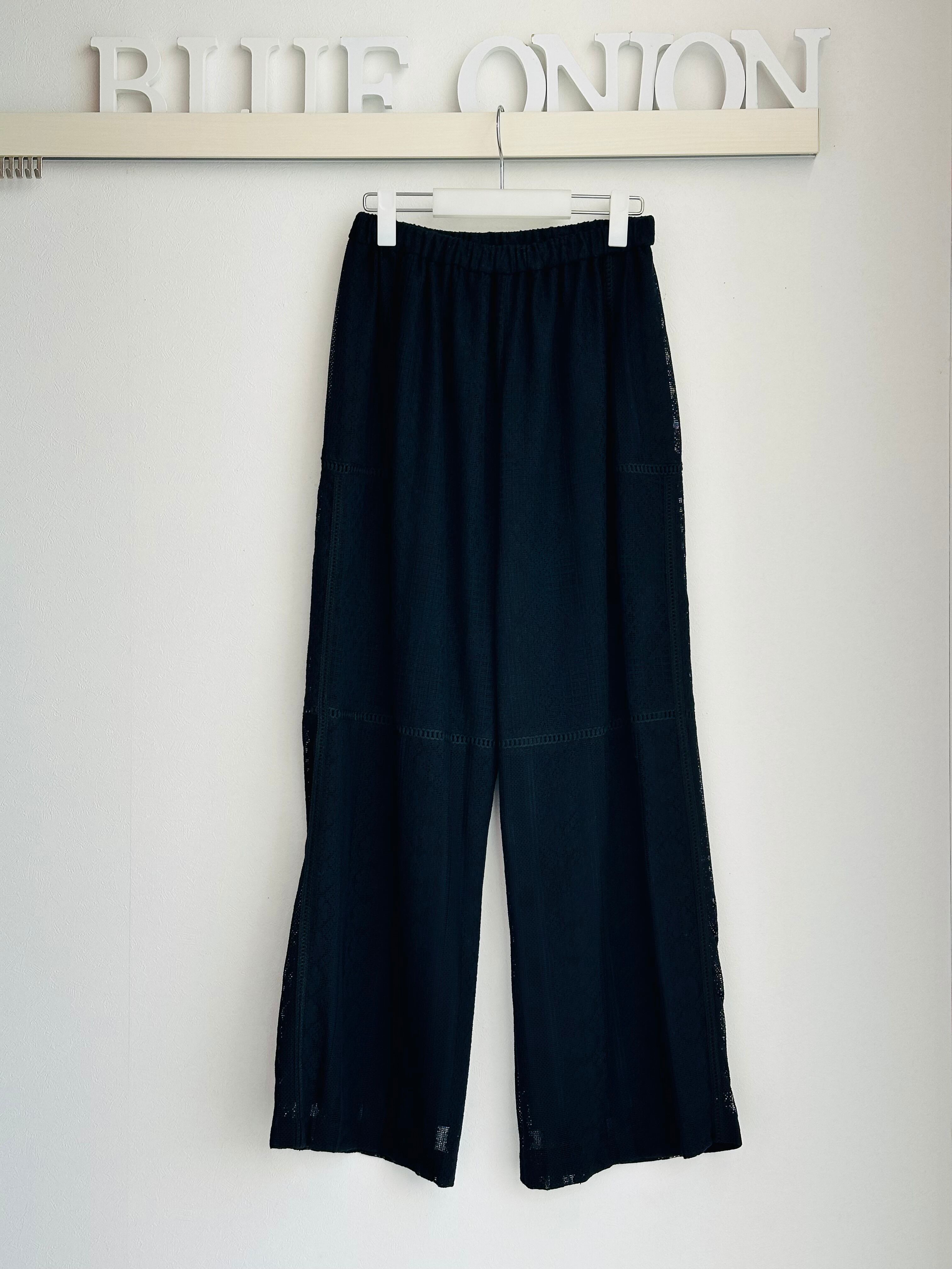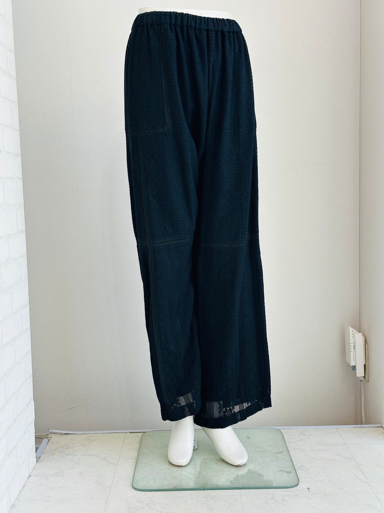 三種類のレースをパッチワークさせて作ったクラフト感あふれるデザインワイドパンツ。