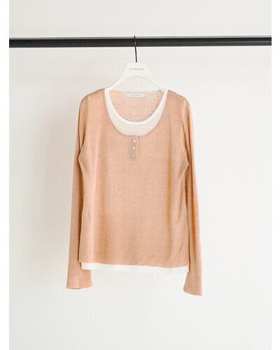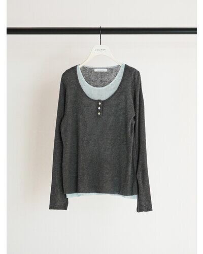 前身頃側だけタンクトップをレイヤードさせていますが、シアー感のある素材なので、下のタンクが透けて見えて、本当にタンクを重ねているように見えるのがポイント!