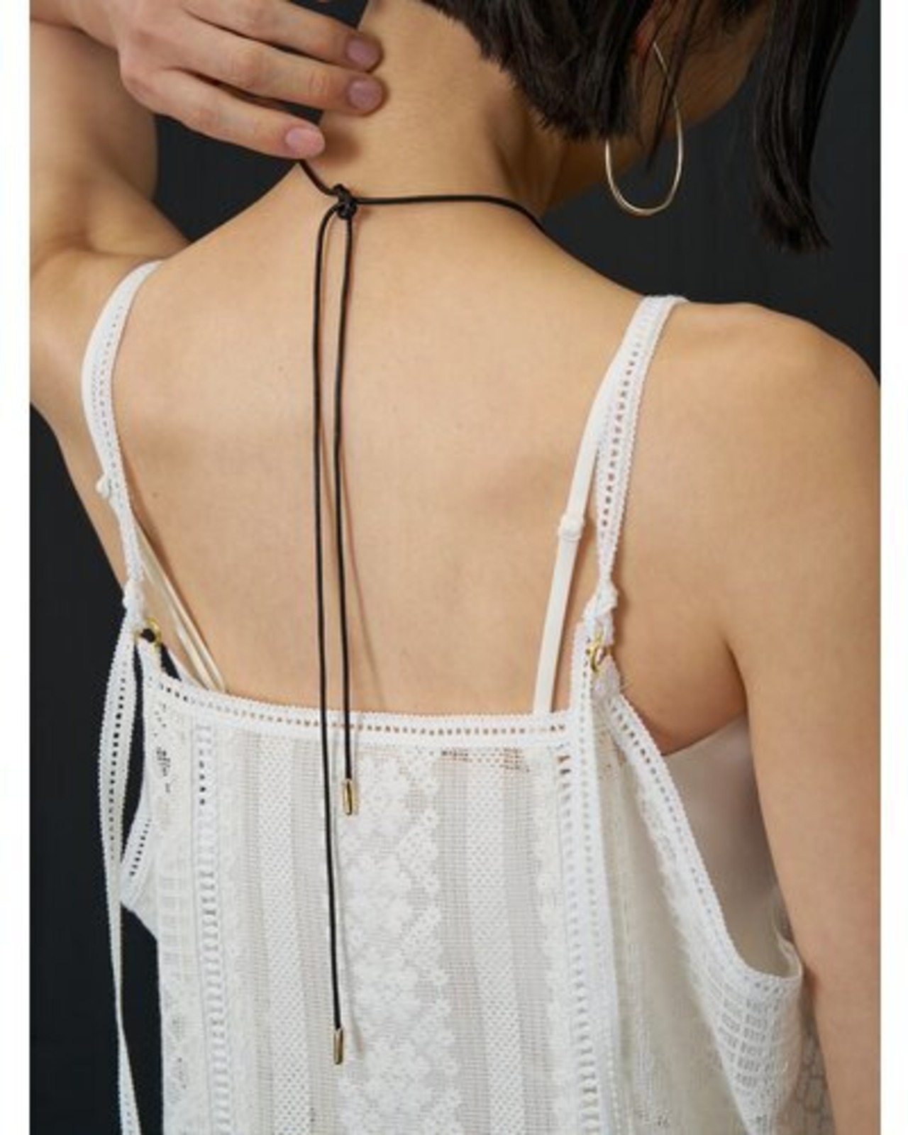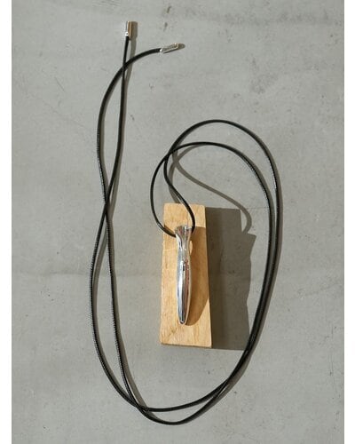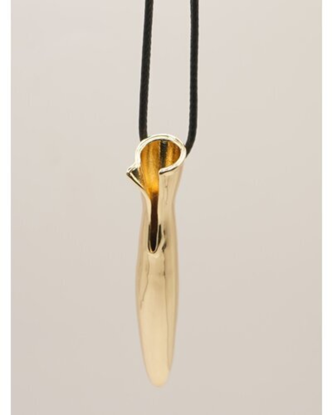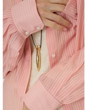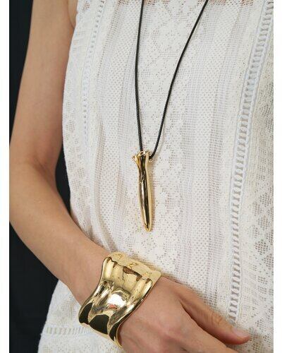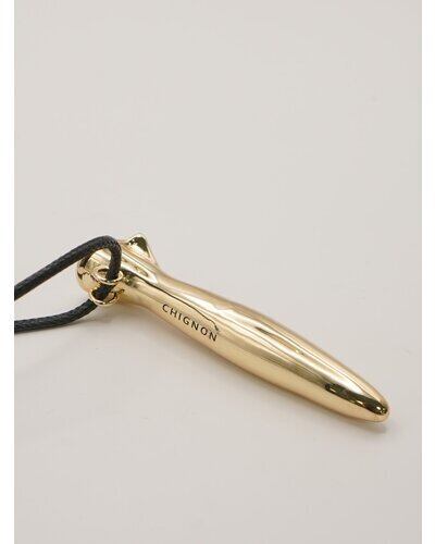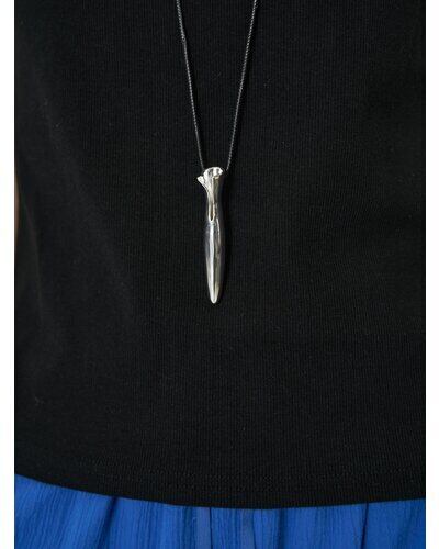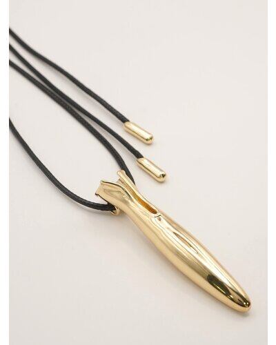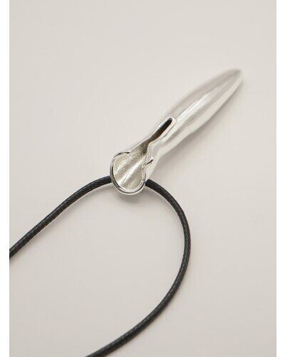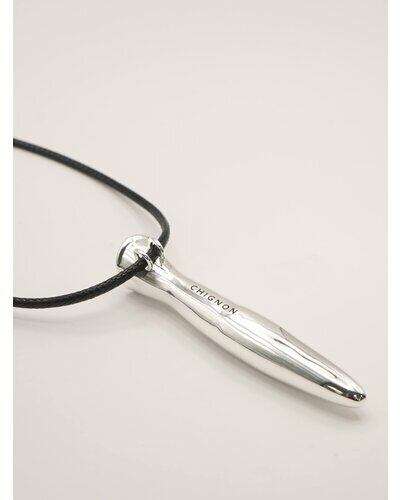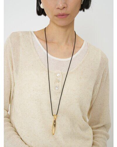 シャツの前開きスリットのようなデザインと花瓶のような長い筒が特徴的なコードタイプのロングネックレス。有機的なモチーフと黒コードの組み合わせは、いつものコーデにプラスするだけでさらりとかっこよく決まります。コード先端にはCHIGNONオリジナルキャップを施しており、結び目で長さ調節が可能なのでトップスに合わせてお好きな位置に着けられます。モチーフ背面には「CHIGNON」の刻印入り。