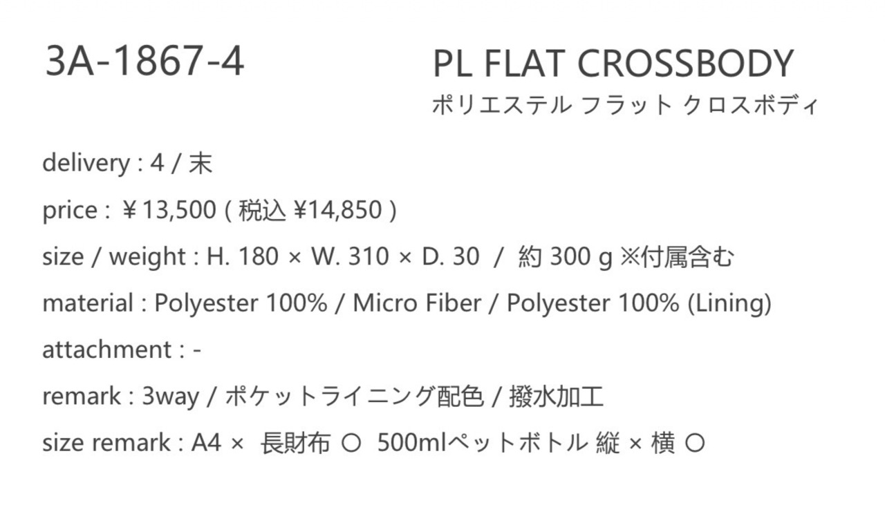 ポリエステル フラット クロスボディ 【STORY ストーリー 26夏バッグご予約】 3A- 1867 -4 2604c