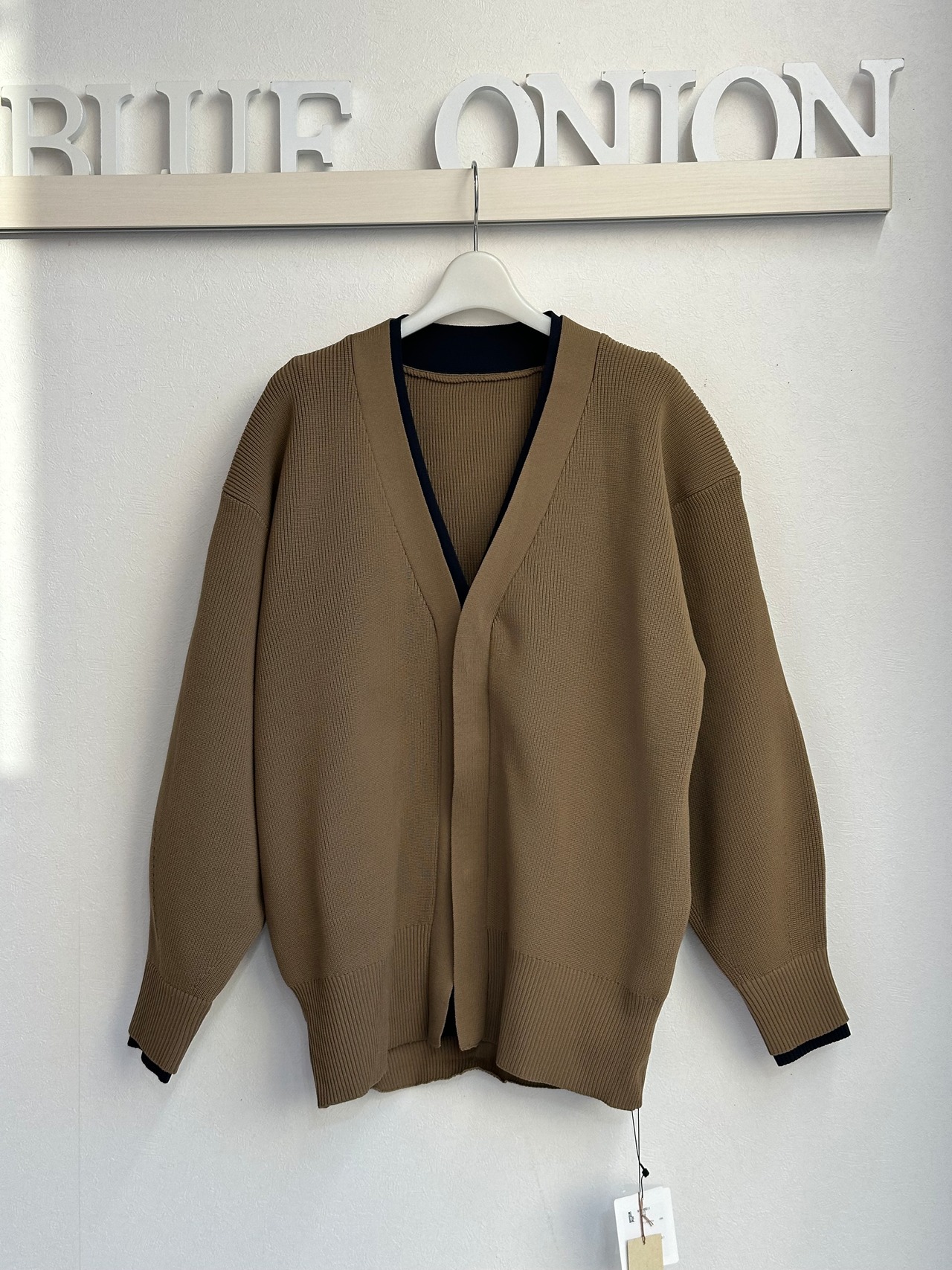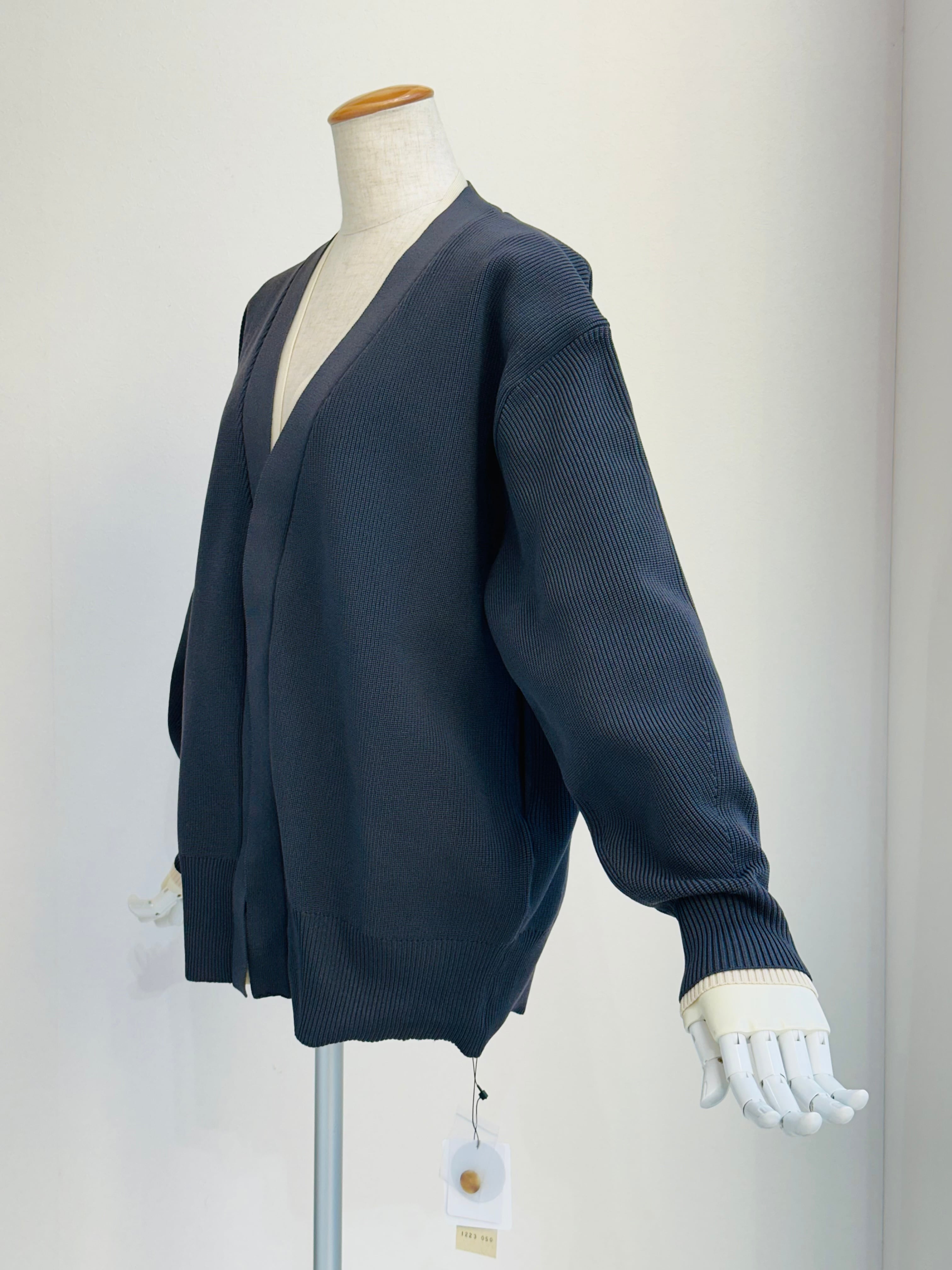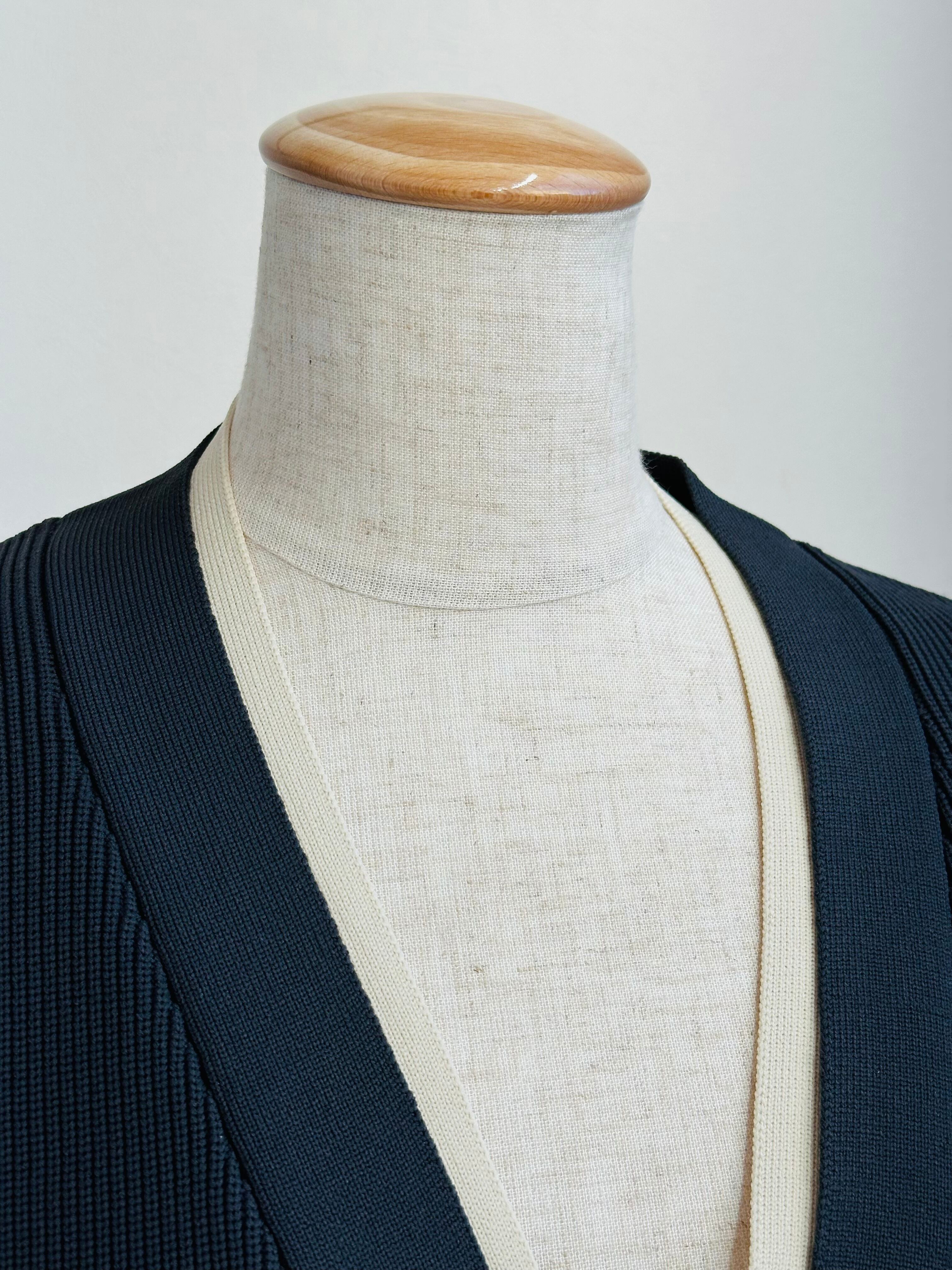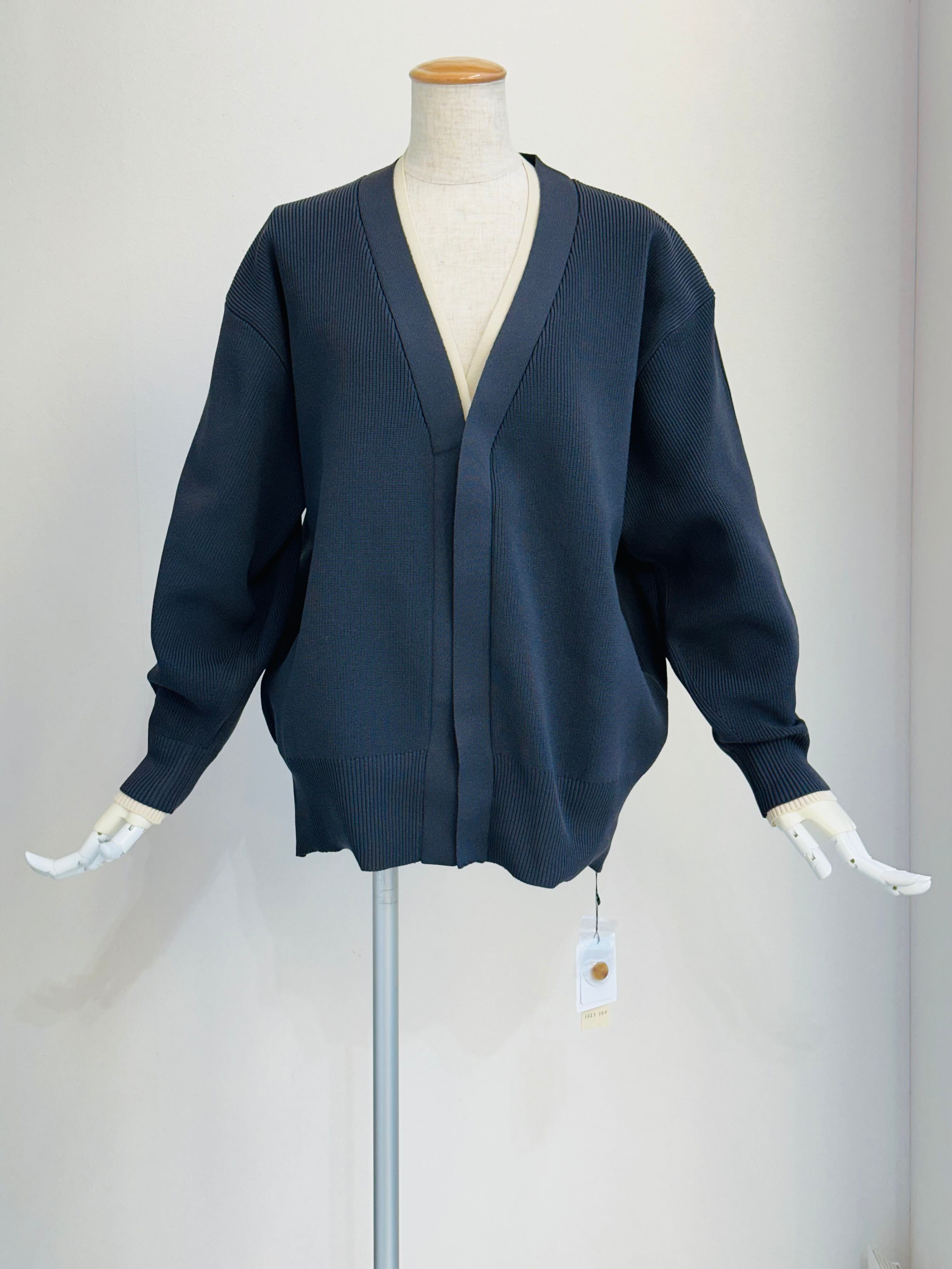 軽量ポリエステルの糸を編みにした、Vあきニットカーディガン。