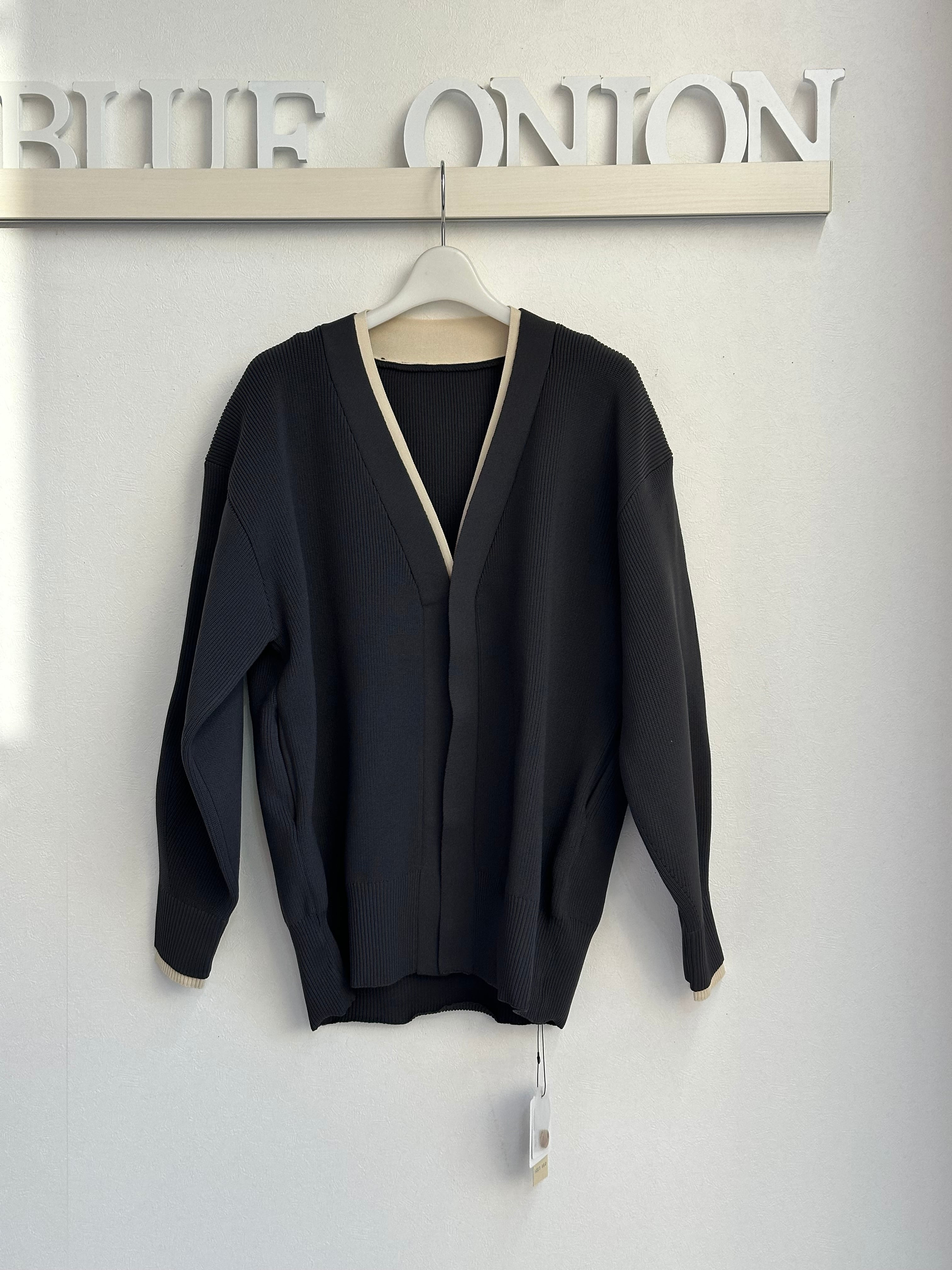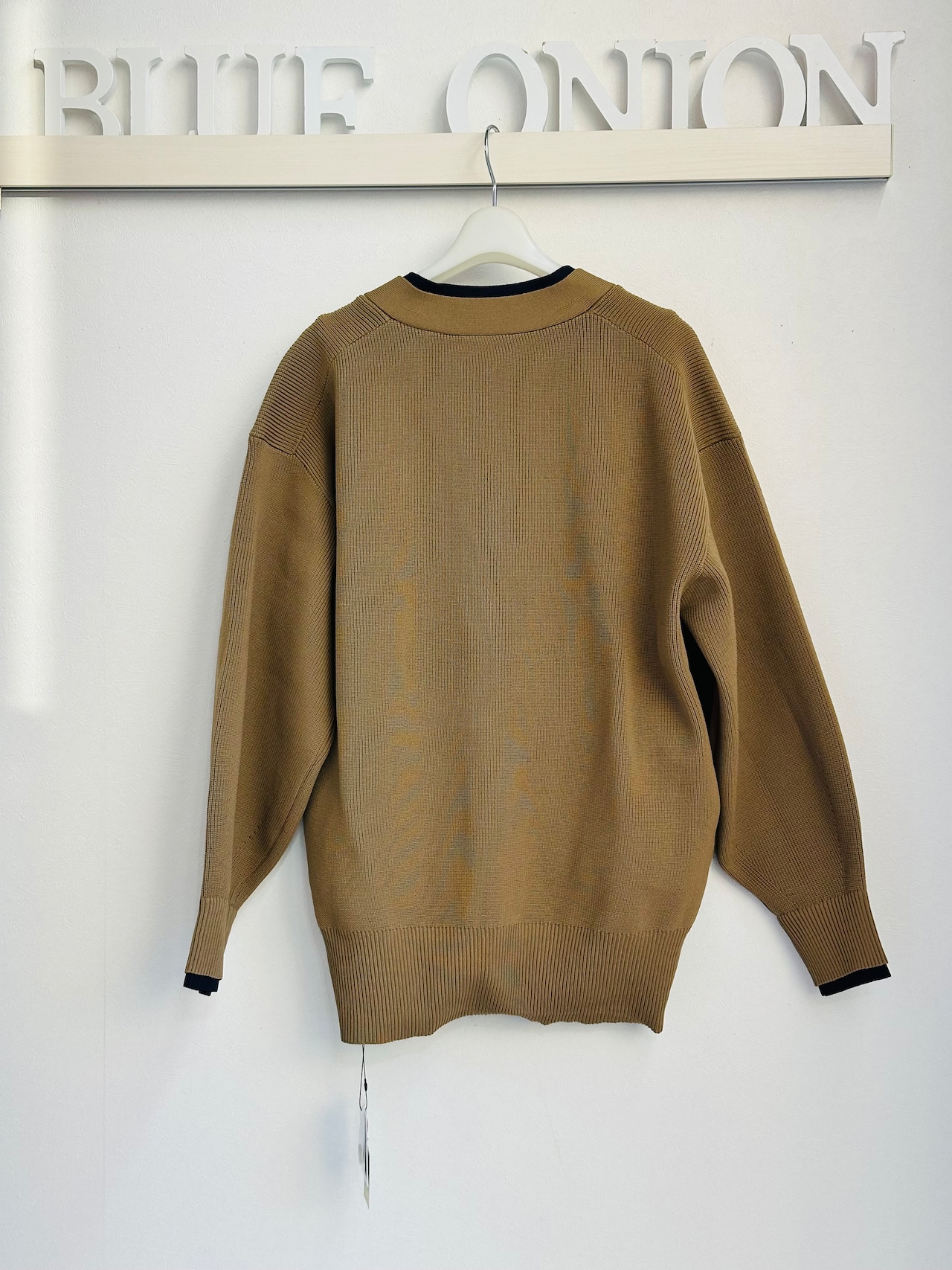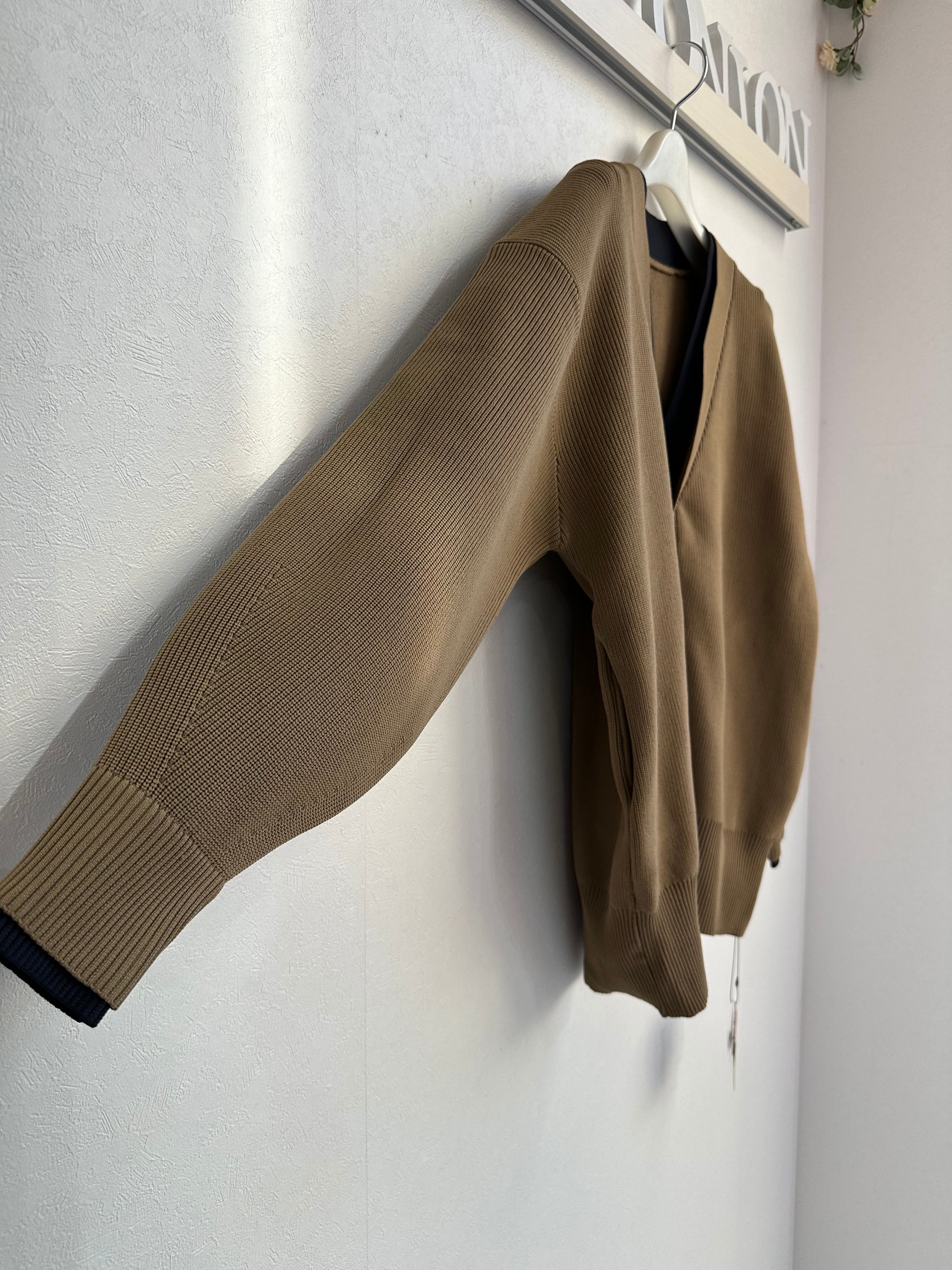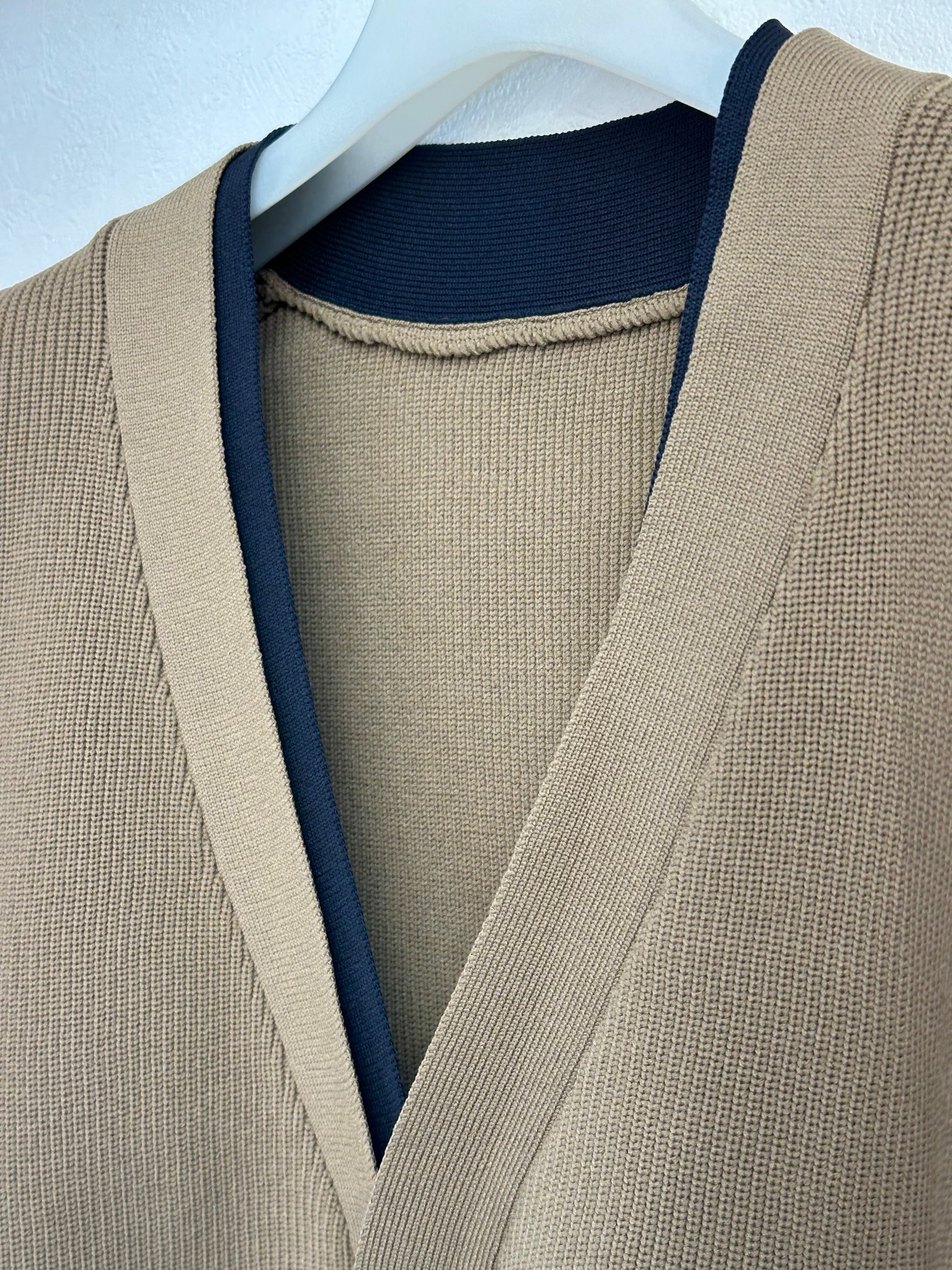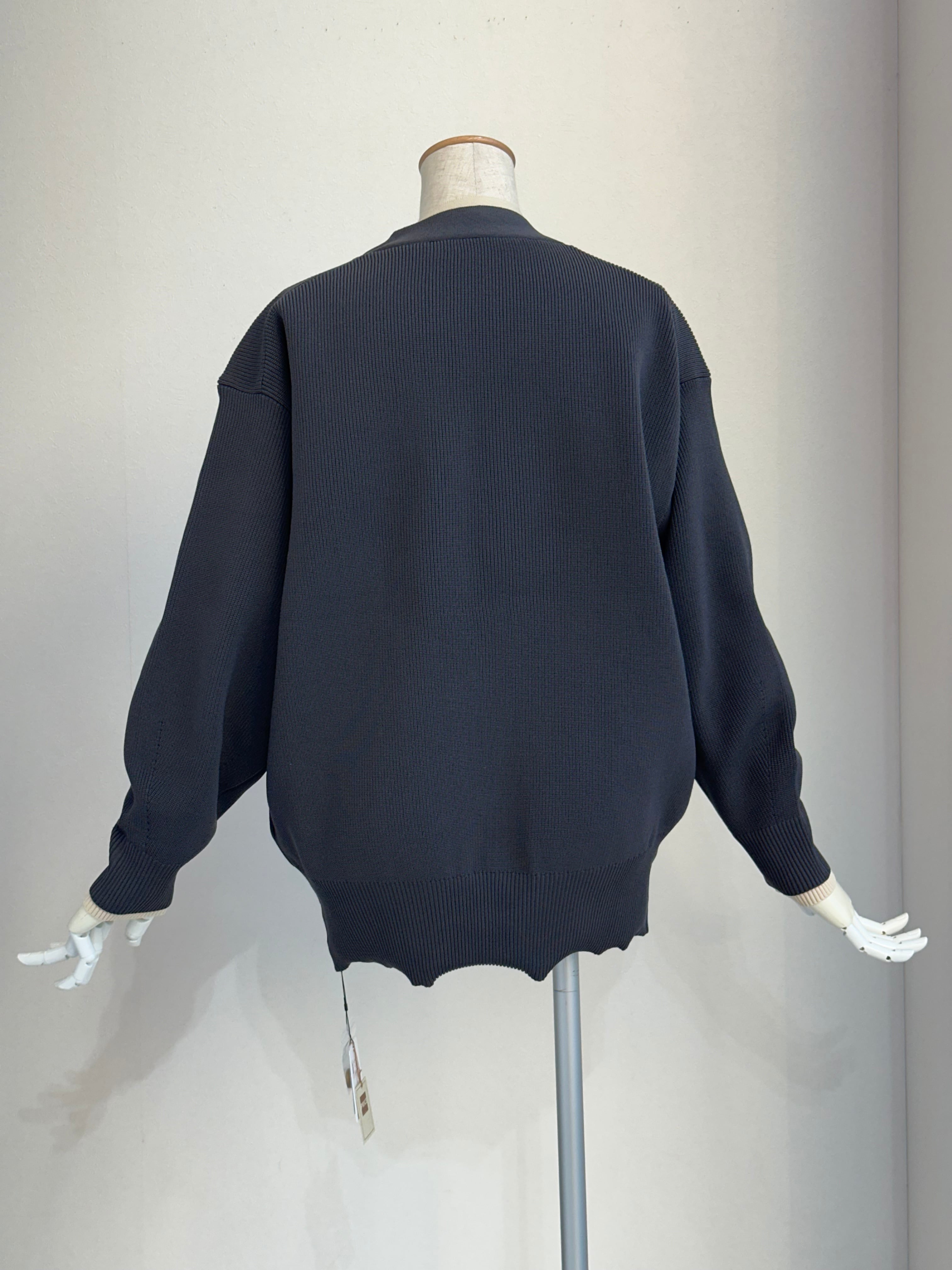 軽量ポリエステルの糸を編みにした、Vあきニットカーディガン。