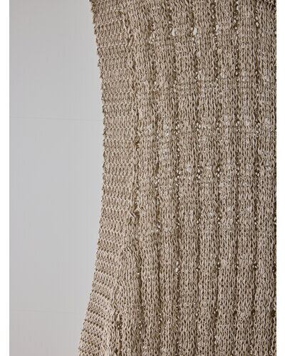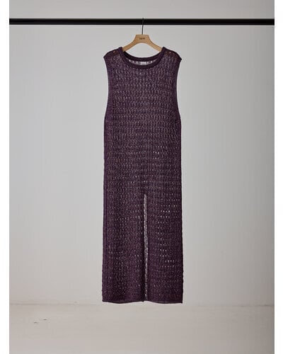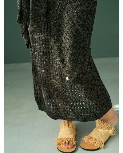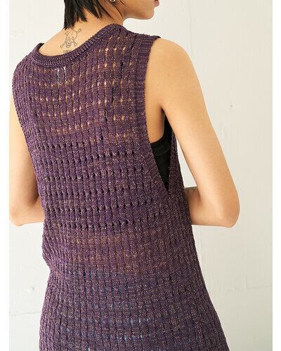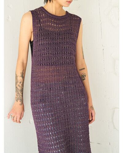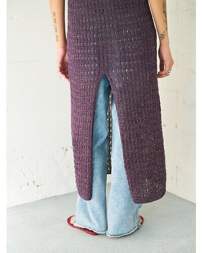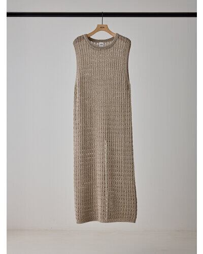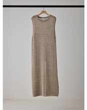 マニッシュな透かし編みを採用したニットロングワンピース。風合いの異なる2本の糸を引き揃えることで、独特なシャリ感と清涼感のある着心地に仕上げています。微配色の糸使いによる杢調の表情が、シンプルなデザインに奥行きをプラス。ノースリーブ仕様で軽やかに着用でき、バックスタイルの裾にはスリットを施し、動きやすさと抜け感を演出。パンツなどのボトムとレイヤードした着こなしも楽しめ、スタイリングの幅を広げてくれる一着です。