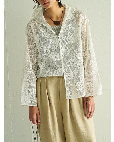 総レースのフーディシャツを、同素材で仕上げた巾着袋に収納できるポータブルレースフーディ。繊細なレースをあえてフーディデザインに落とし込むことで、甘さを抑えたスポーティで今季らしい表情に仕上げました。フロントは貝ボタンの前あき仕様で、ボタンを閉じればトップスとして、開ければ軽やかな羽織としても活躍。オフィスや通勤時の冷房対策として、常に持ち歩きたくなる一着です。バッグの中に忍ばせておくだけでも気分が高まり、腰巻きで取り入れればトレンド感のあるスタイリングも楽しめます。
