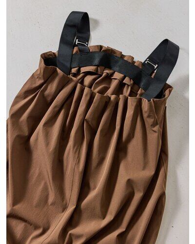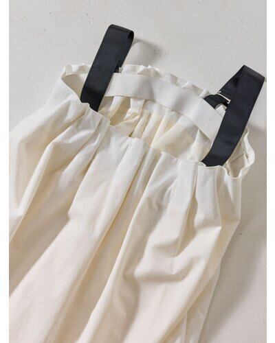 胸元に施したタックギャザーがデザインのポイントとなるキャミワンピース。素材感に表情のある生地を使用し、シンプルながらも存在感のある一着に仕上げました。切り替えを入れたすっきりとしたシルエットに、ポケット付きで実用性も兼備。肩紐には配色のブラックグログランテープを採用し、モードな印象をプラスしました。内側の3段階ホックで長さ調整ができ、長めの肩紐がバックスタイルのアクセントに。撥水加工と伸縮性のある素材で、デイリーから旅先まで幅広く活躍します。