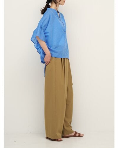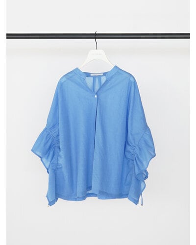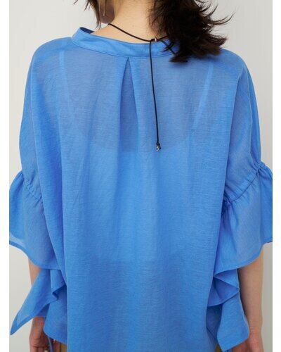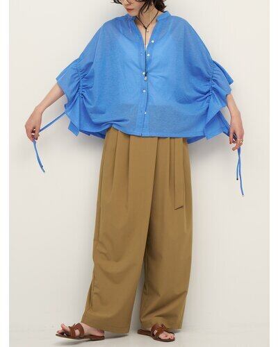 サイドの紐を絞って頂くと、ふらしている袖口部分ににフレアが入り、半袖のブラウスを着ているようなシルエットに変わります。