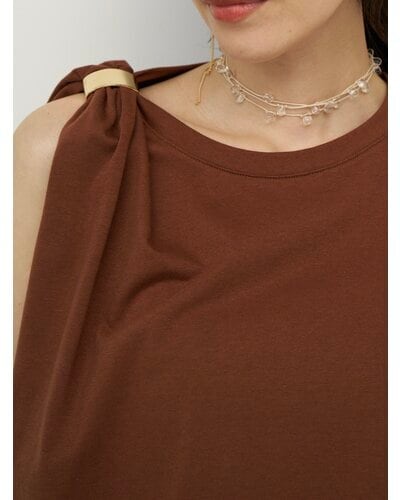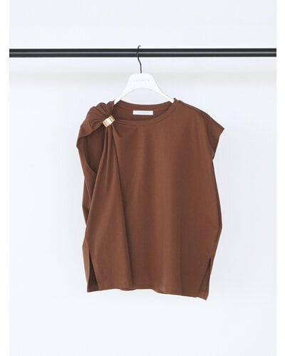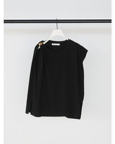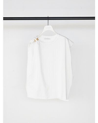 二の腕のラインを包んでくれるショルダータックが効いた、シンプルで着回しの効くトップスに、ゴールドのマグネット式メタルクリップをセット。