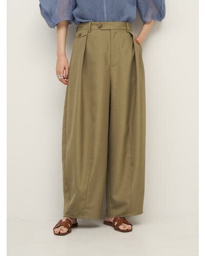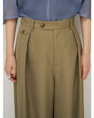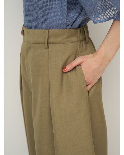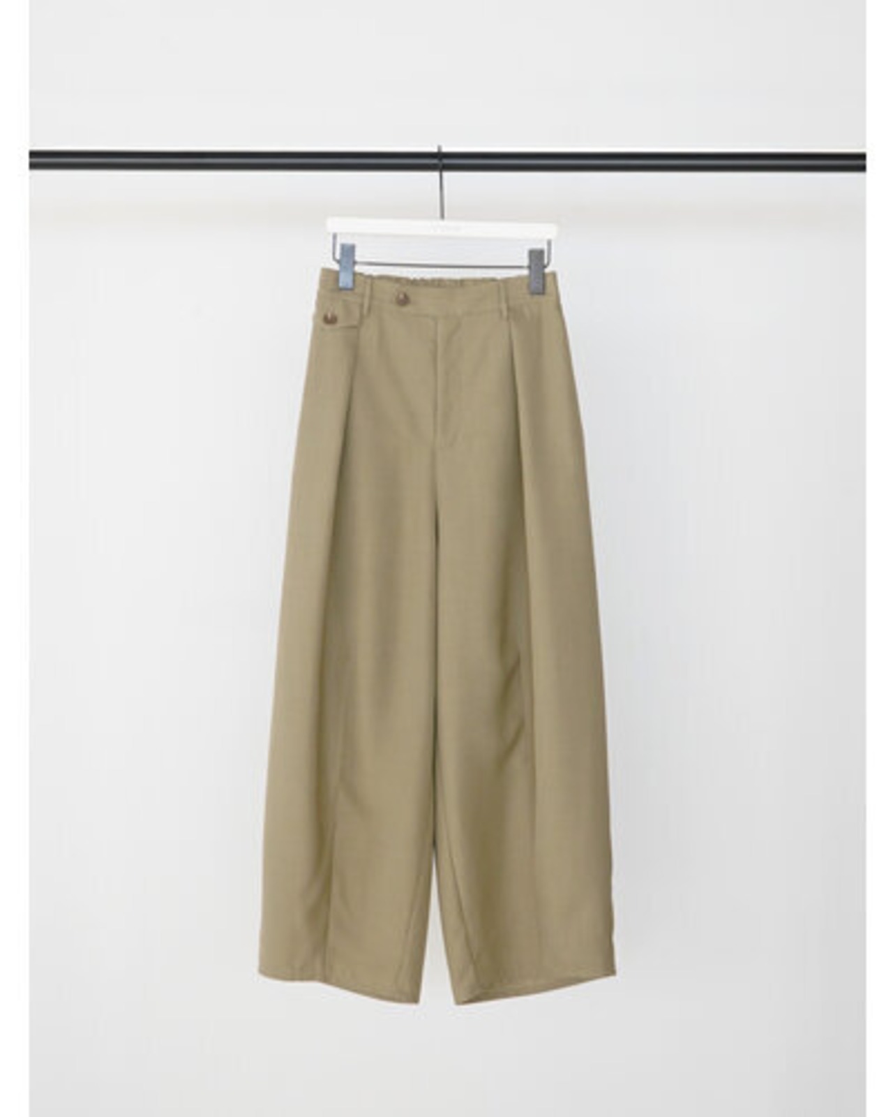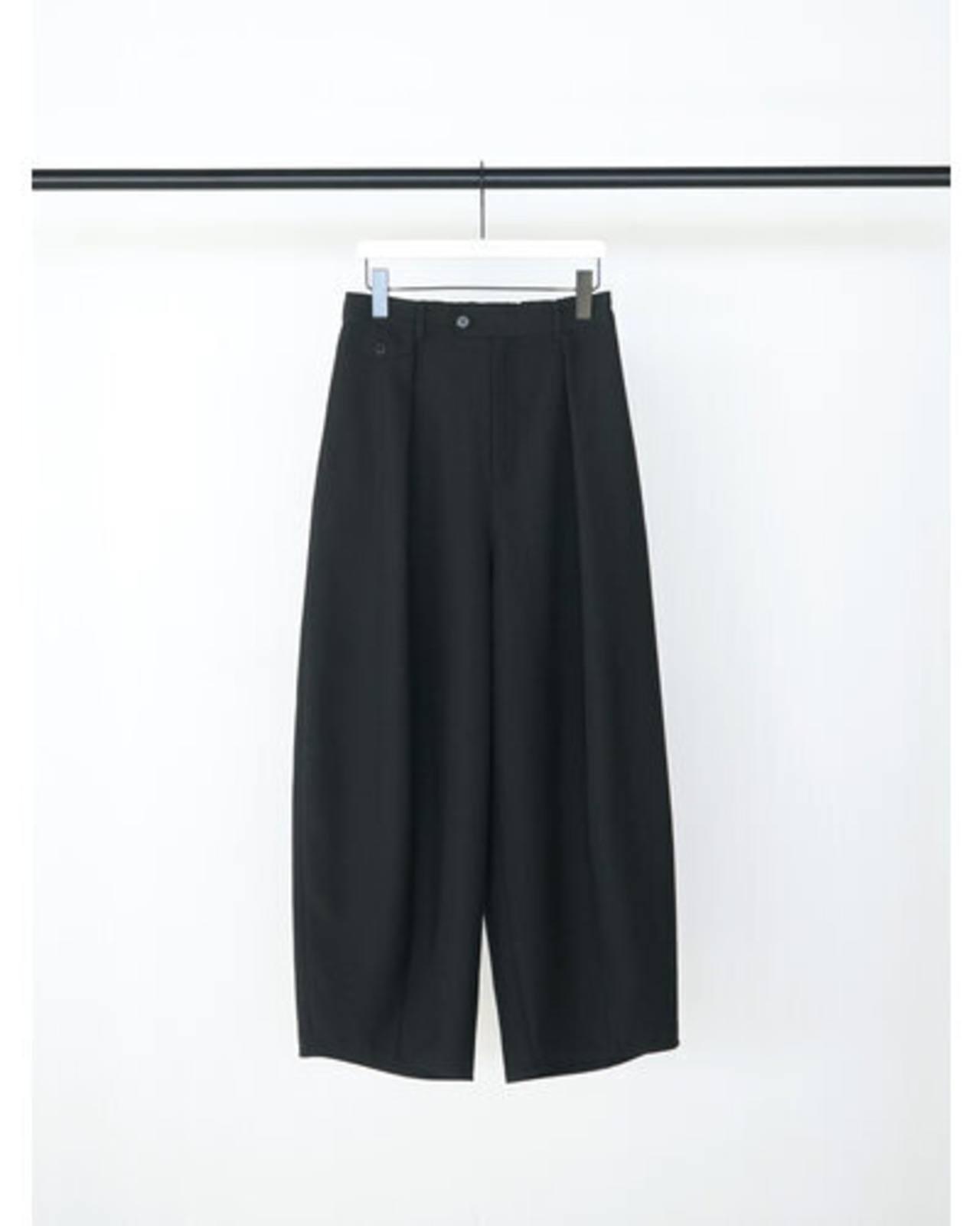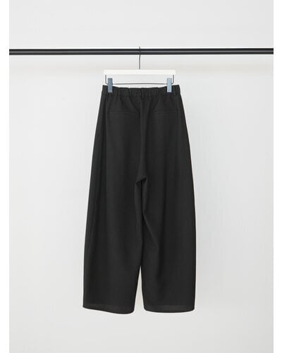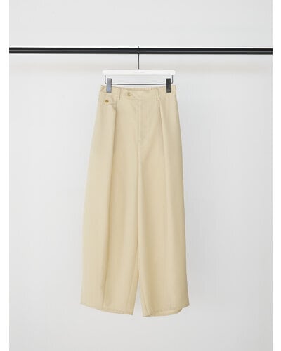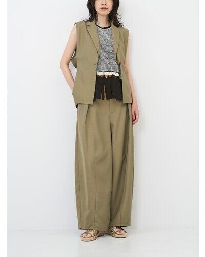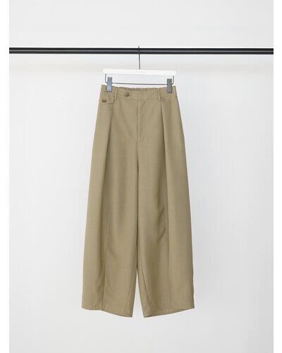 程よいハリのある素材なのでキレイなコクーンシルエットに。後より前側に分量感を多く設定し、ボリュームを感じながらもスッキリとしたラインで、コーディネートしやすいボトムになっています。メンズライクなスラックスをイメージしたウォッチポケットもアクセント。単品使いではもちろん、同素材のジレとセットアップでのコーディネートでモード感のあるスタイルもおススメです。