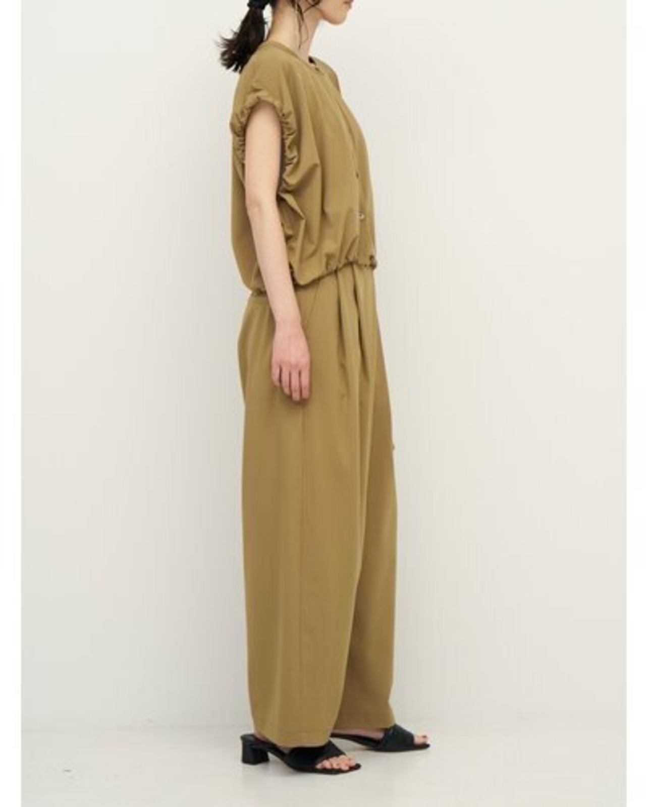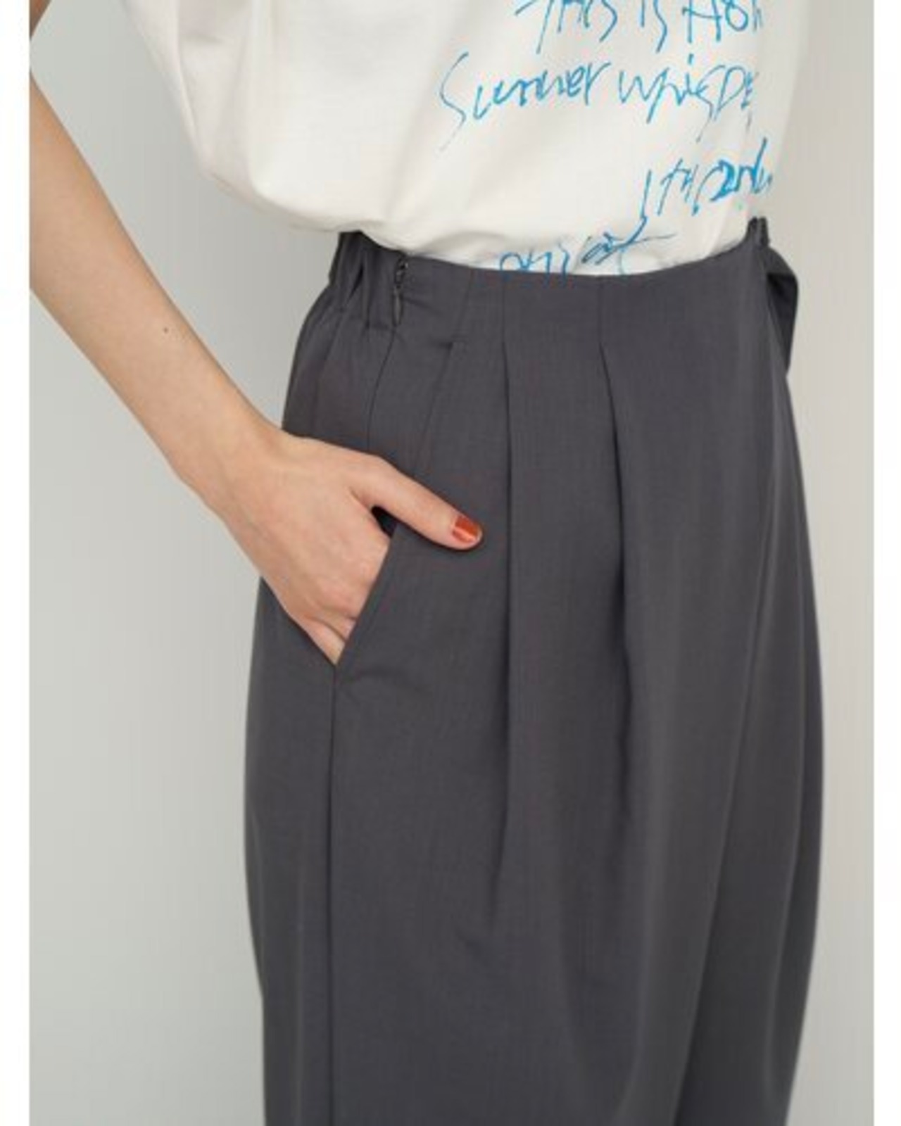 ベルトを見せるタックインスタイルがおすすめですが、生地が軽くウエスト周りがもたつかない設計なので、チュニックなど長め丈のトップスと合わせてもバランスよく履いていただけます。