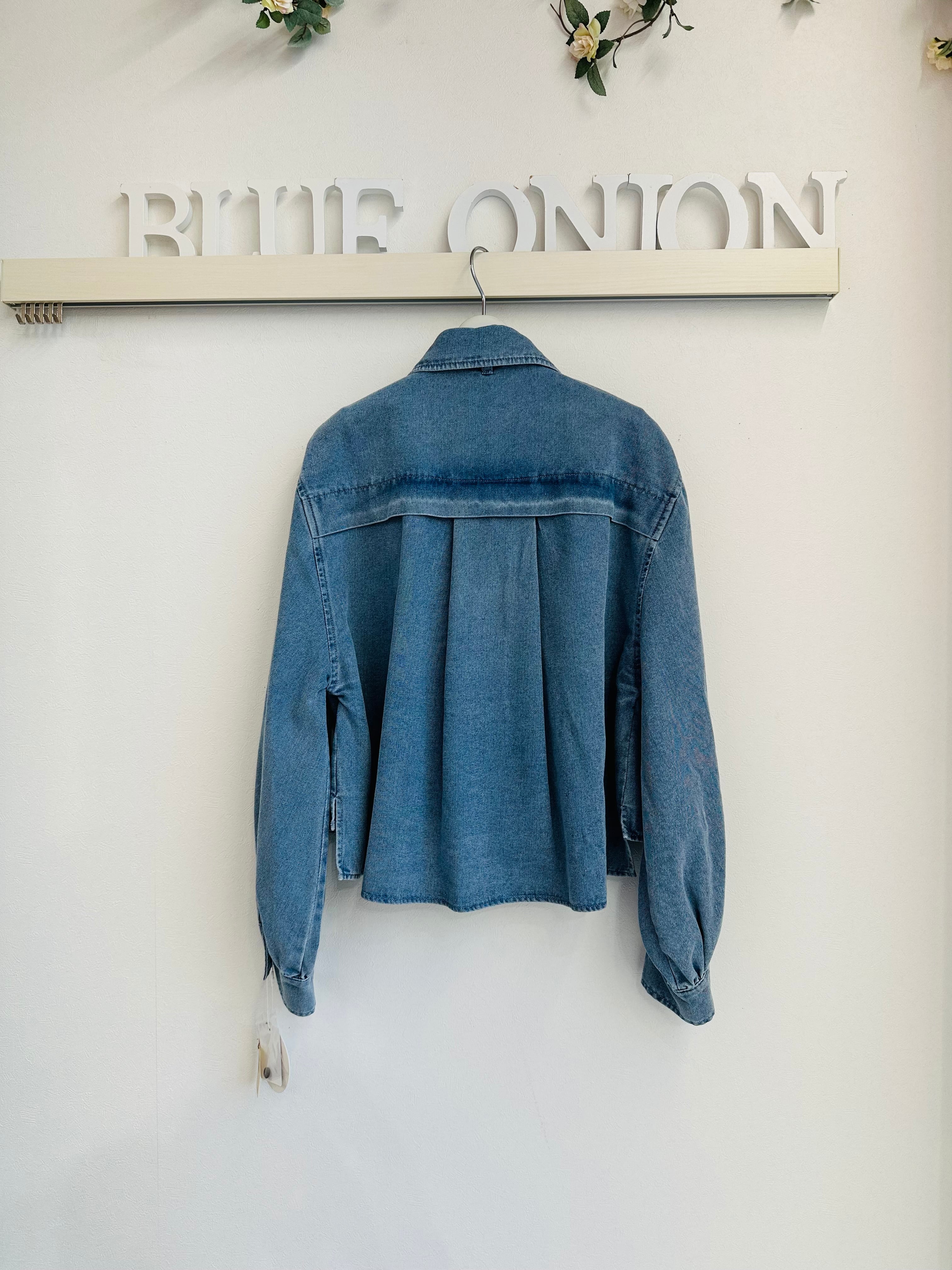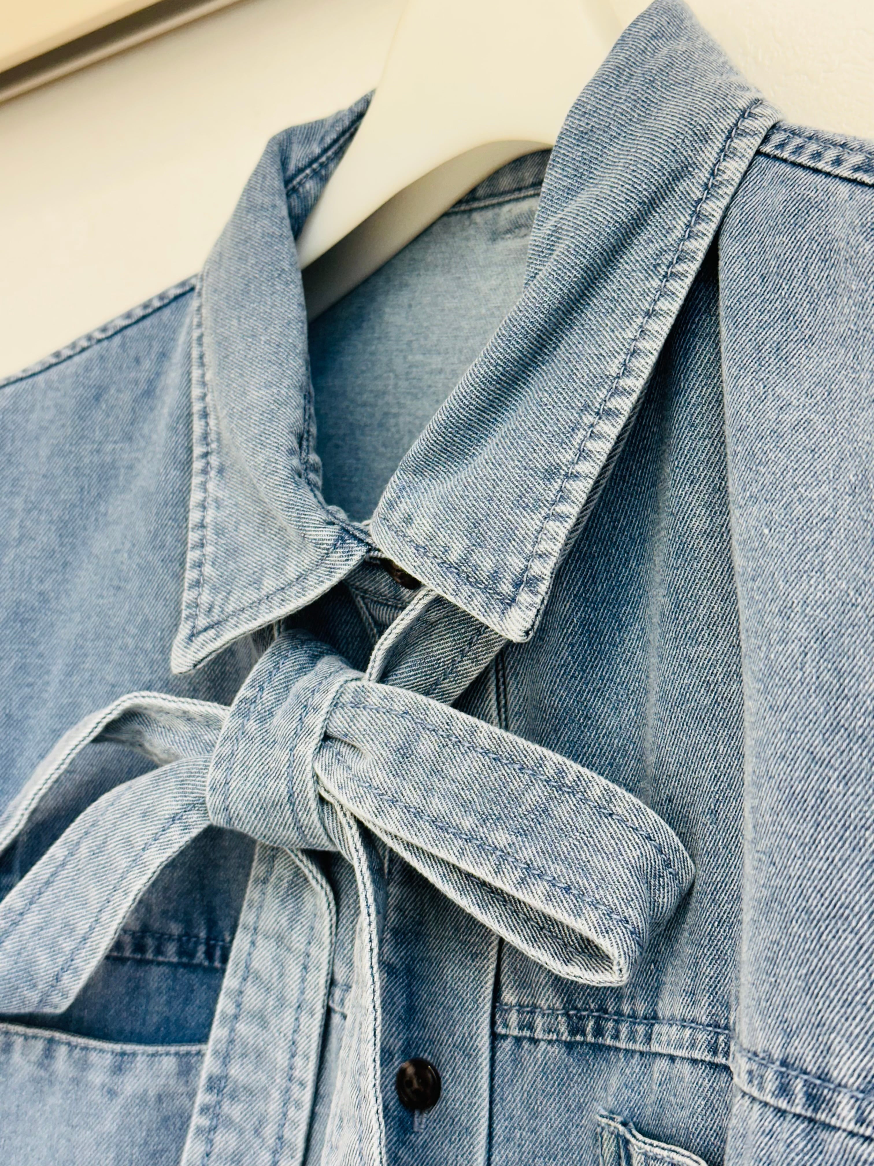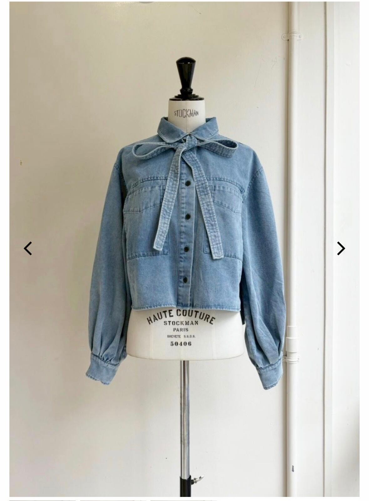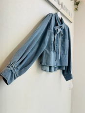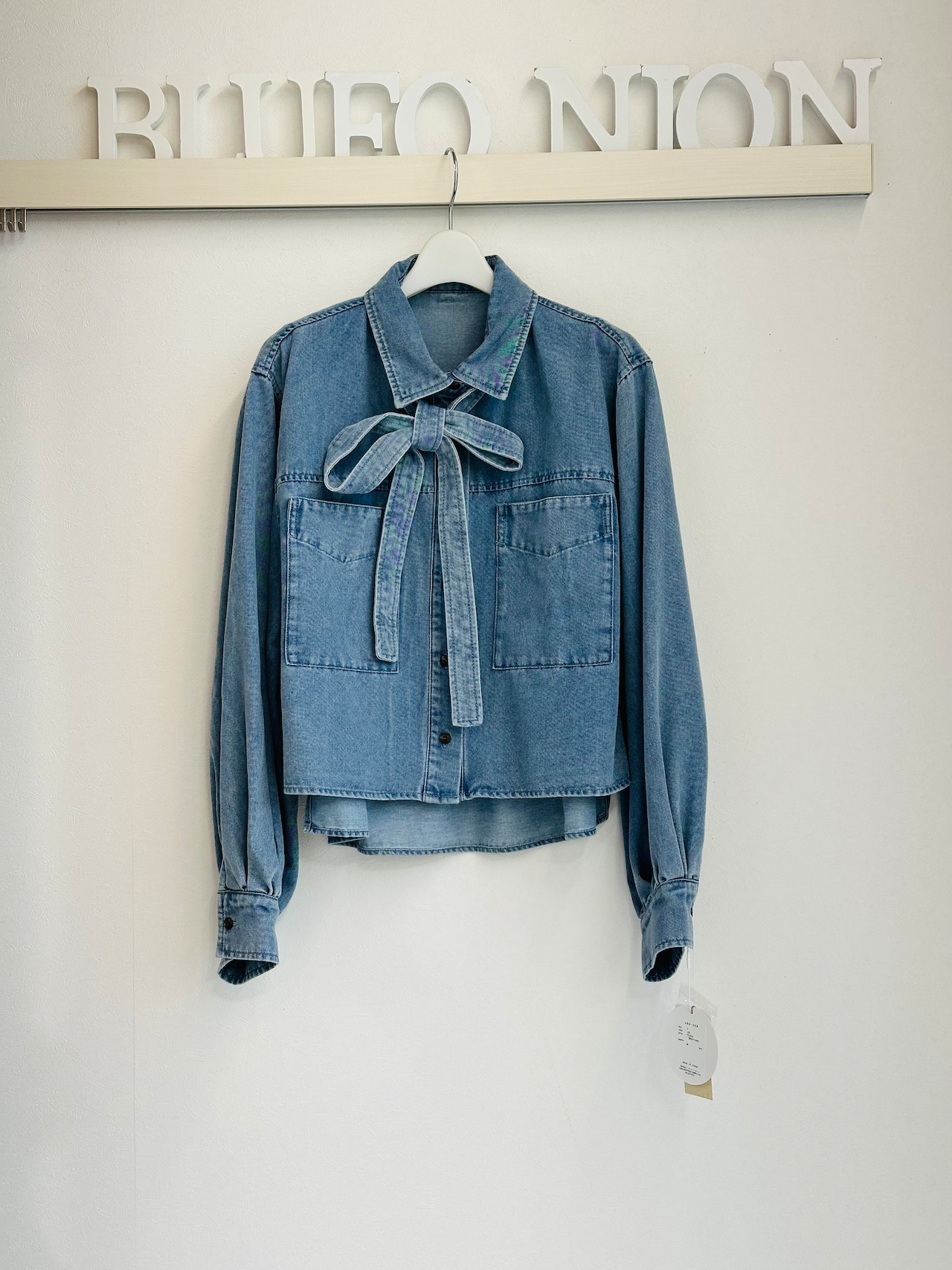 首元のリボンデザインがさりげないアクセントになり、顔まわりをやさしく華やかな印象に仕上げてくれます。リボンは取り外し可能なのでシンプルなデニムシャツとしても着用していただけます。