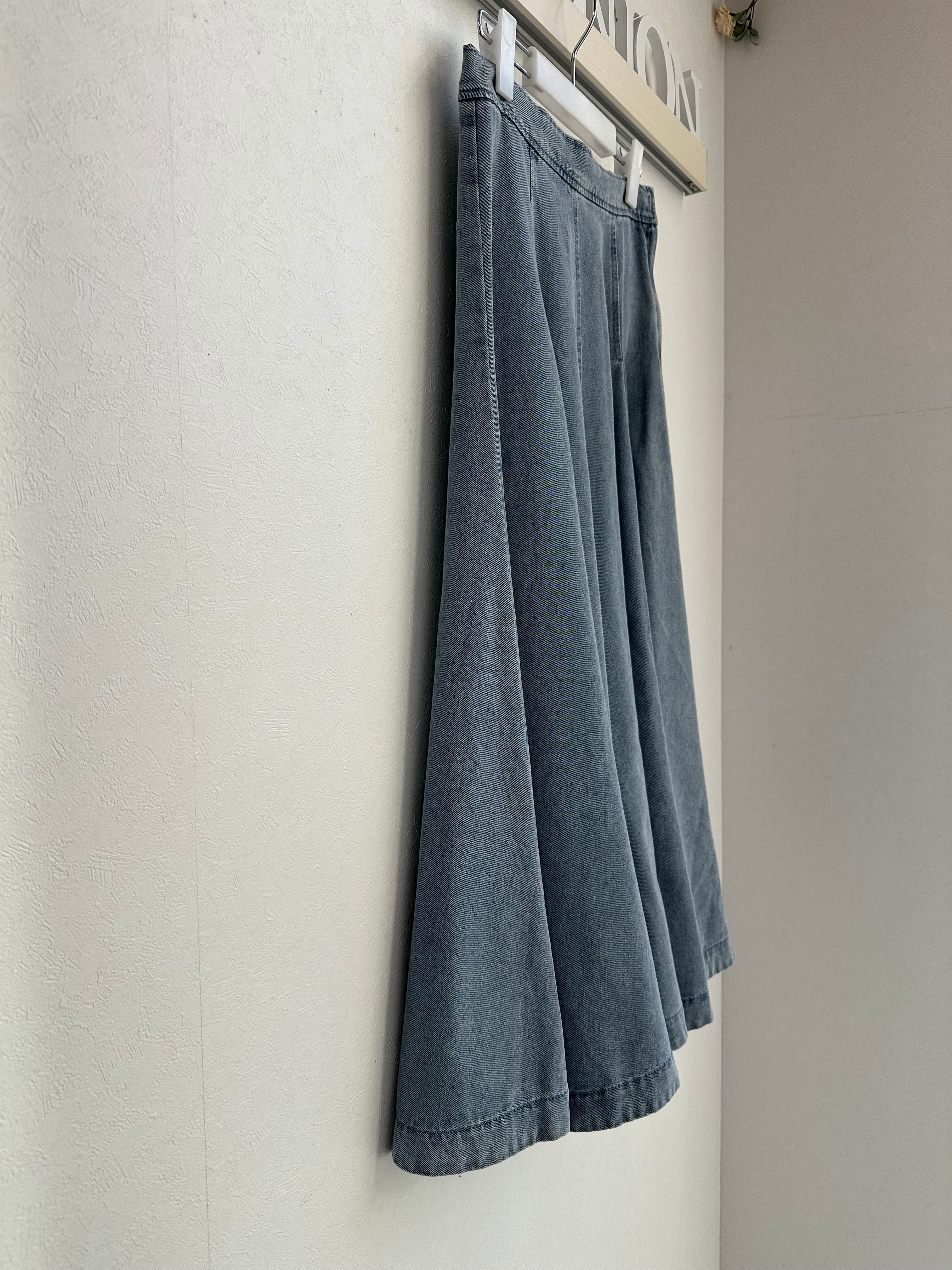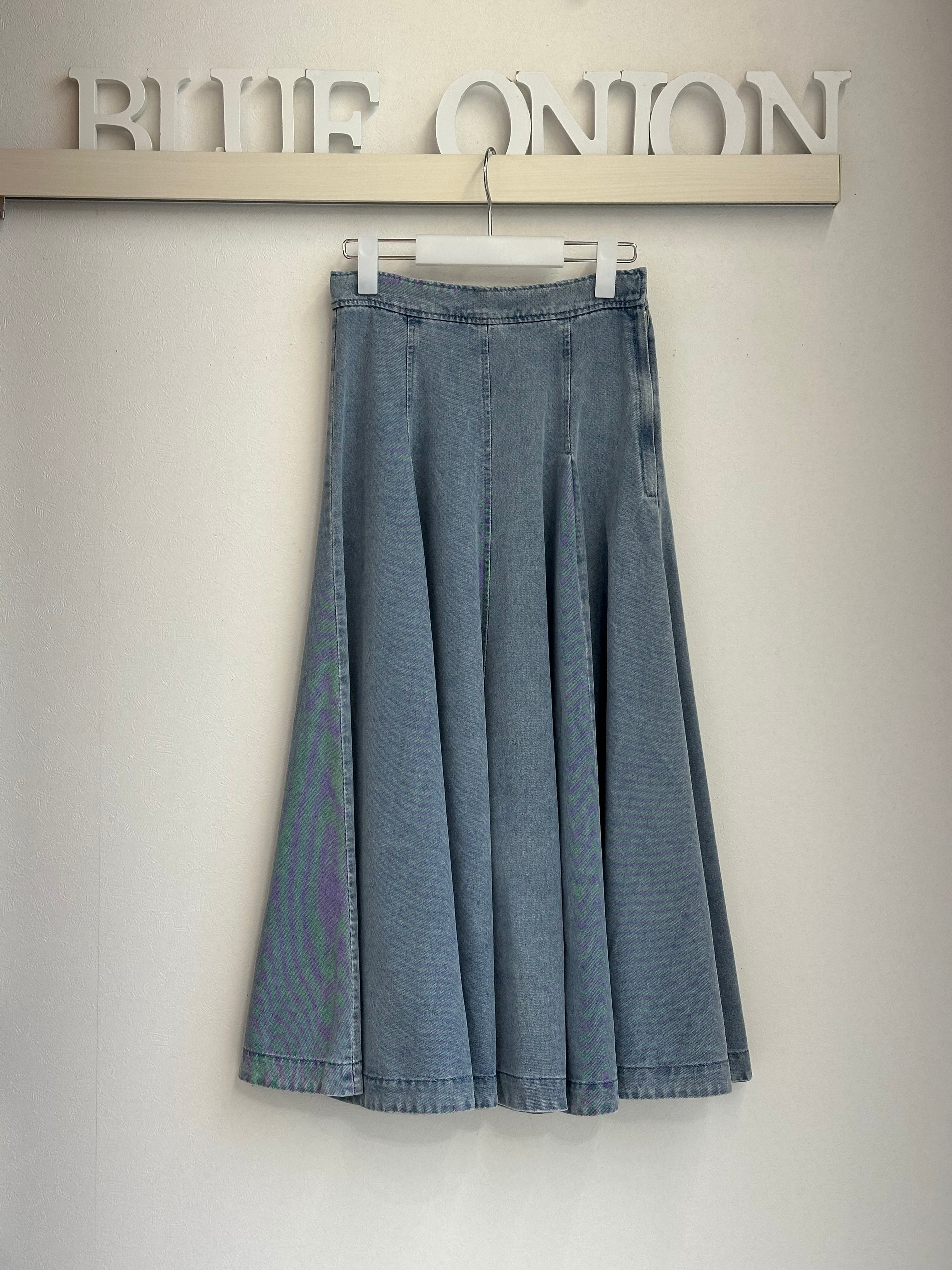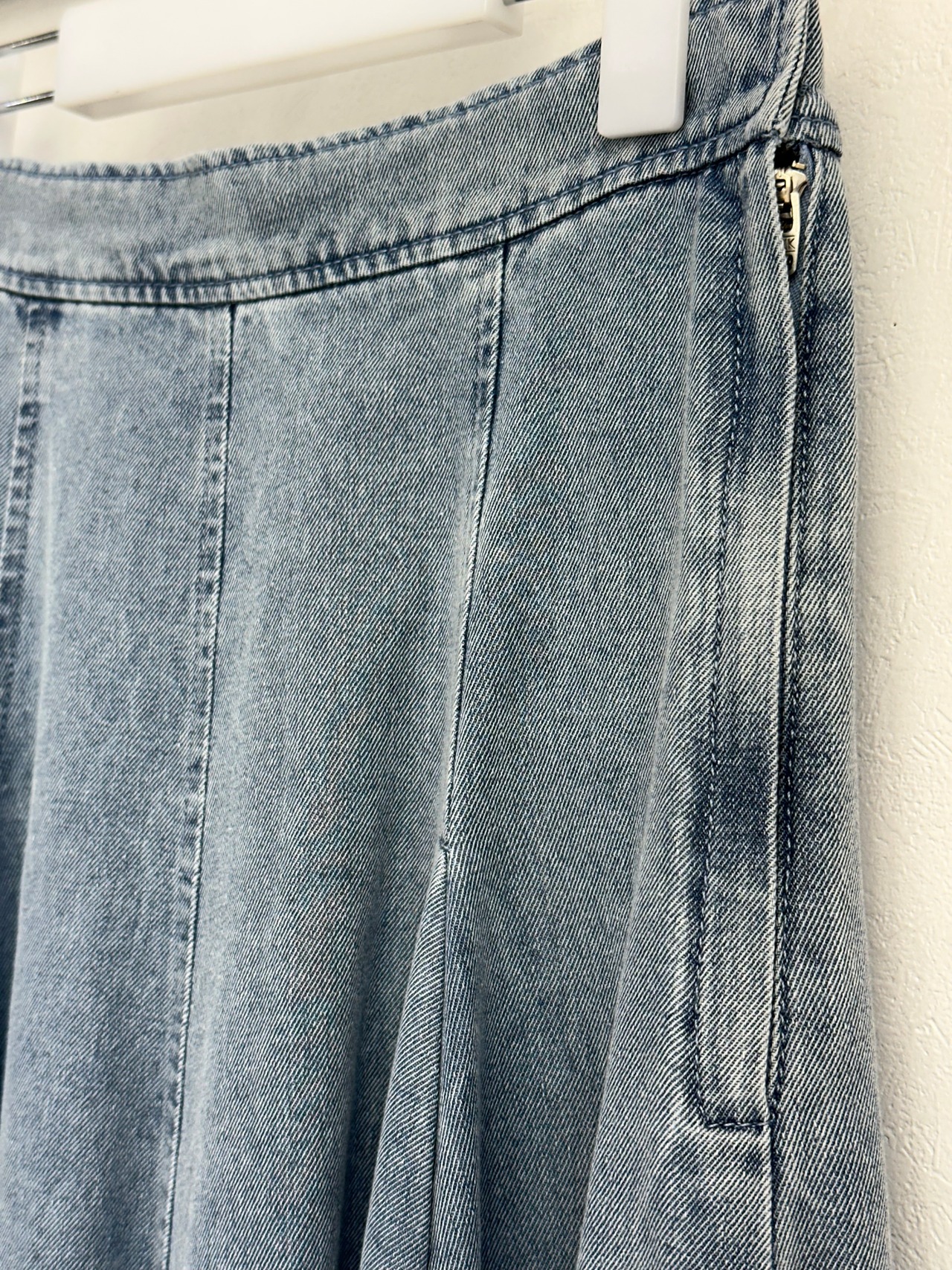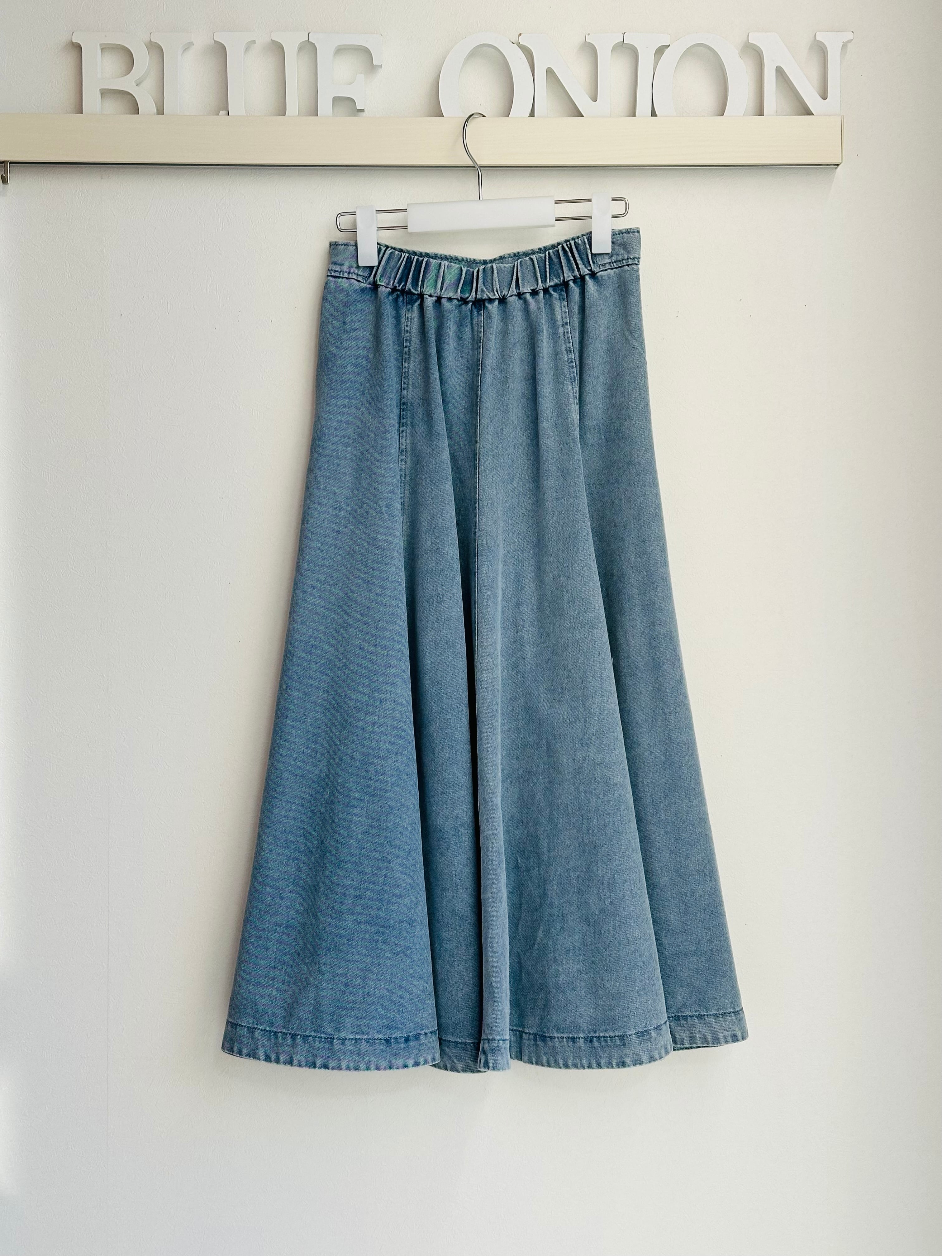 やわらかなデニム素材を使用した、動きのあるフレアシルエットが魅力のスカート。