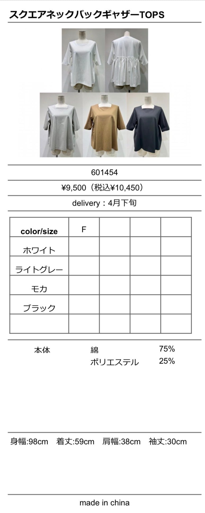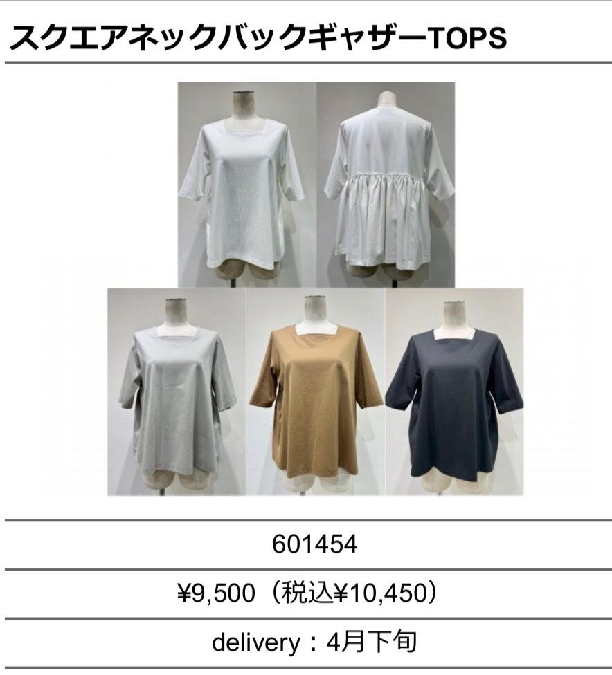 スクエアネックバックギャザーtops