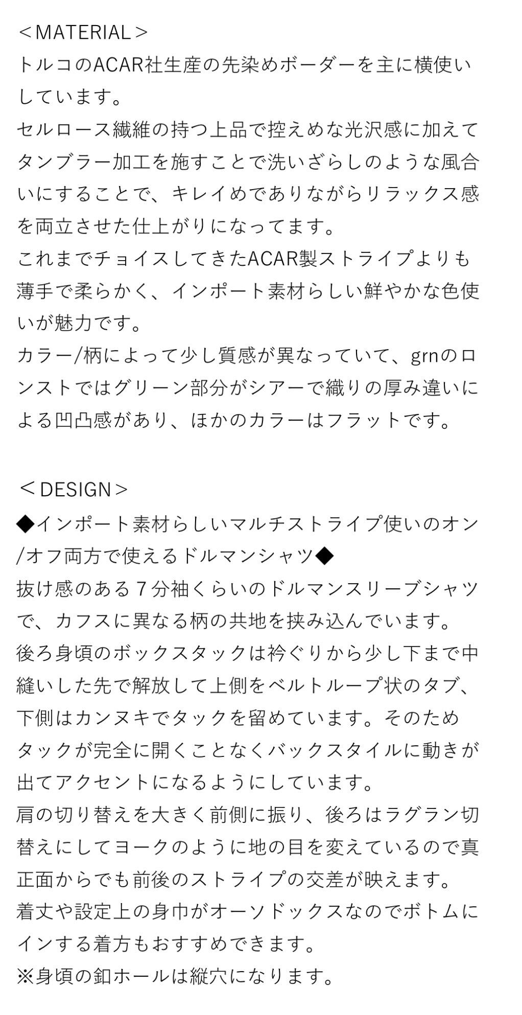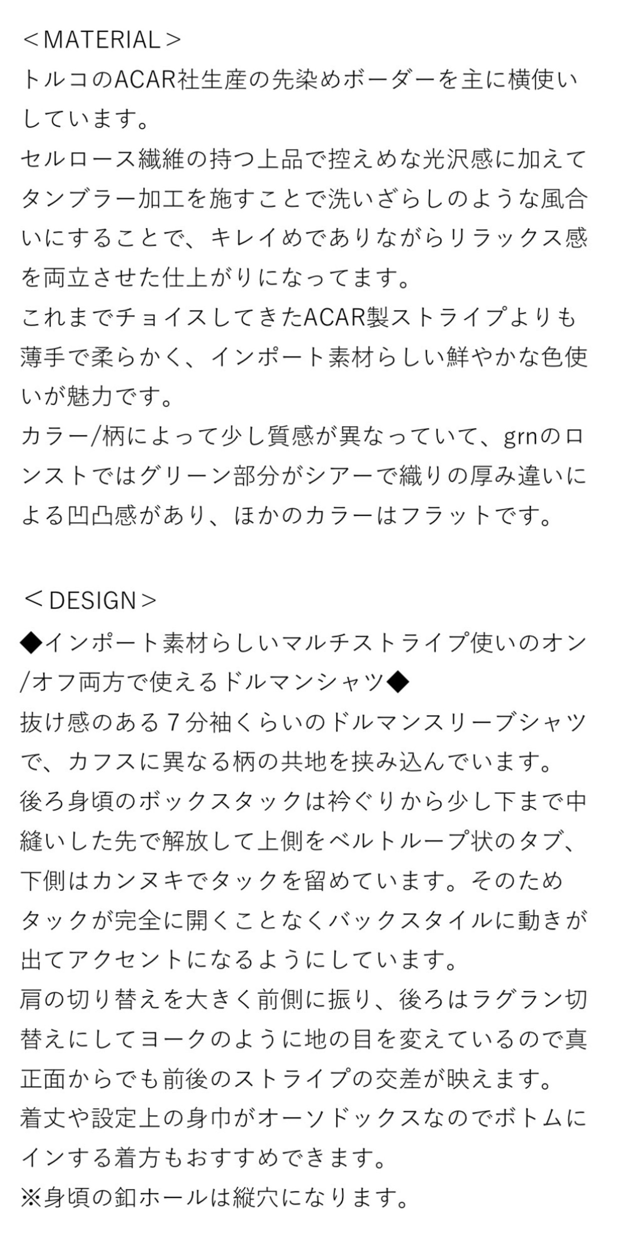 これまでチョイスしてきたACAR製ストライプよりも薄手で柔らかく、インポート素材らしい鮮やかな色使いが魅力です。