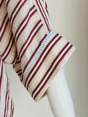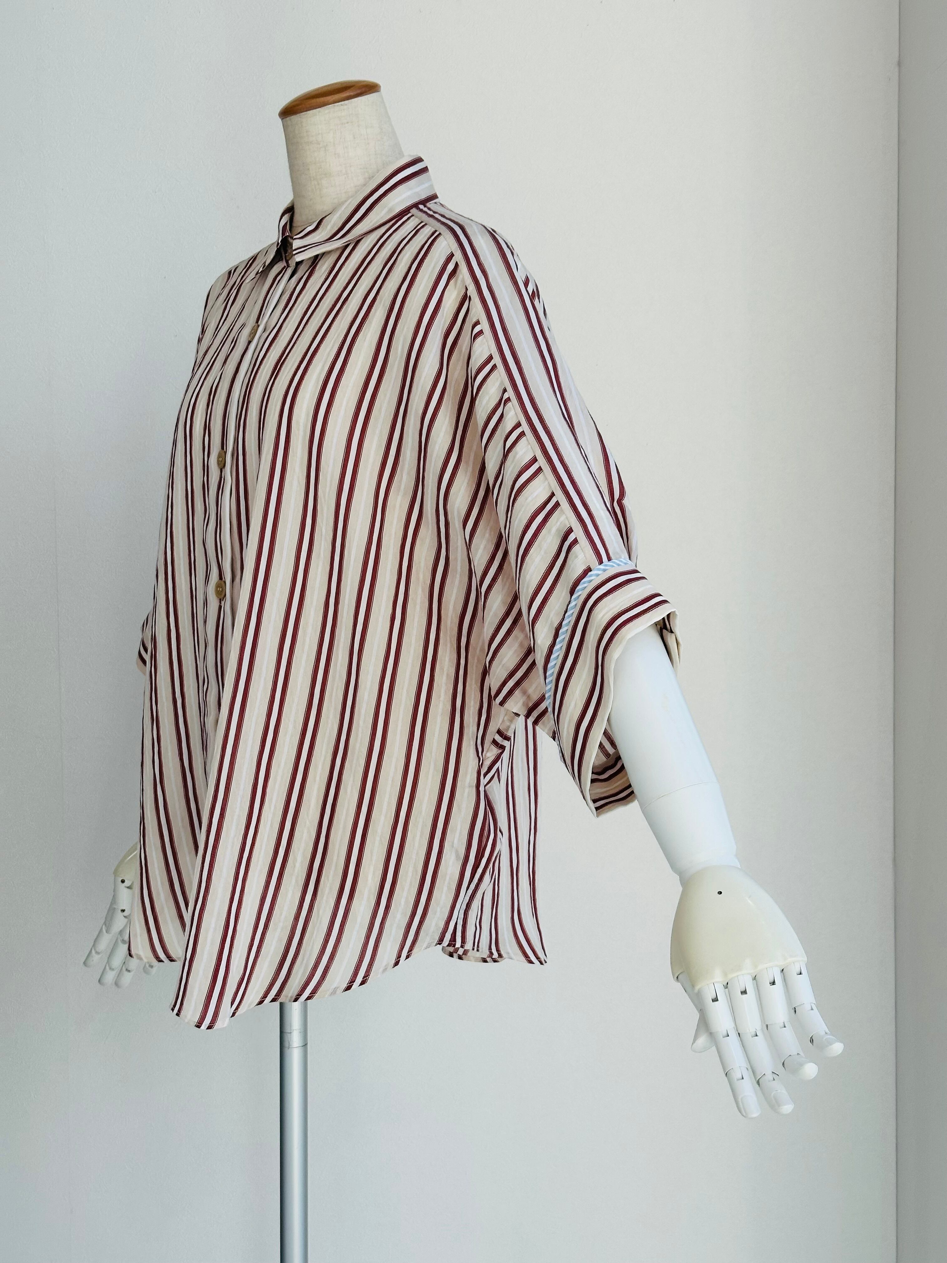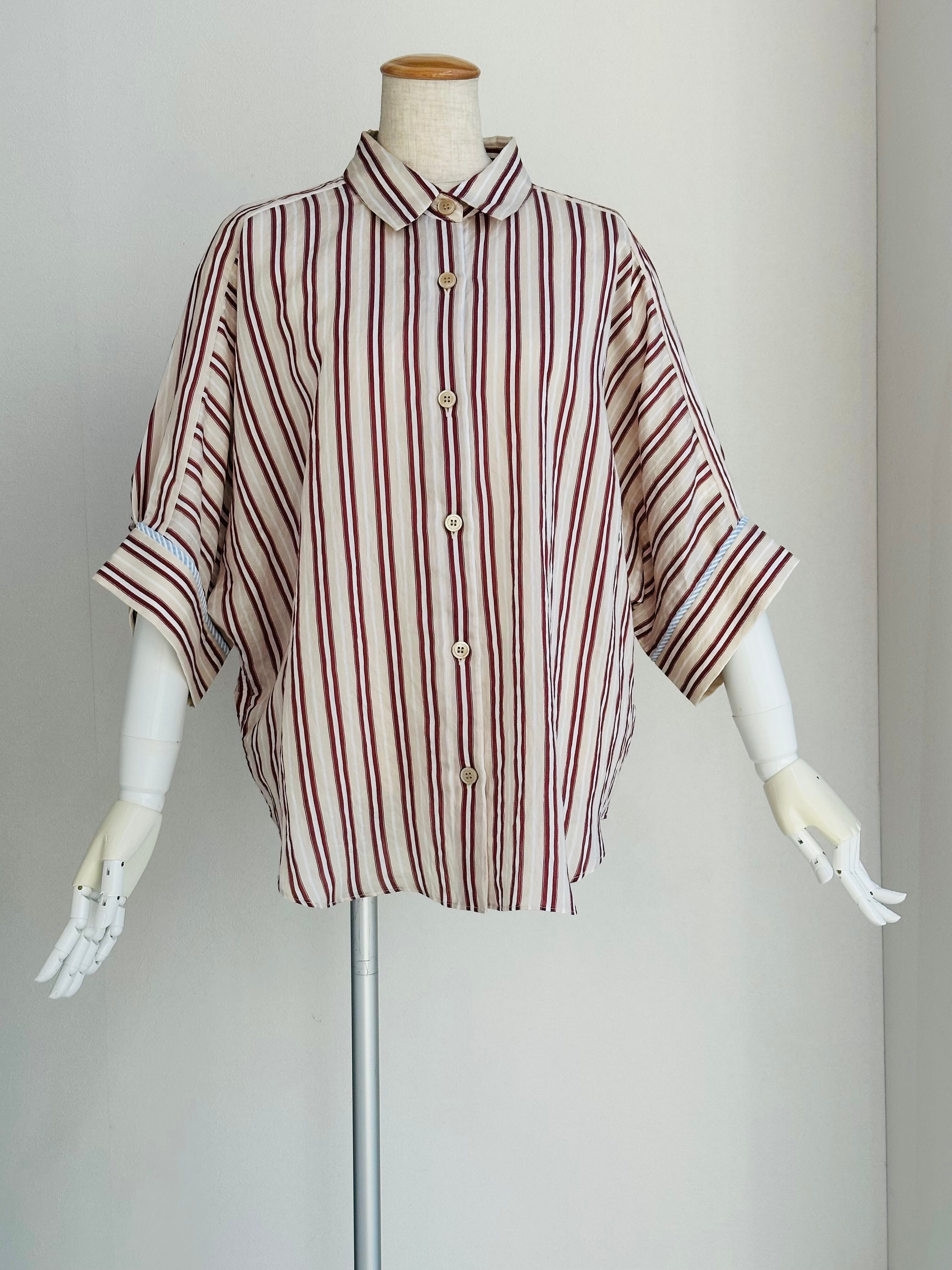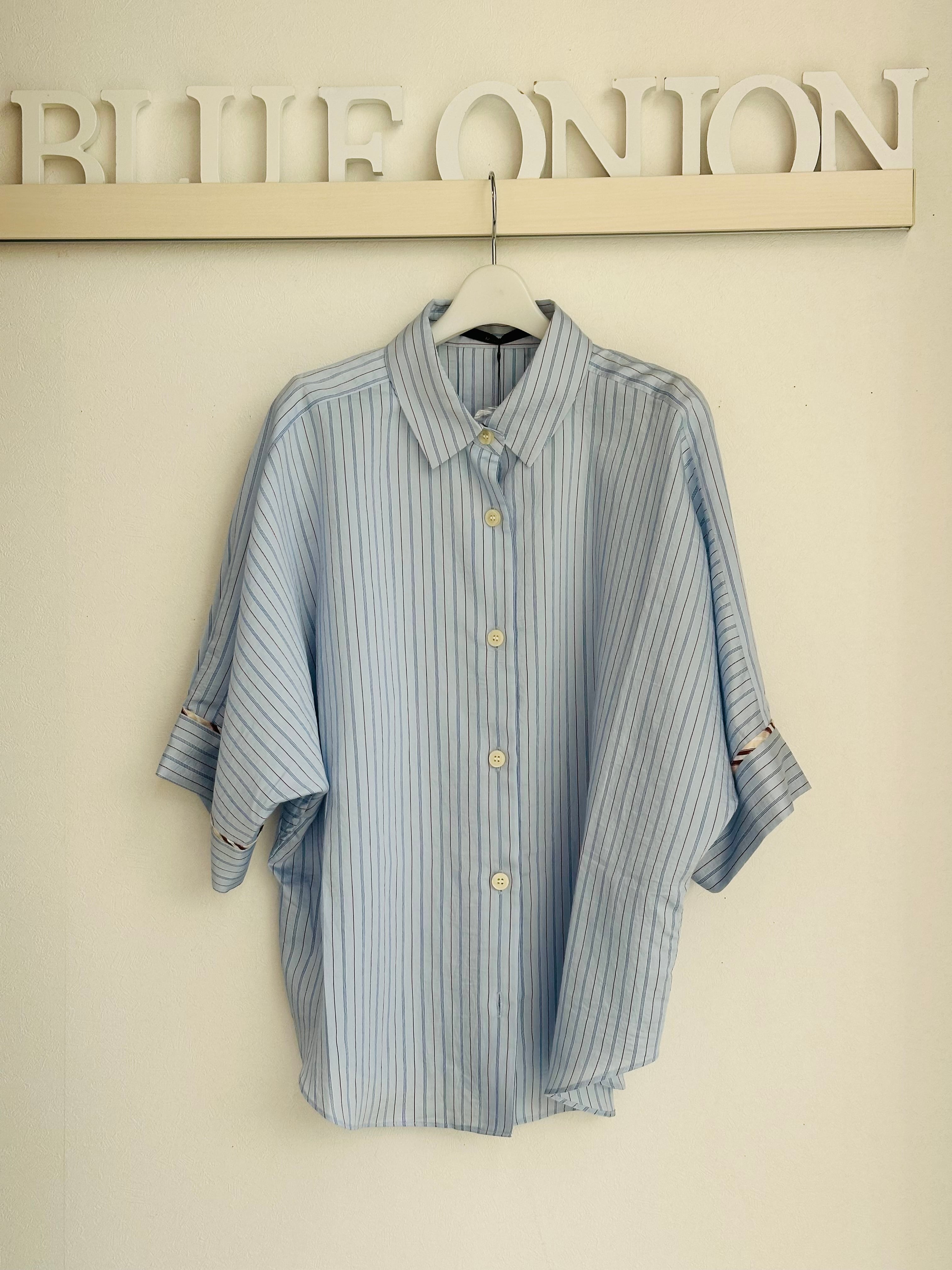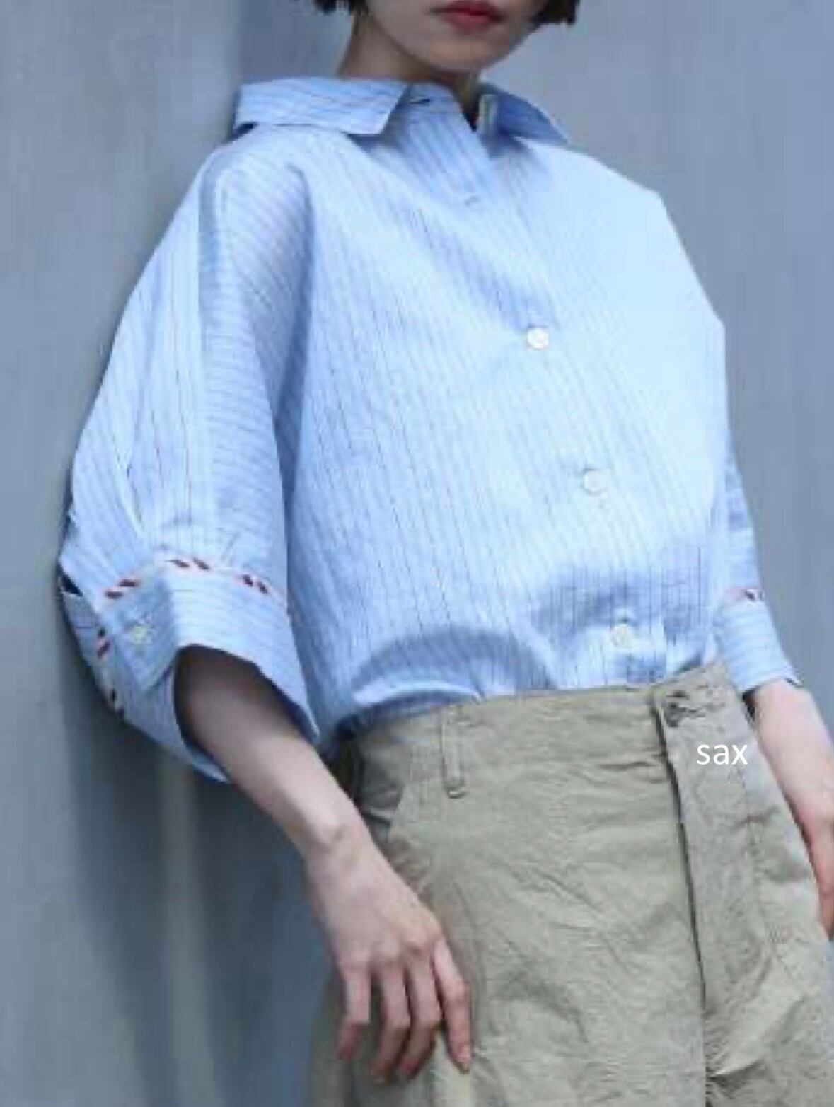 抜け感のある 7分袖くらいのドルマンスリーブシャツで、カフスに異なる柄の共地を挟み込んでいます。
