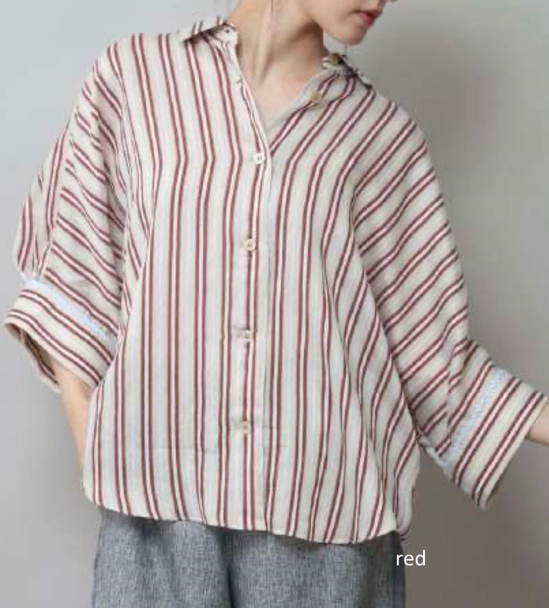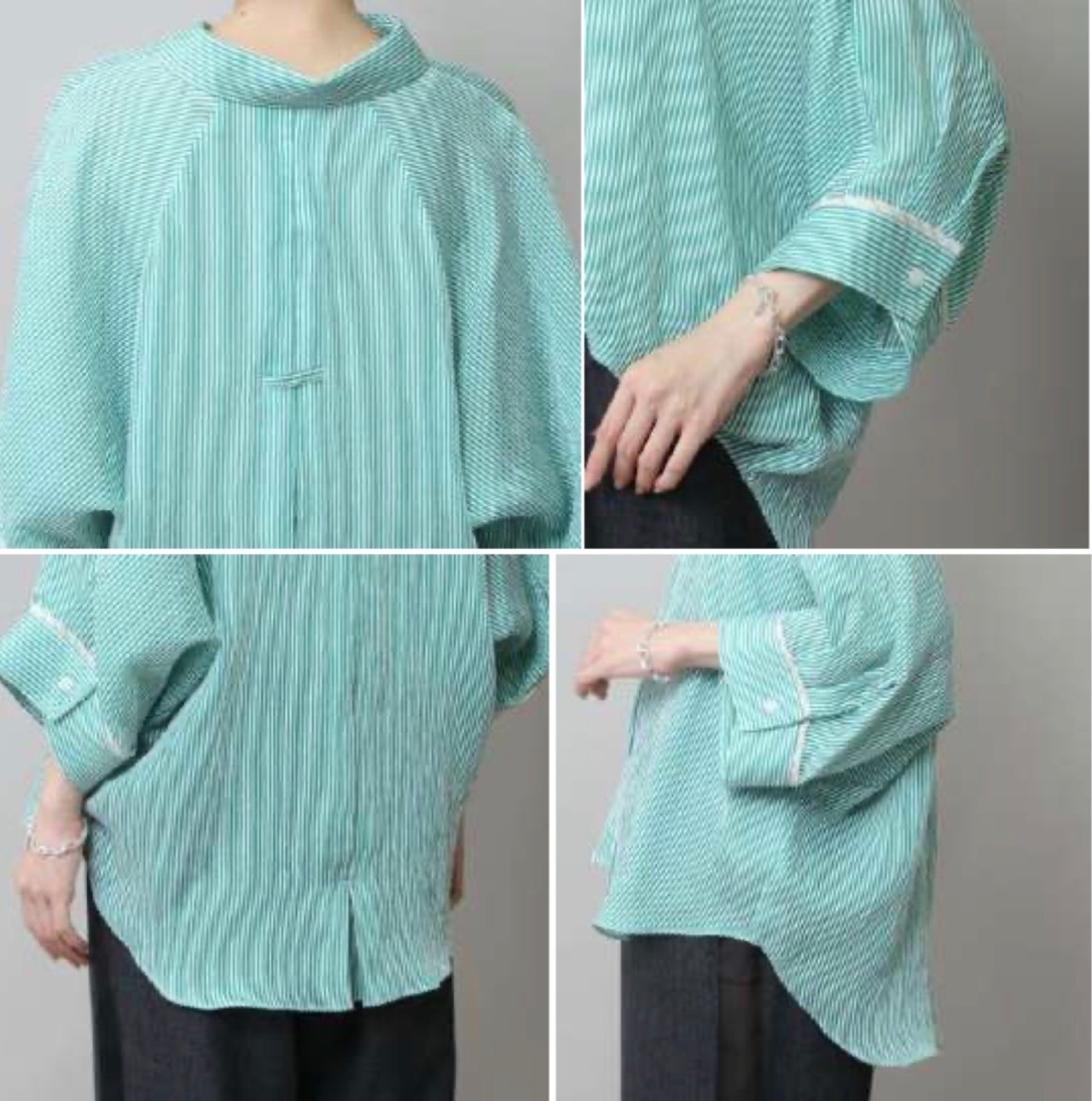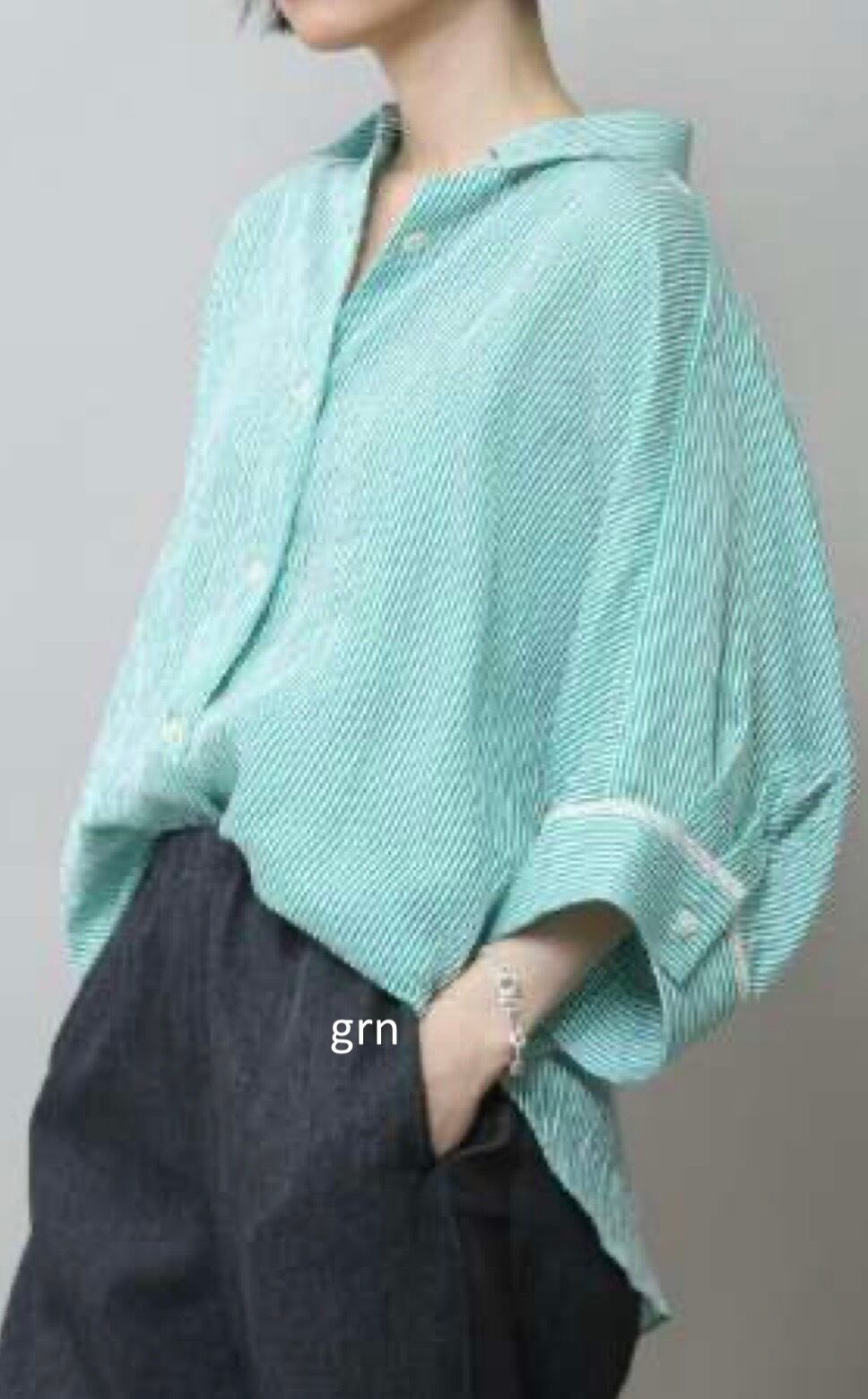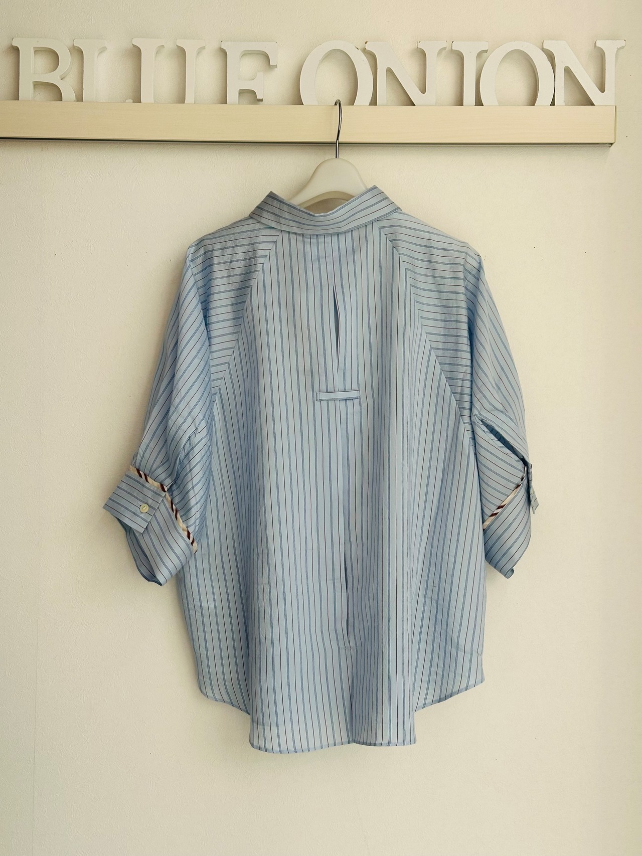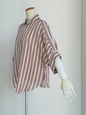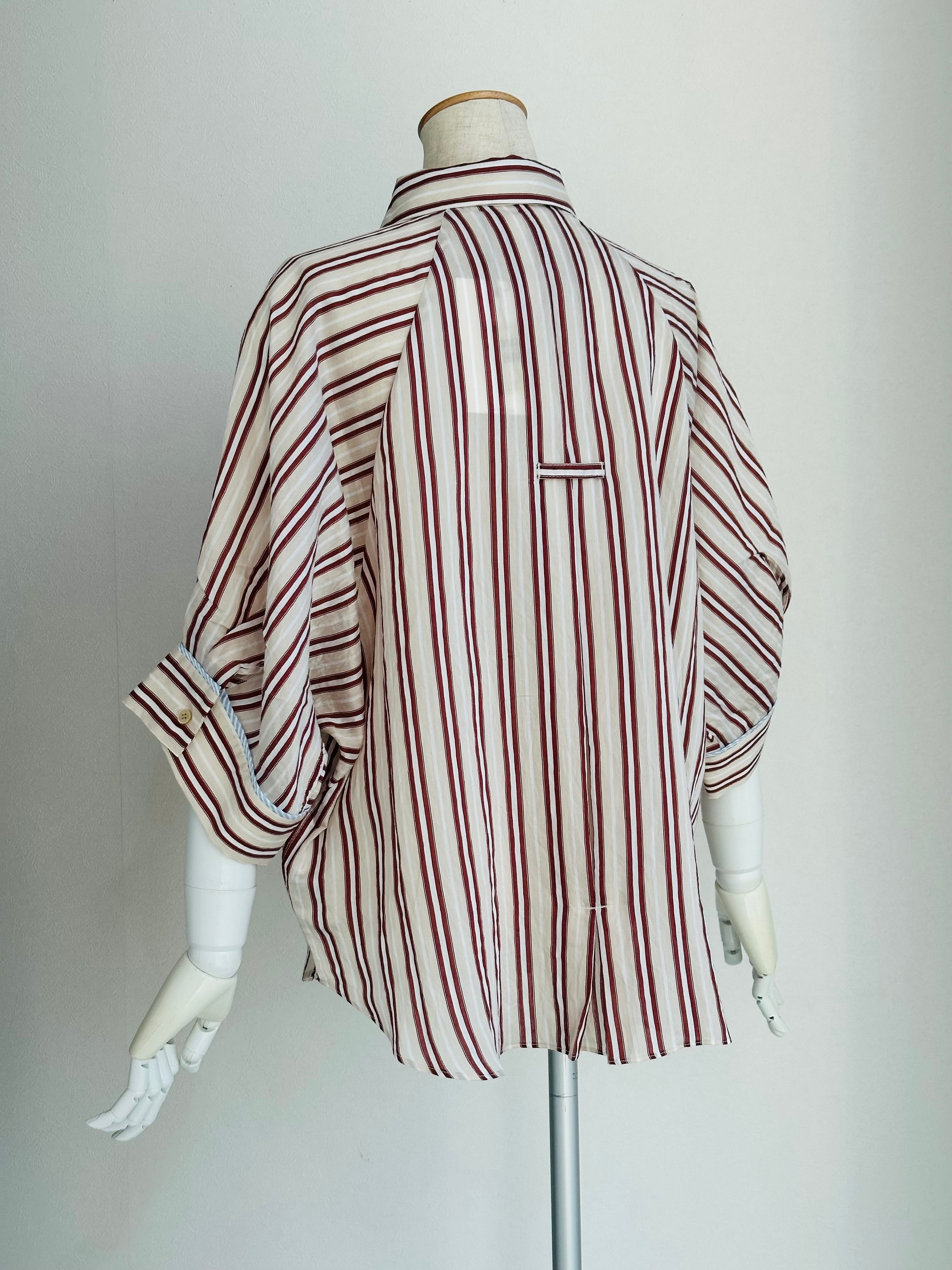 抜け感のある 7分袖くらいのドルマンスリーブシャツで、カフスに異なる柄の共地を挟み込んでいます。