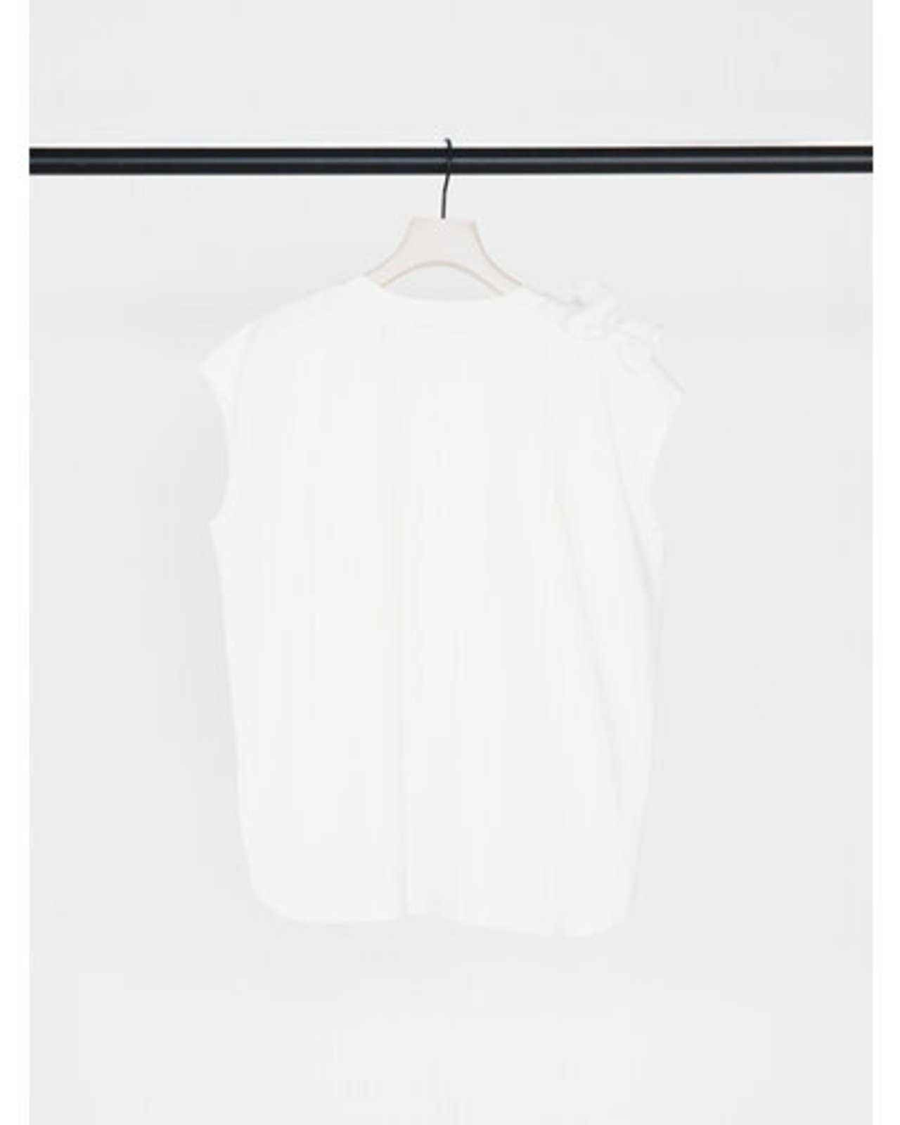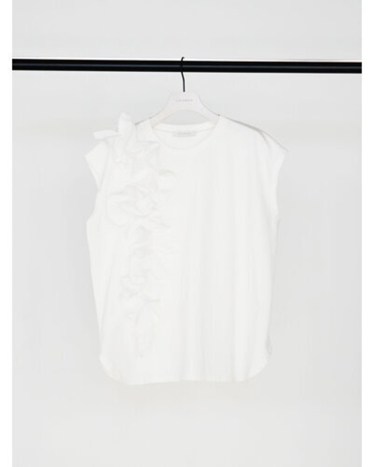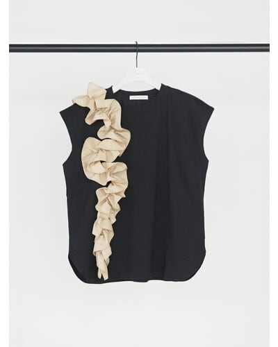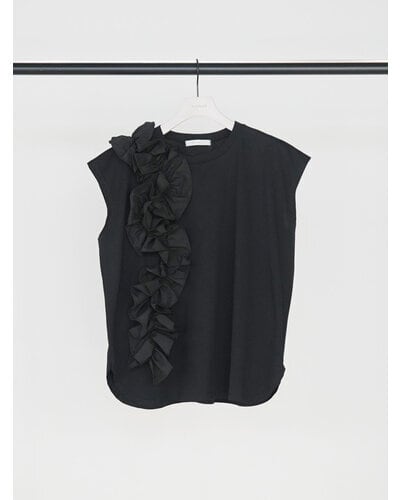 片側に流れるように重ねたフリルが、シンプルな身頃に奥行きと動きを生み出し、着るだけでスタイリングの主役になる一枚です。