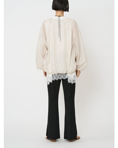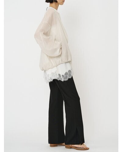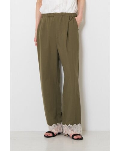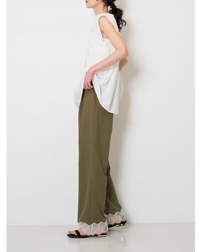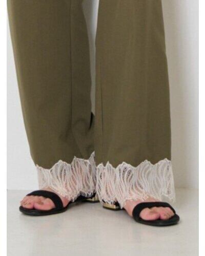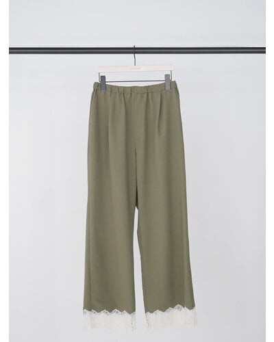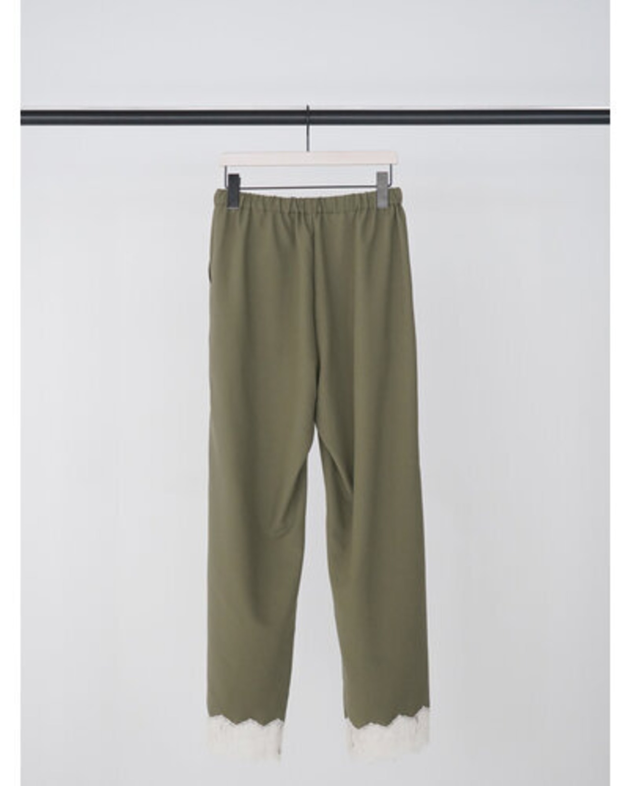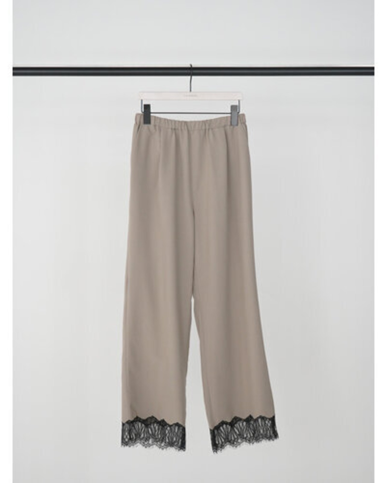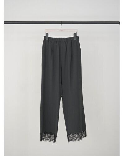 サテン素材のパンツに裾にレースを刺繍したイージーパンツ。