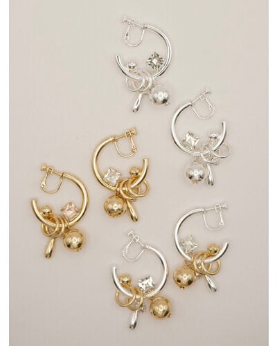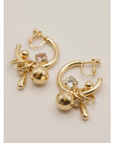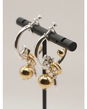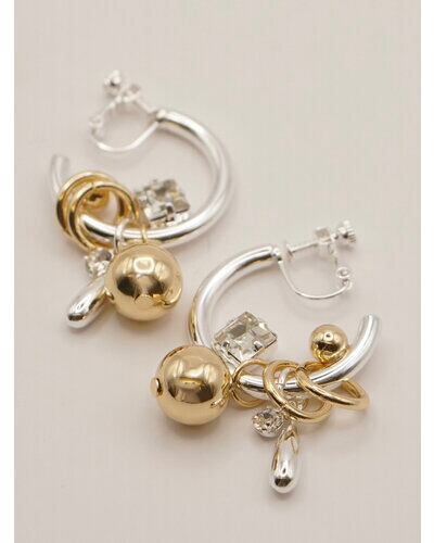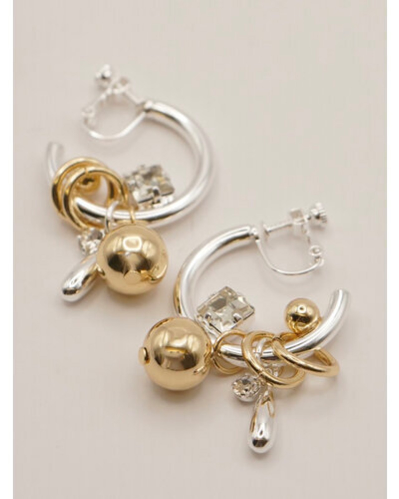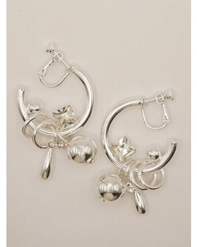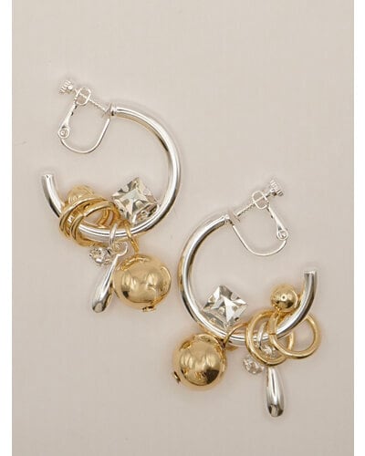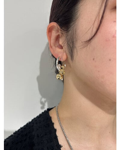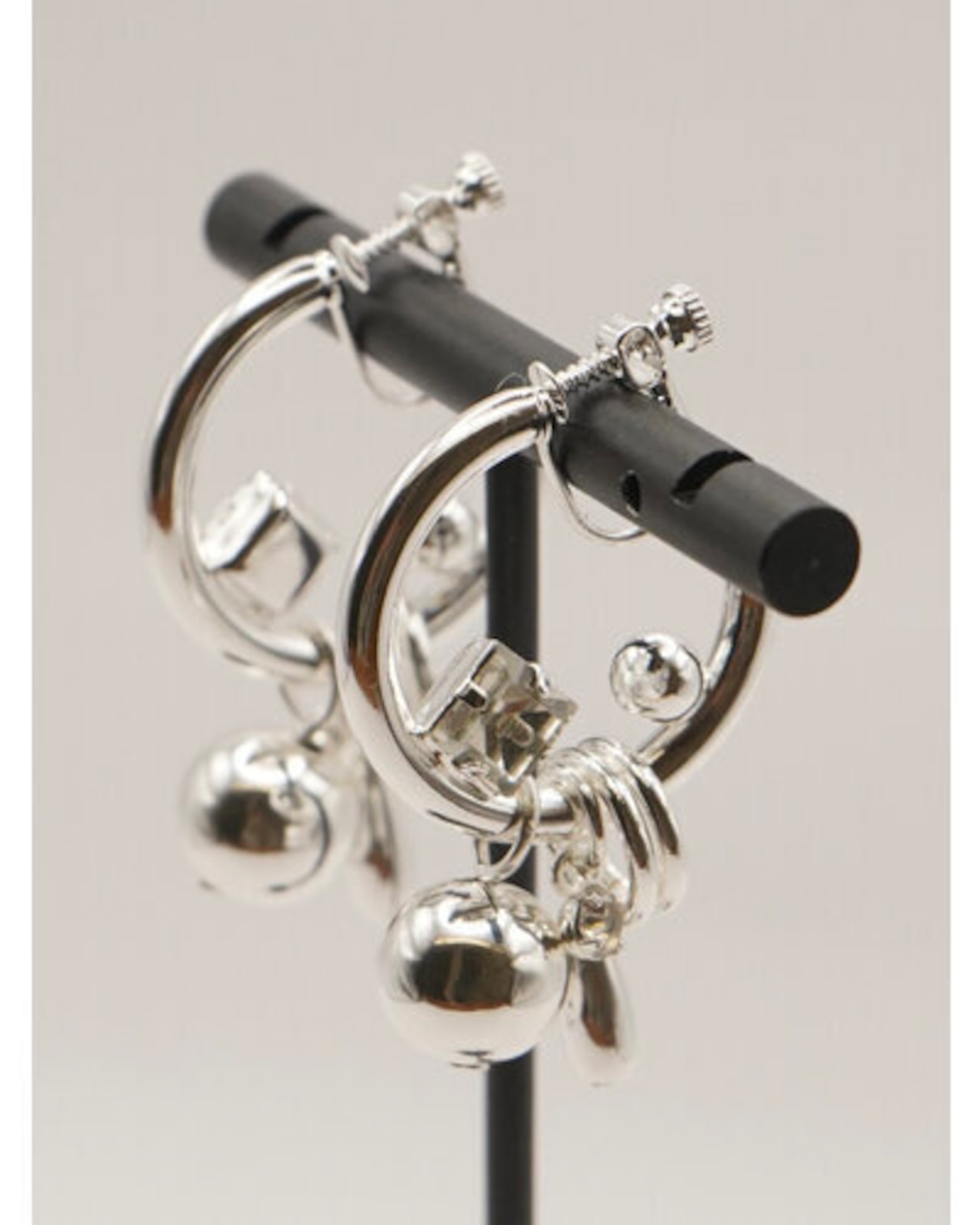 じゃらっとしたモチーフと程良いボリューム感が印象的な遊び心たっぷりのフープイヤリング。それぞれのパーツをバランスよく配置しつつ動きを活かしたデザインは、着けるだけで一際目立つ主役級イヤリングとなっております。カラーはシルバー、ゴールドの他に、SV×GDのミックスもご用意いたしました。同型でピアスもご用意いたしております。