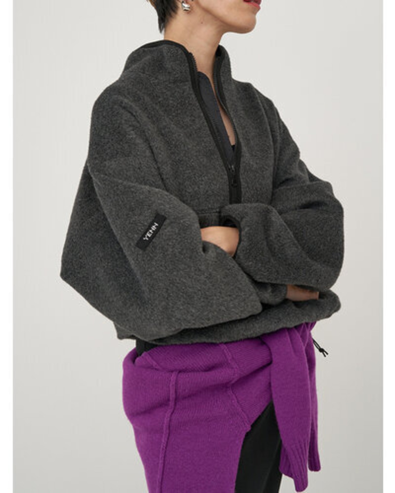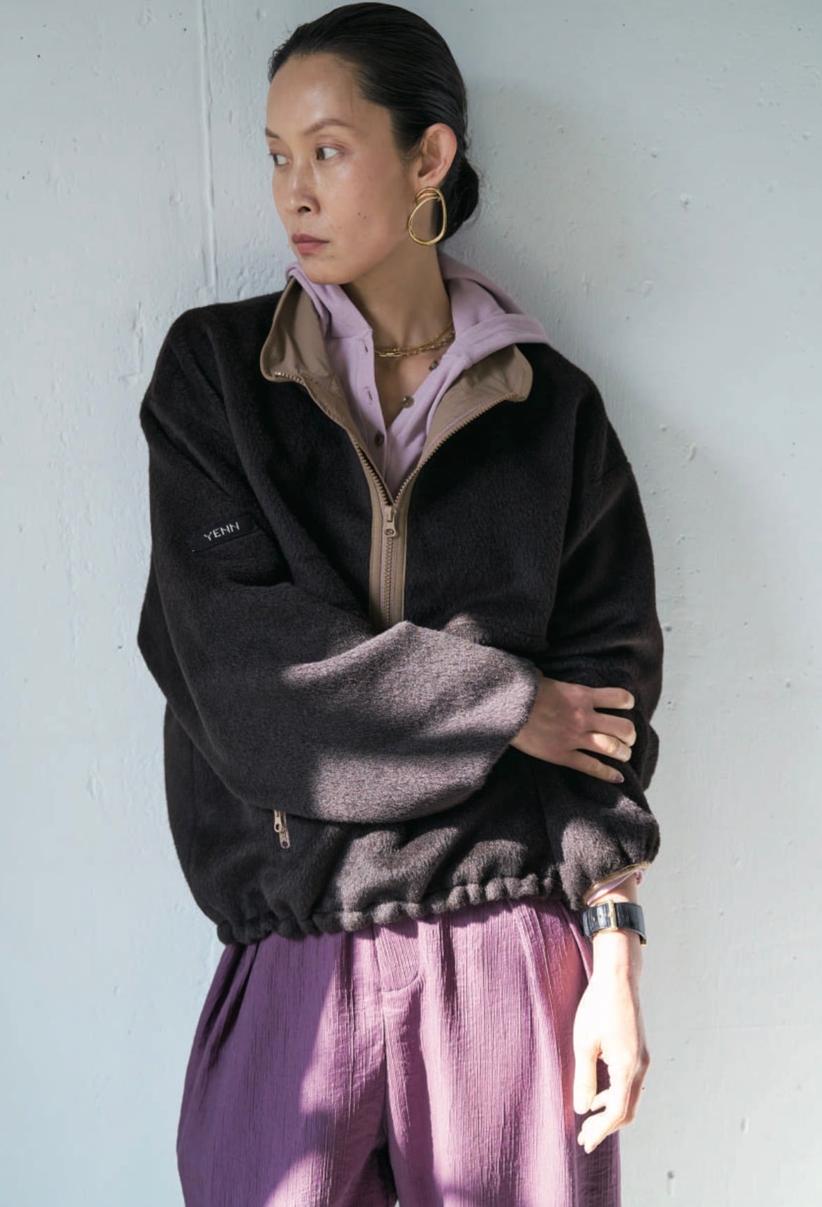 シャギー素材を使用することで、着膨れしにくくカジュアルになりすぎない大人のカジュアルアウターに。配色のトリミングテープは柔らかくストレッチのある素材を使用、実用性と着心地にこだわりました。 HENRY NECK LONG TEEとのレイヤードや、襟ぐりのあいたインナーと合わせてあえて首元を見せるスタイリングも女性らしさがプラスできておすすめです。右袖に施した“YENN”ロゴテープがポイントです。