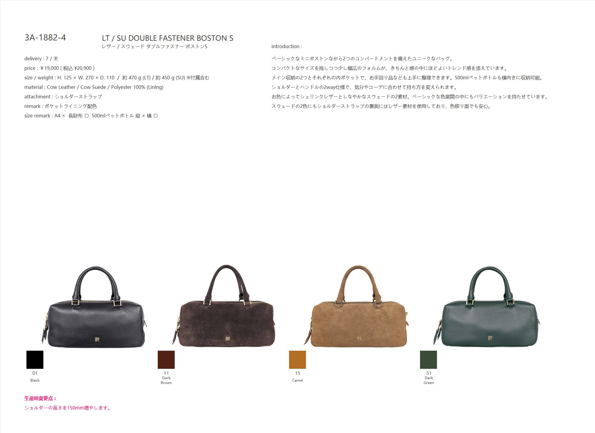 お色によってシュリンクレザーとしなやかなスウェードの2素材。ベーシックな色展開の中にもバリエーションを持たせています。