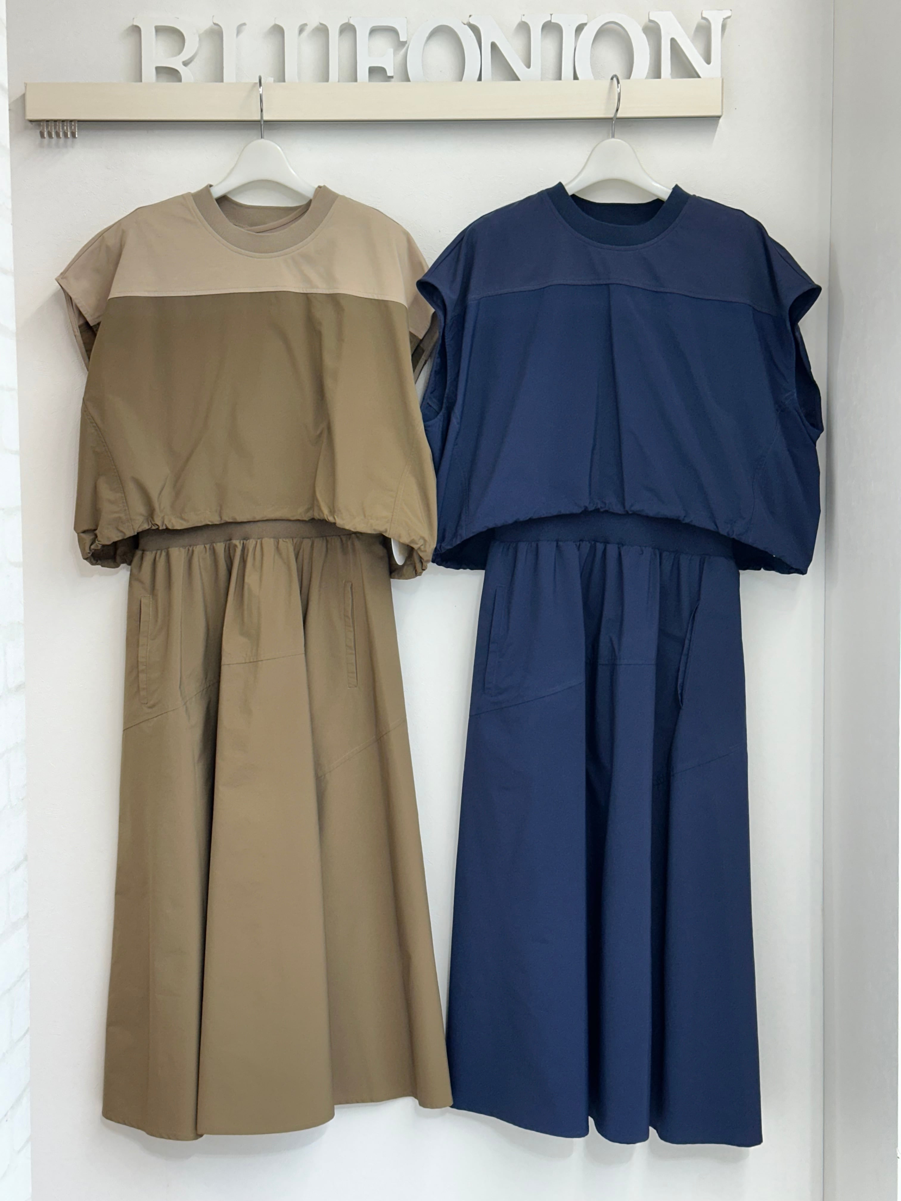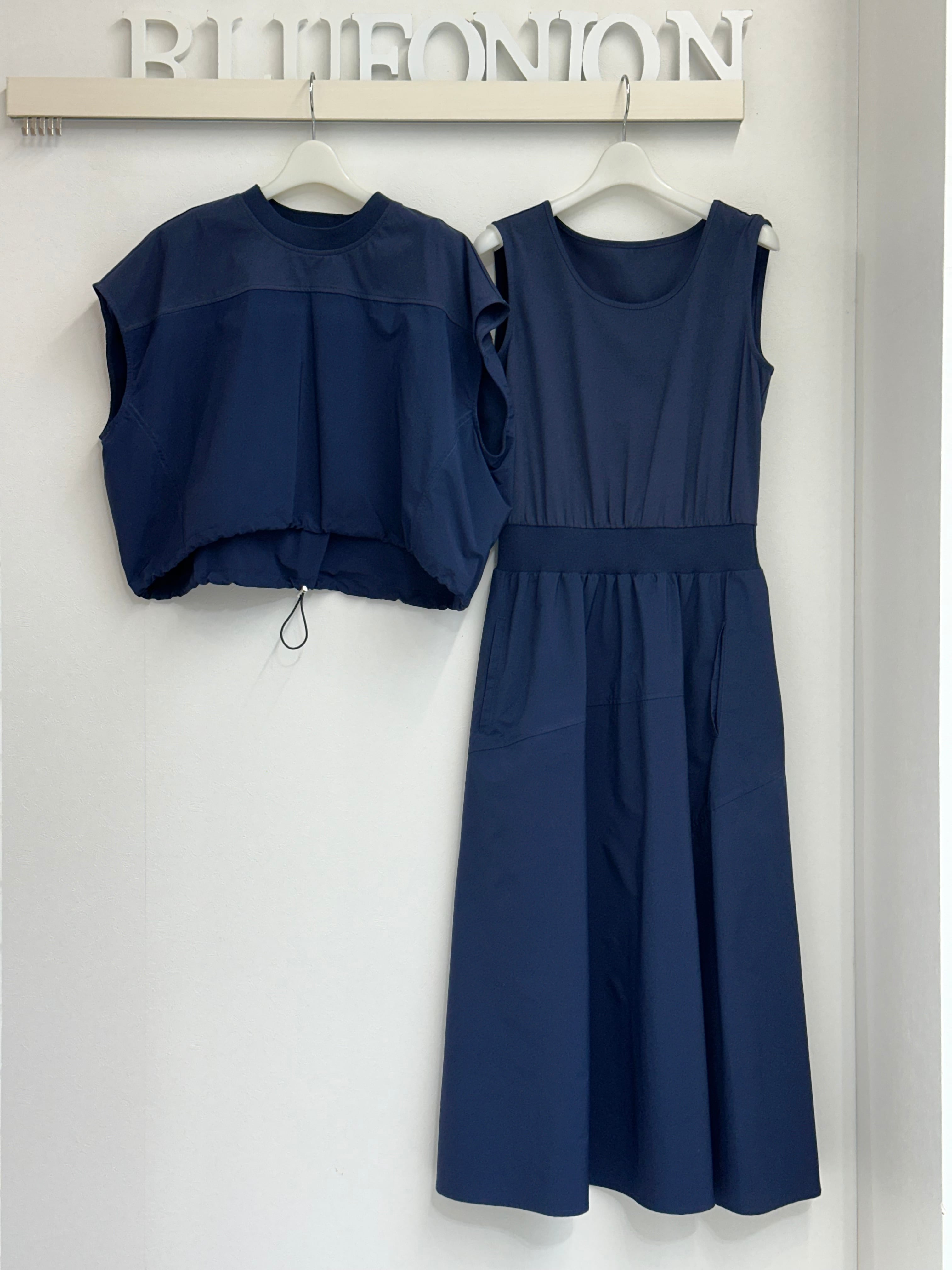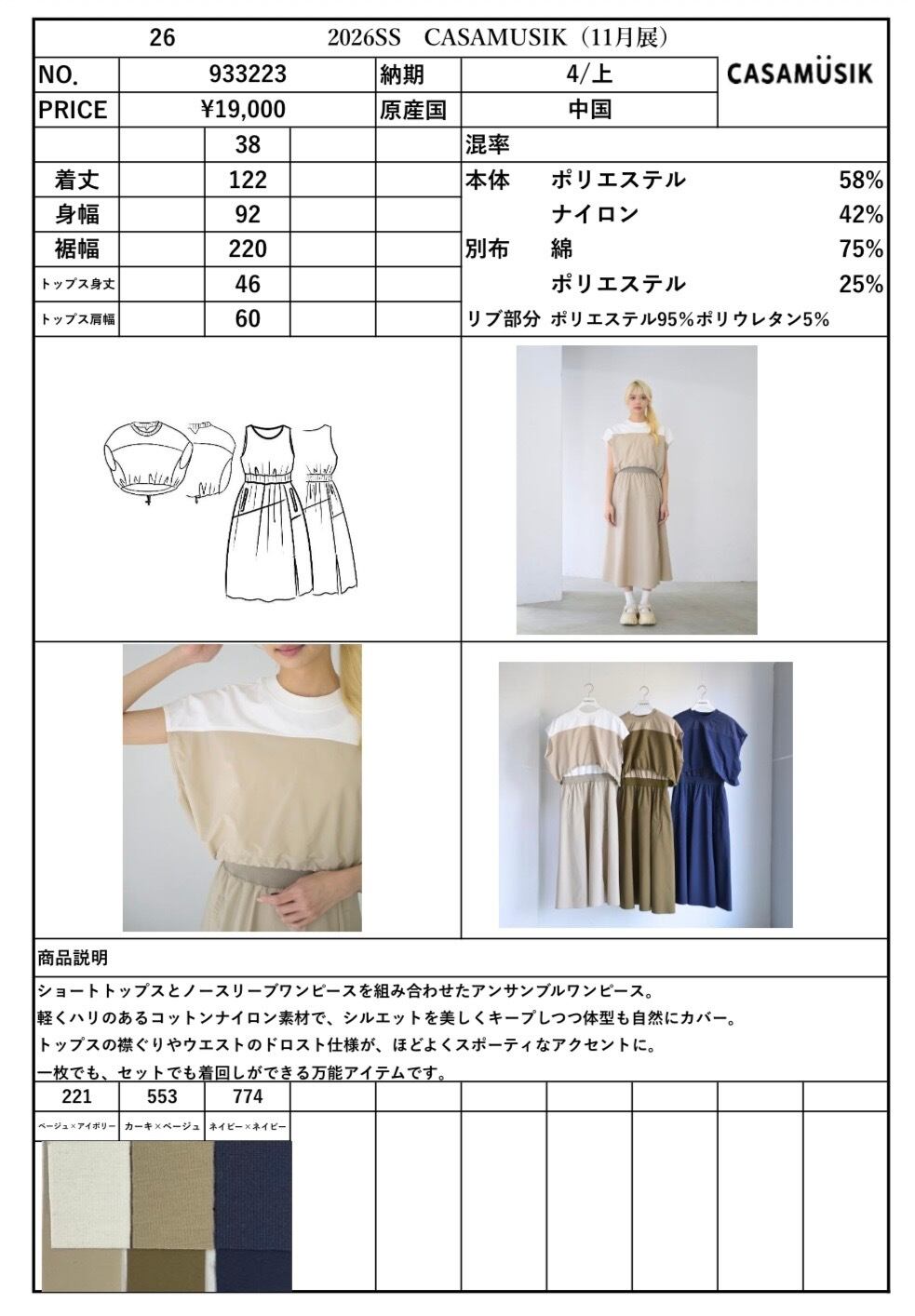 ショートトップスとノースリーブワンピースを組み合わせたアンサンブルワンピース。