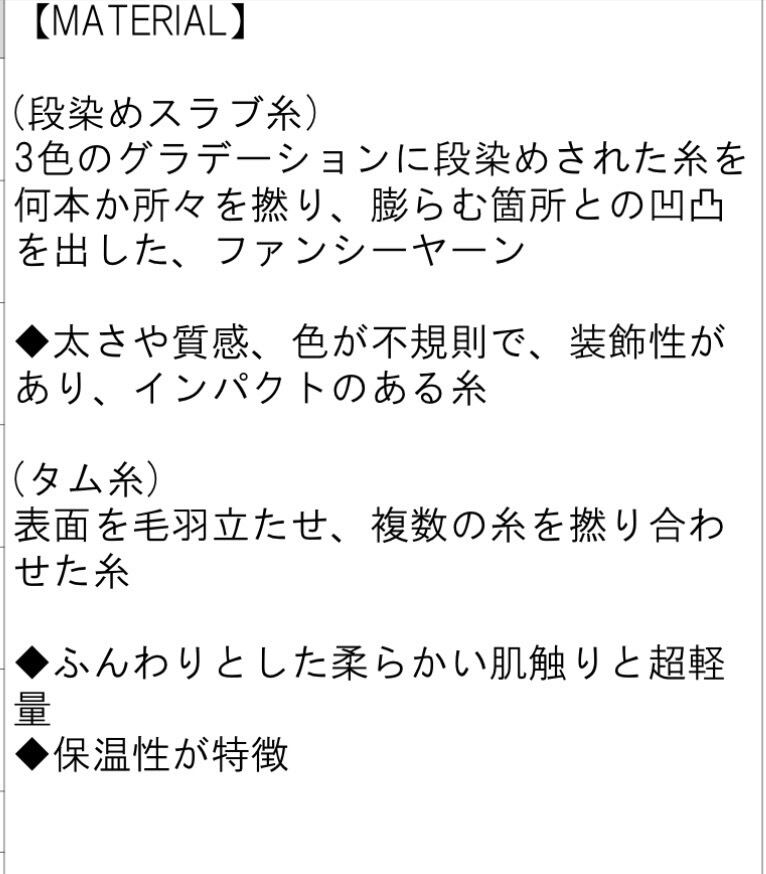 ◆段染めスラブ糸を1本、タム糸2色2本をミックスして、縦柄にも柄を組み合わせて編み上げた表情豊かな質感がポイント